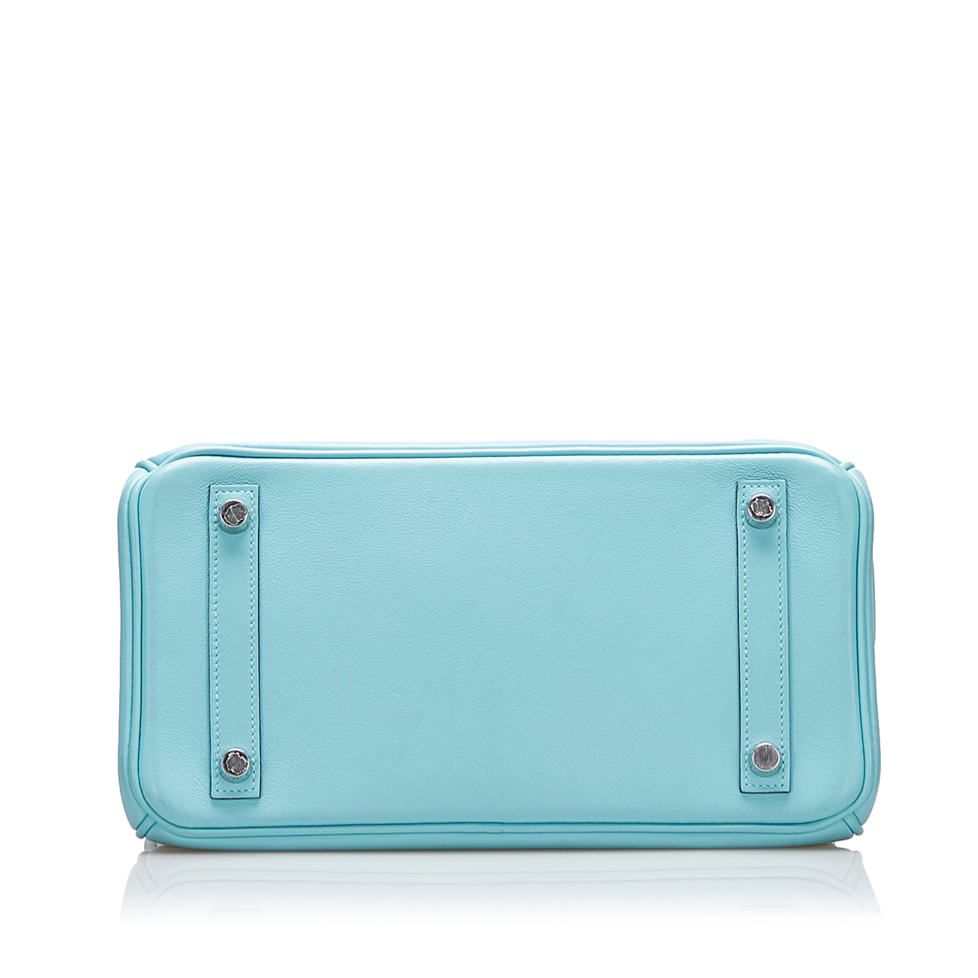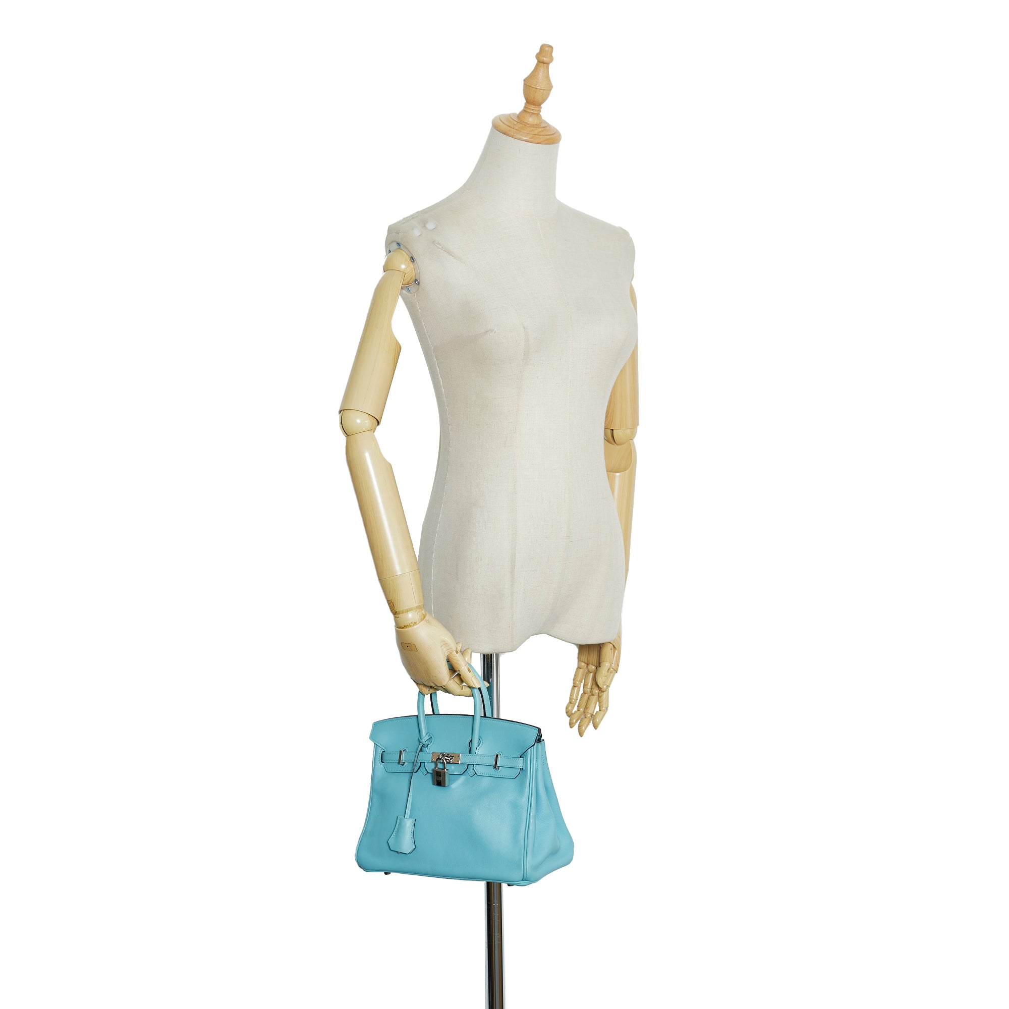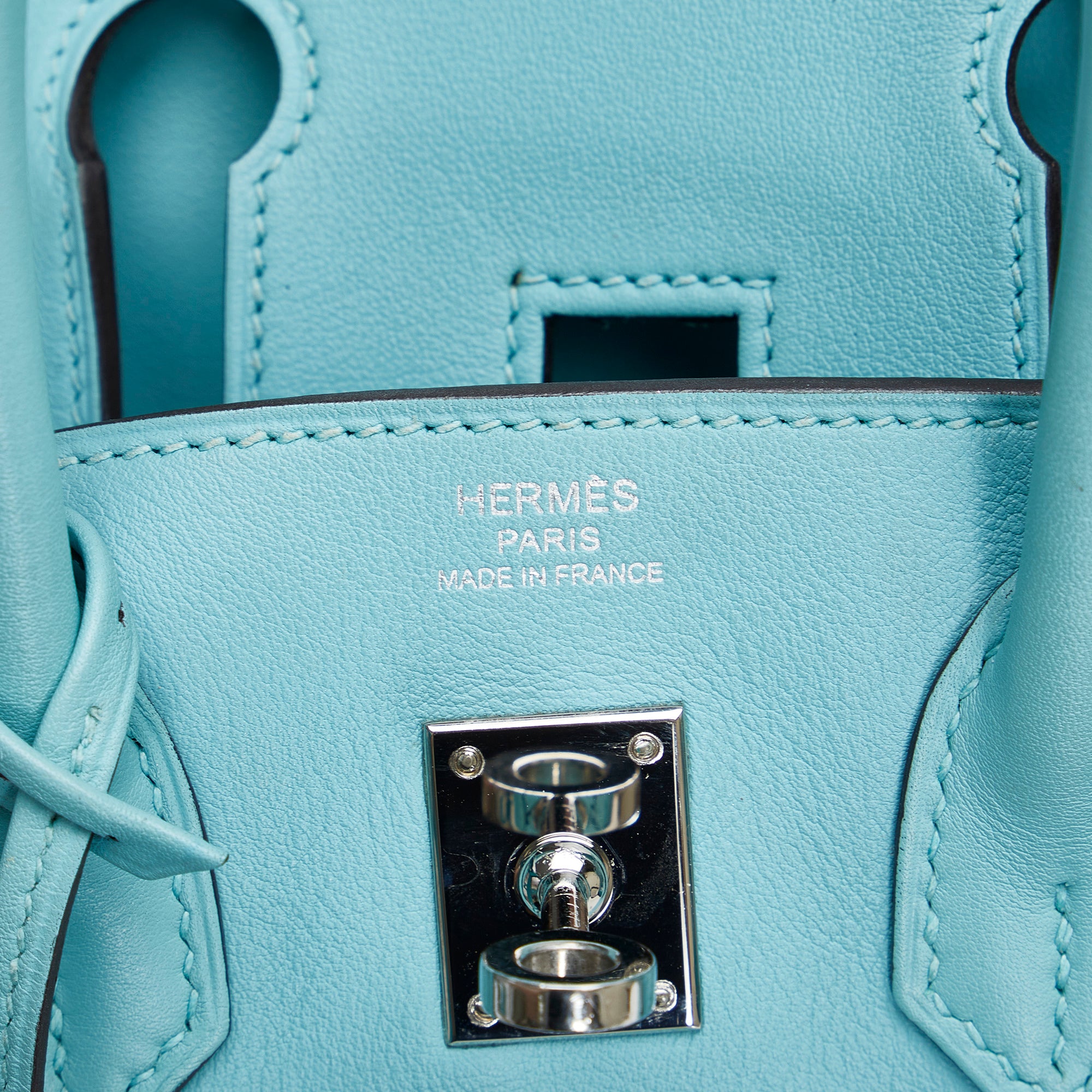 The Birkin 25 features a Swift leather body in Blue Atoll color, rolled leather handles, a front flap with turn-lock closure, silver hardware, and interior zip and slip pockets. Inclusion: Dust bag. Retail Price: 28000.00