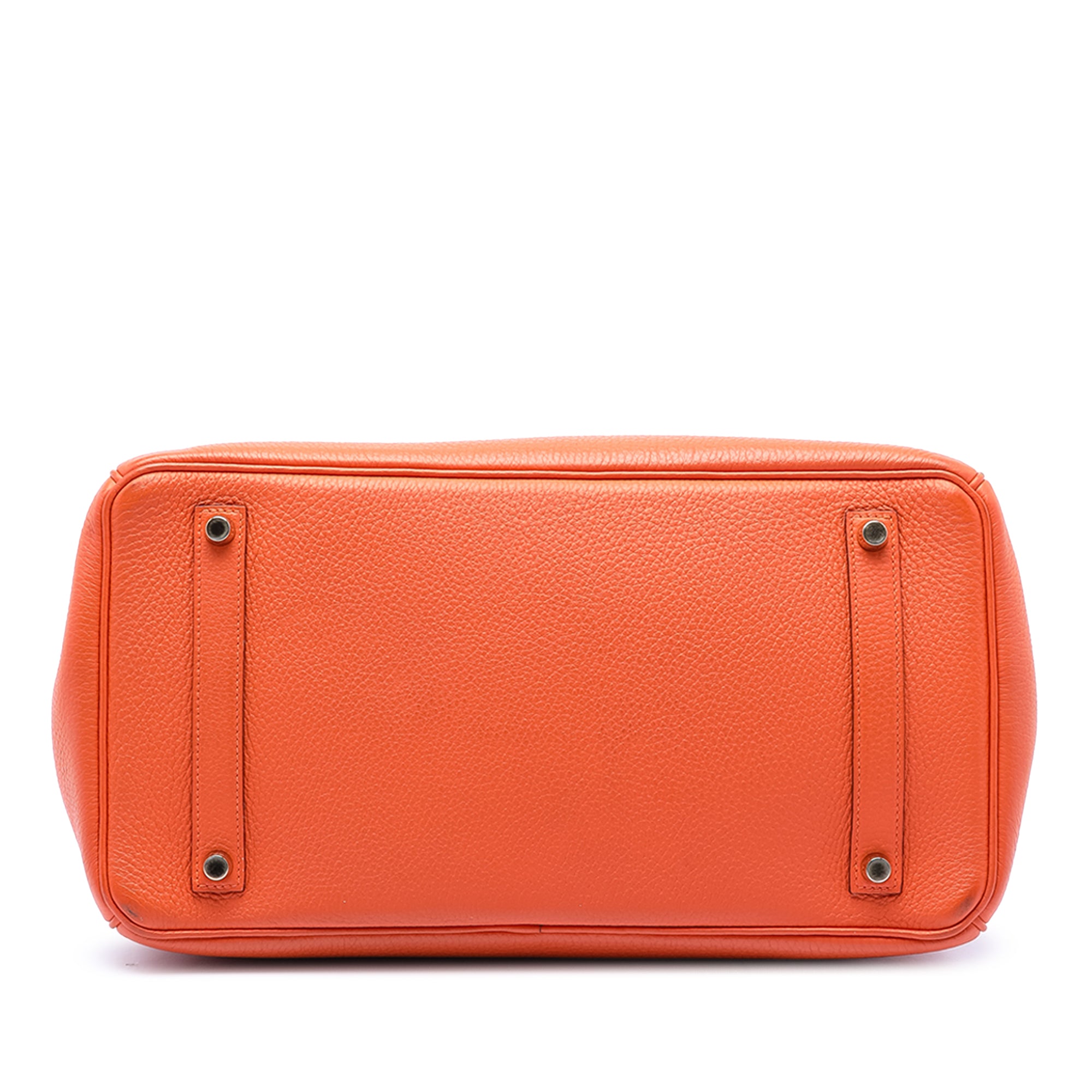 This Birkin 35 features a Clemence leather body in Orange Poppy color, rolled leather handles, a front flap with a strap and turn lock closure, and interior zip and slip pockets. Retail Price: 18000.00