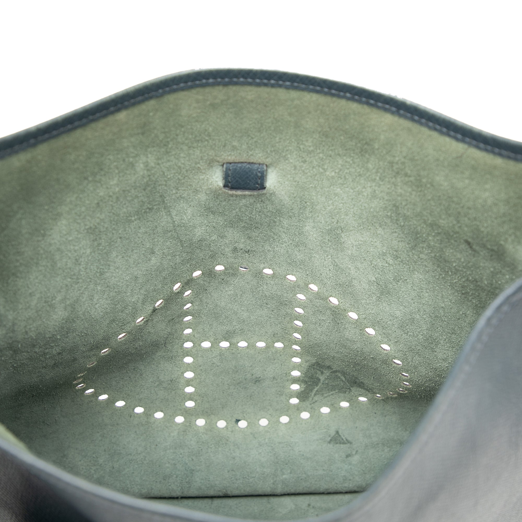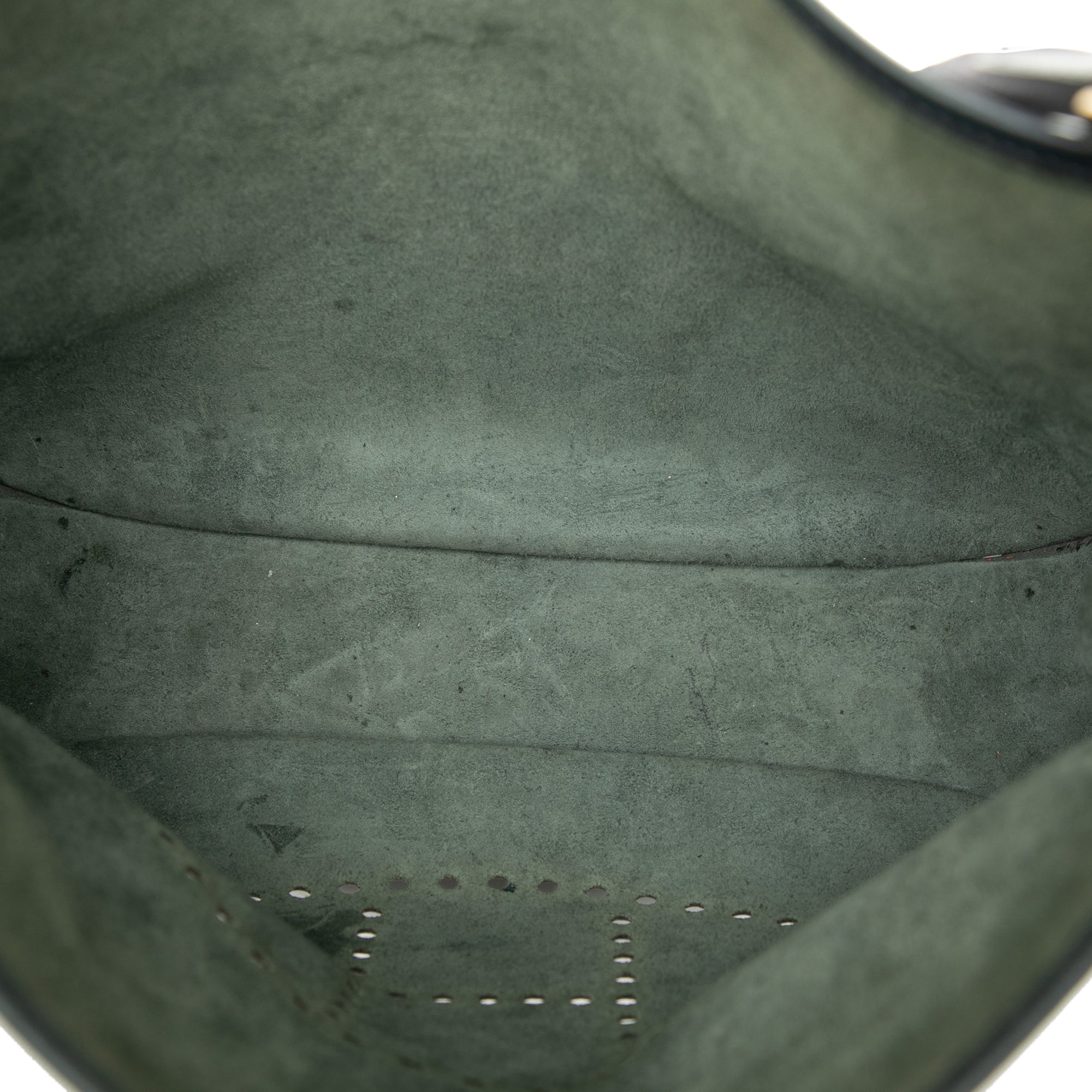 This Evelyne GM features a Clemence leather body in Caban color, a flat canvas strap, and an open top with a strap closure. Retail Price: 4500.00