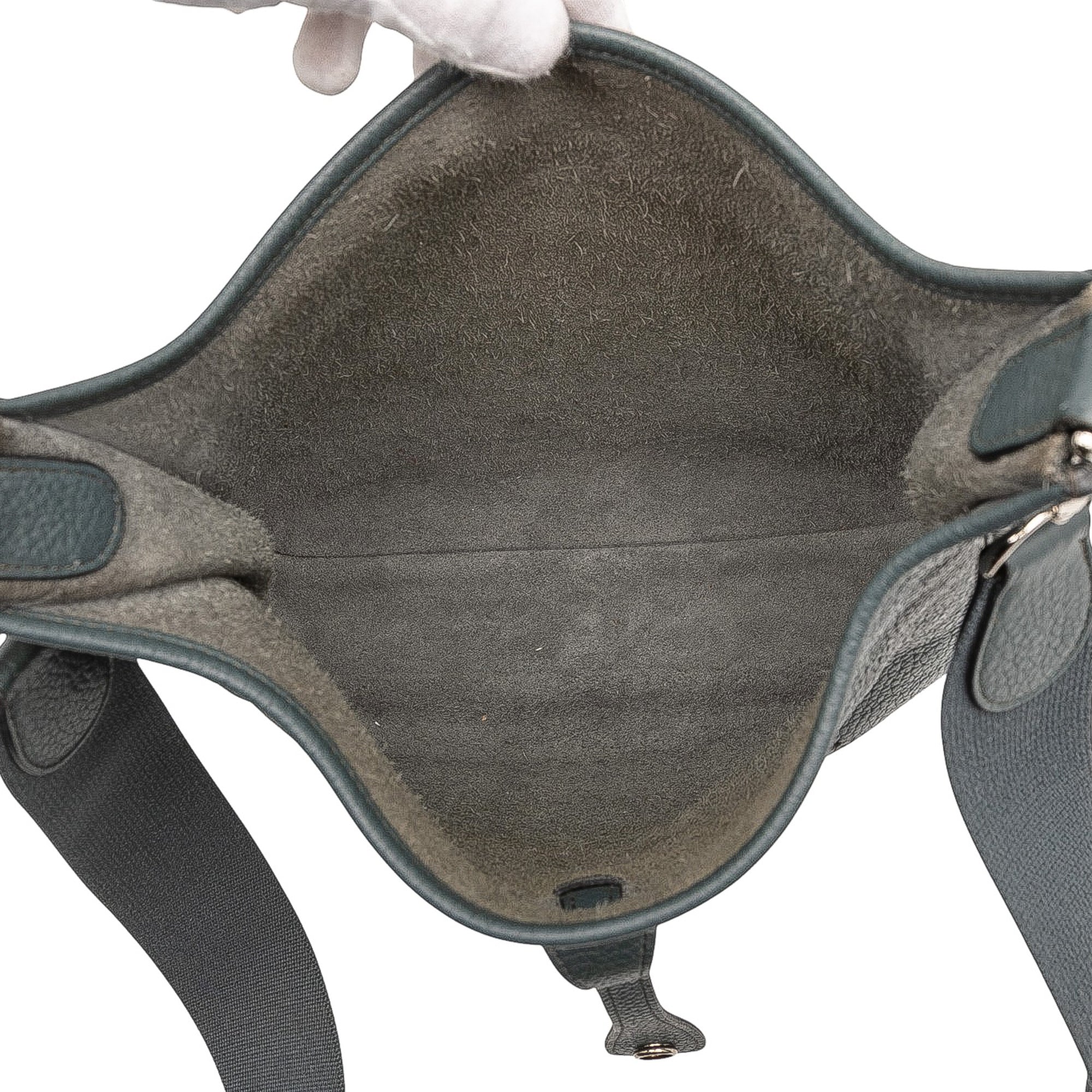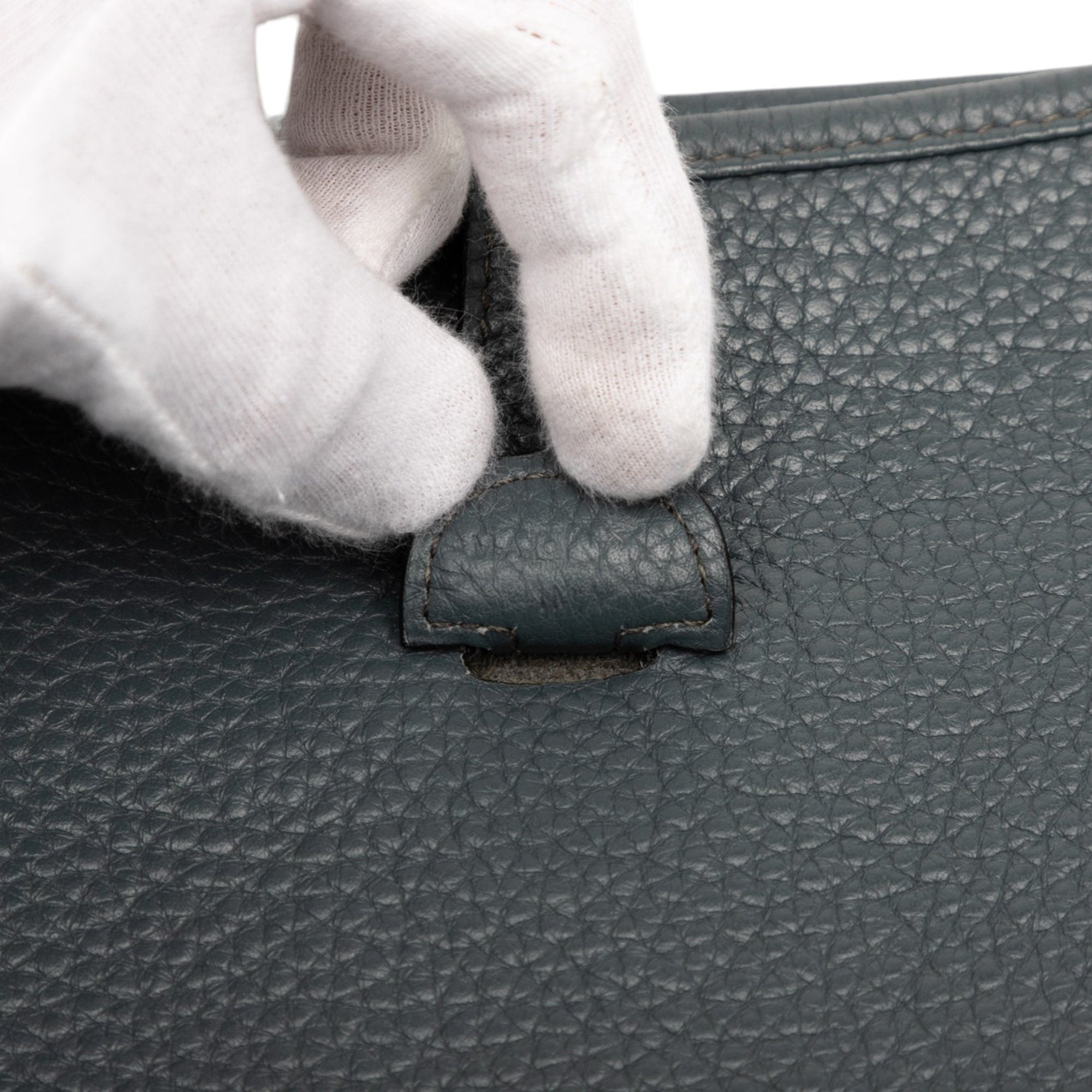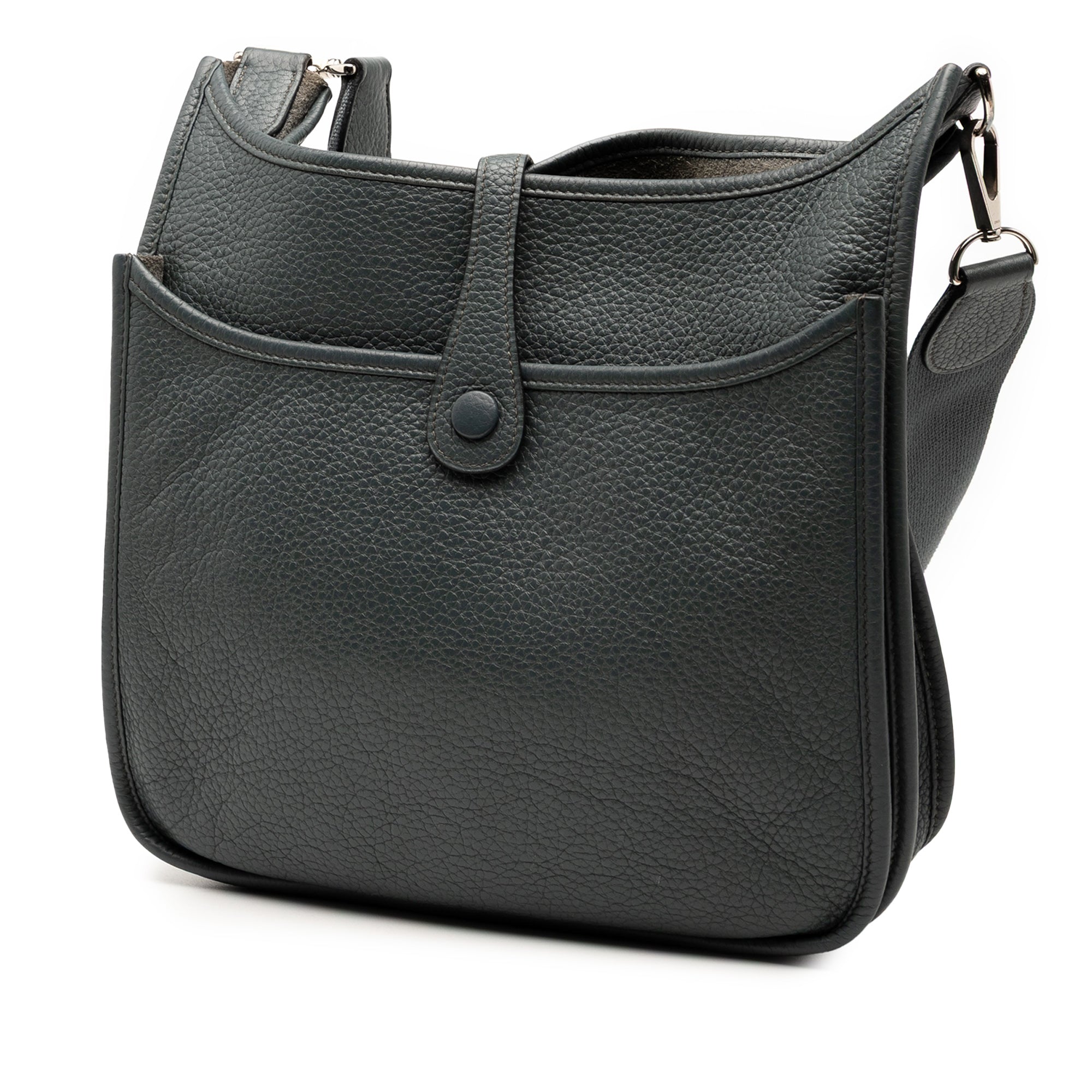 This Evelyne III PM features a Clemence leather body in Vert Rousseau color, a detachable flat canvas strap, an open top with a strap and snap closure, and an exterior slip pocket. Inclusion: Dust bag. Retail Price: 3850.00