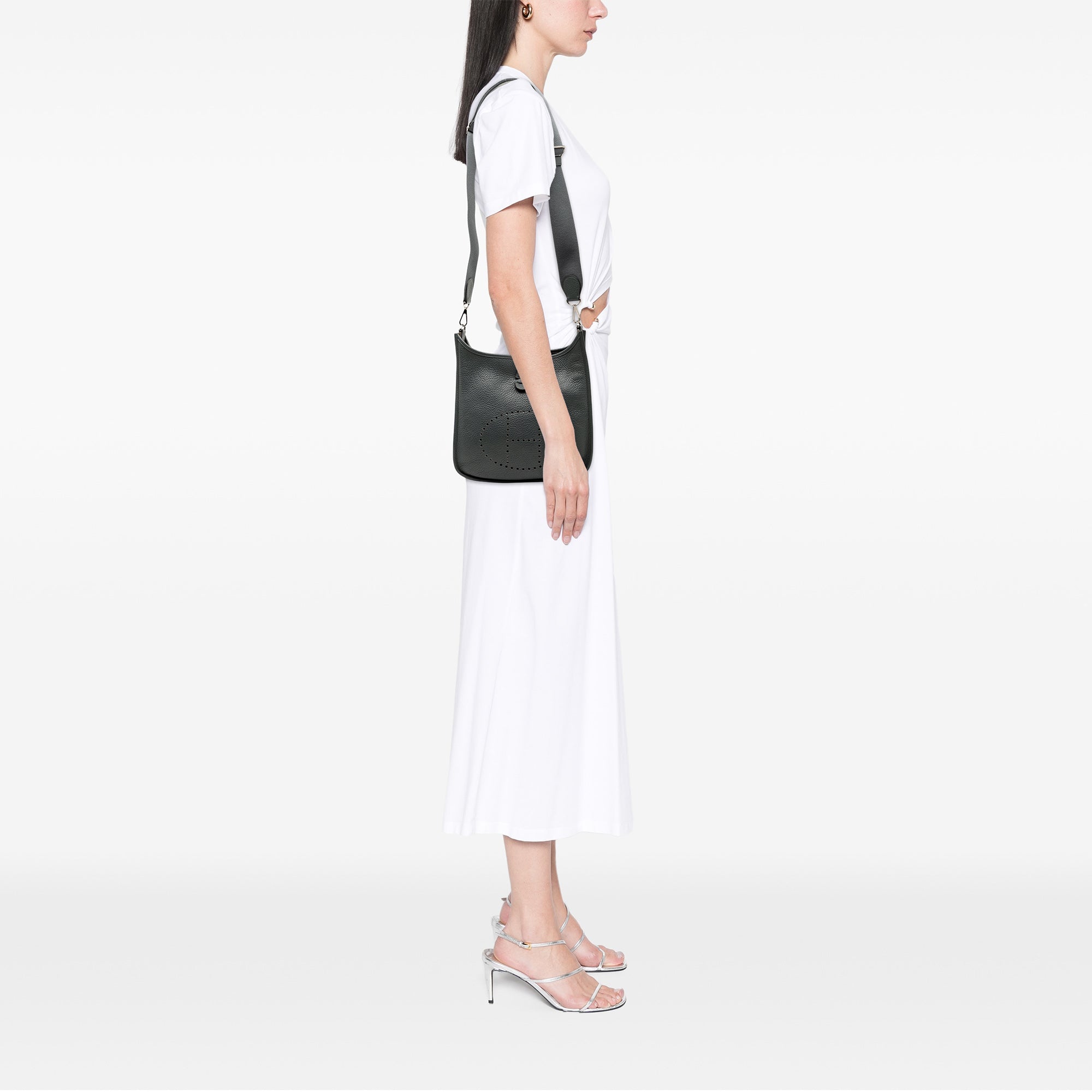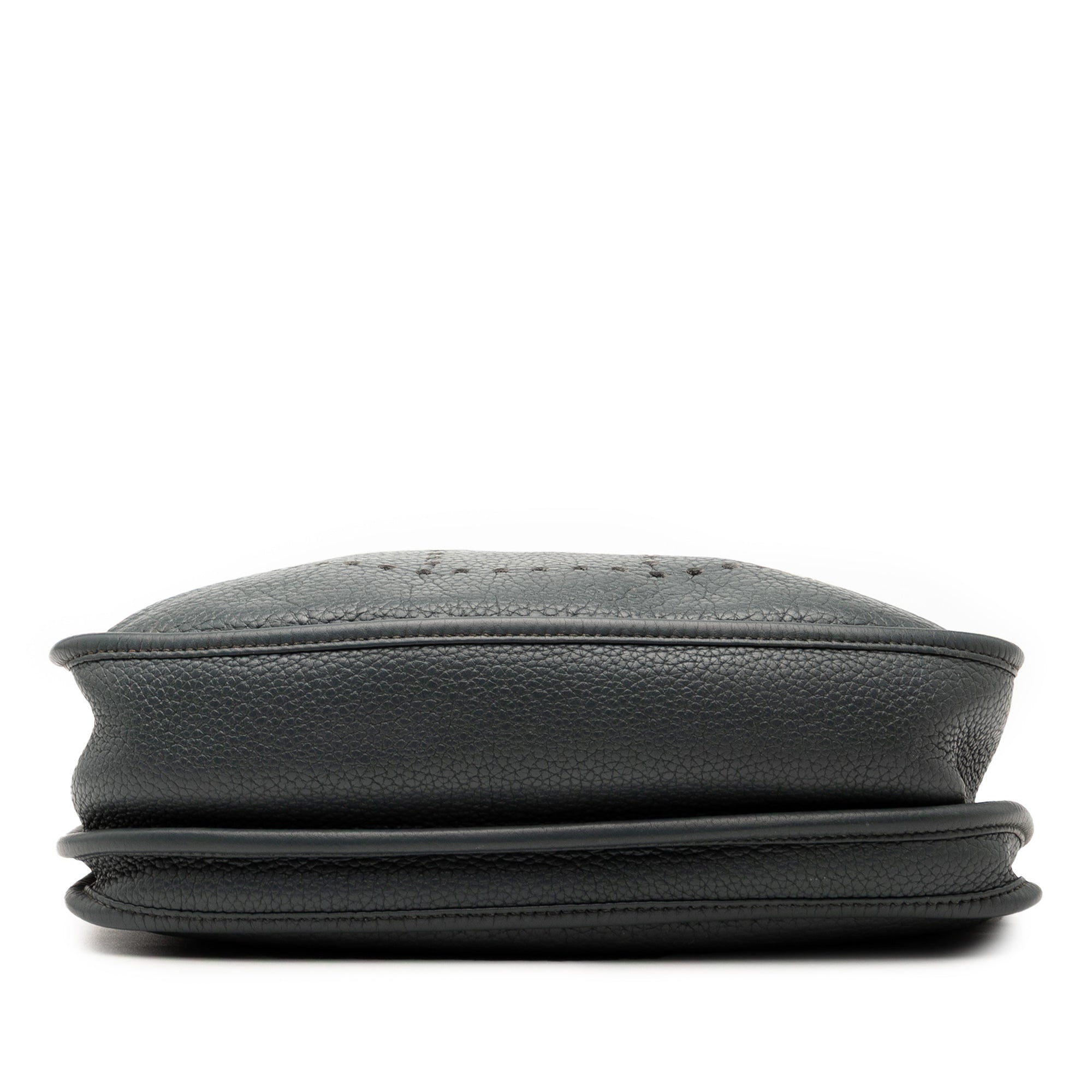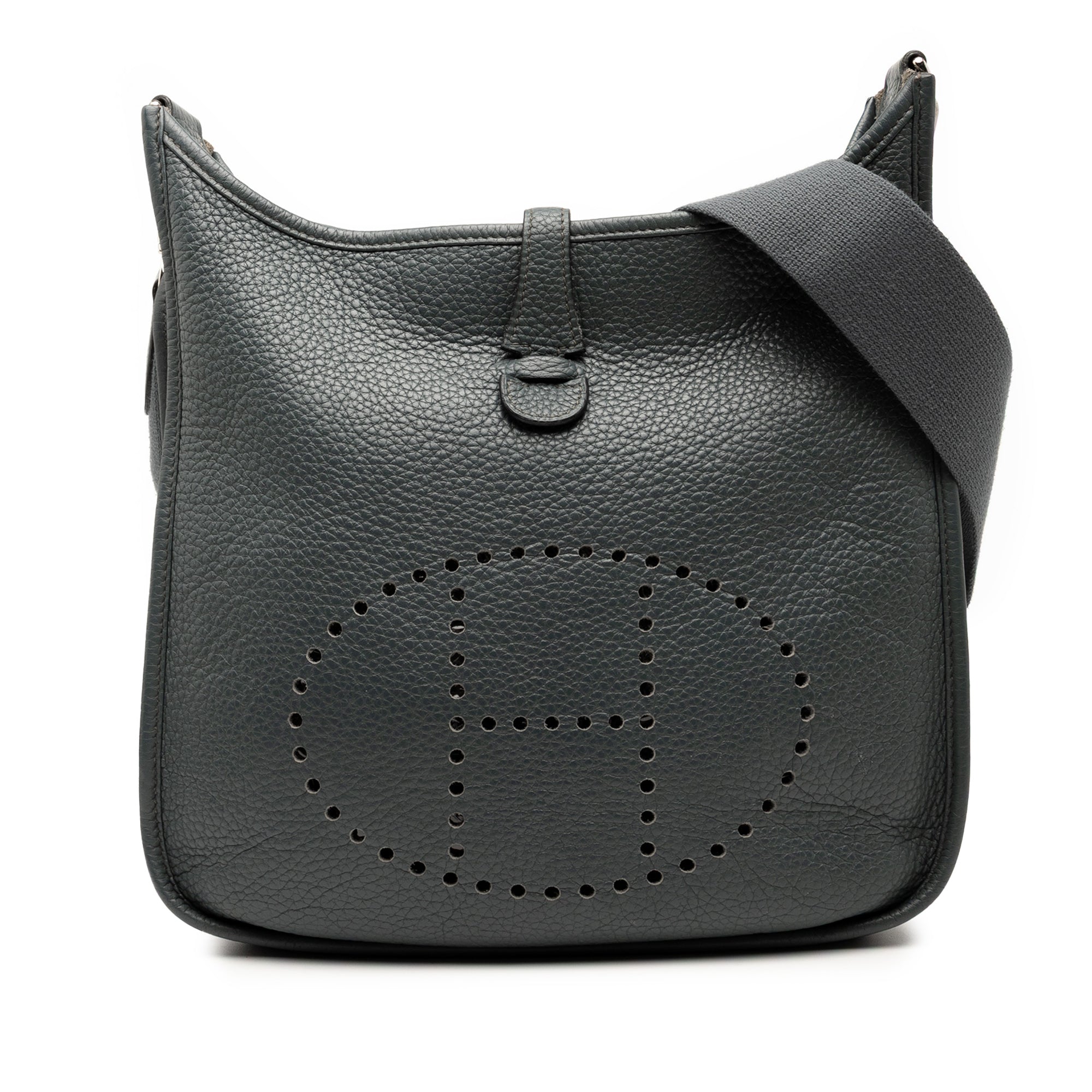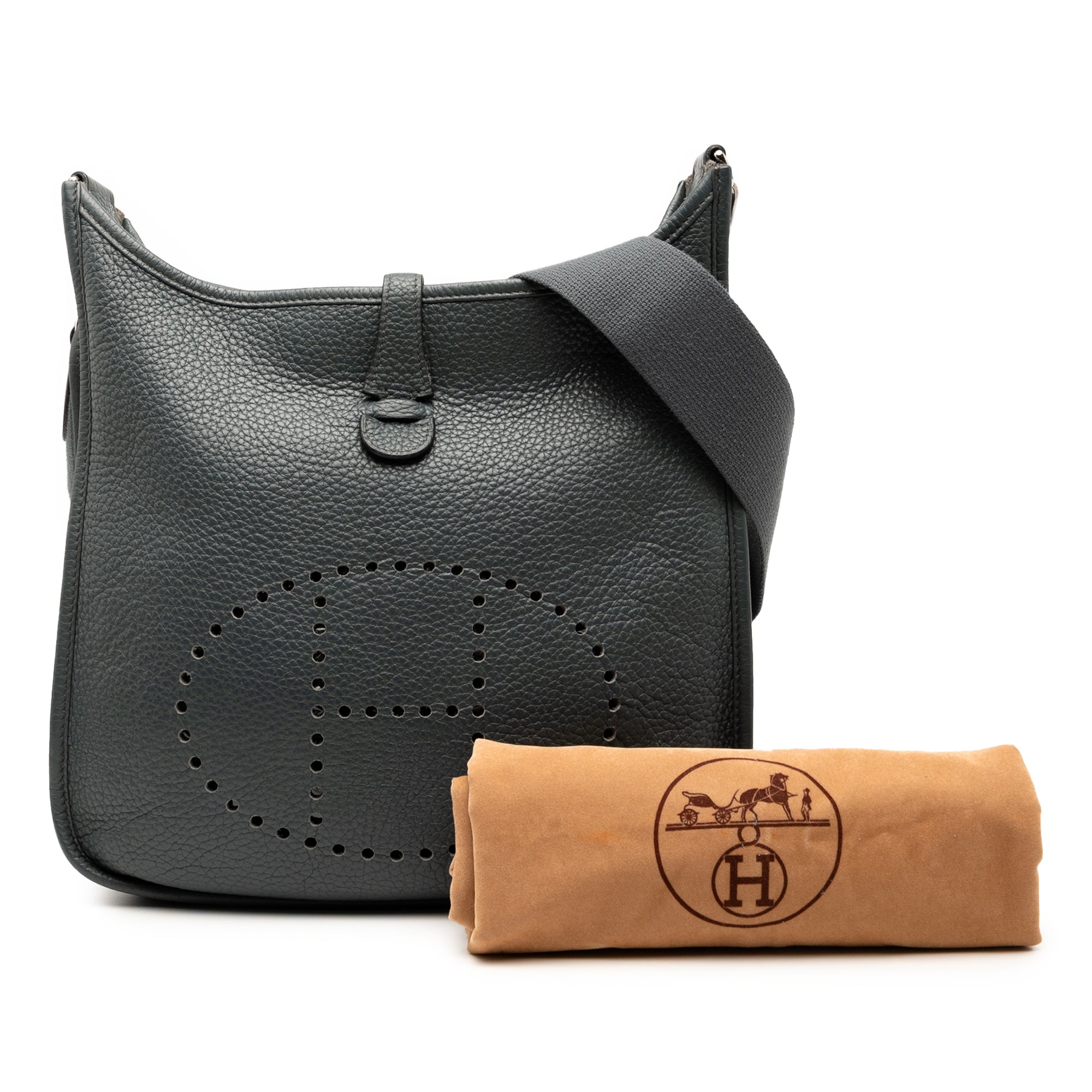 This Evelyne III PM features a Clemence leather body in Vert Rousseau color, a detachable flat canvas strap, an open top with a strap and snap closure, and an exterior slip pocket. Inclusion: Dust bag. Retail Price: 3850.00