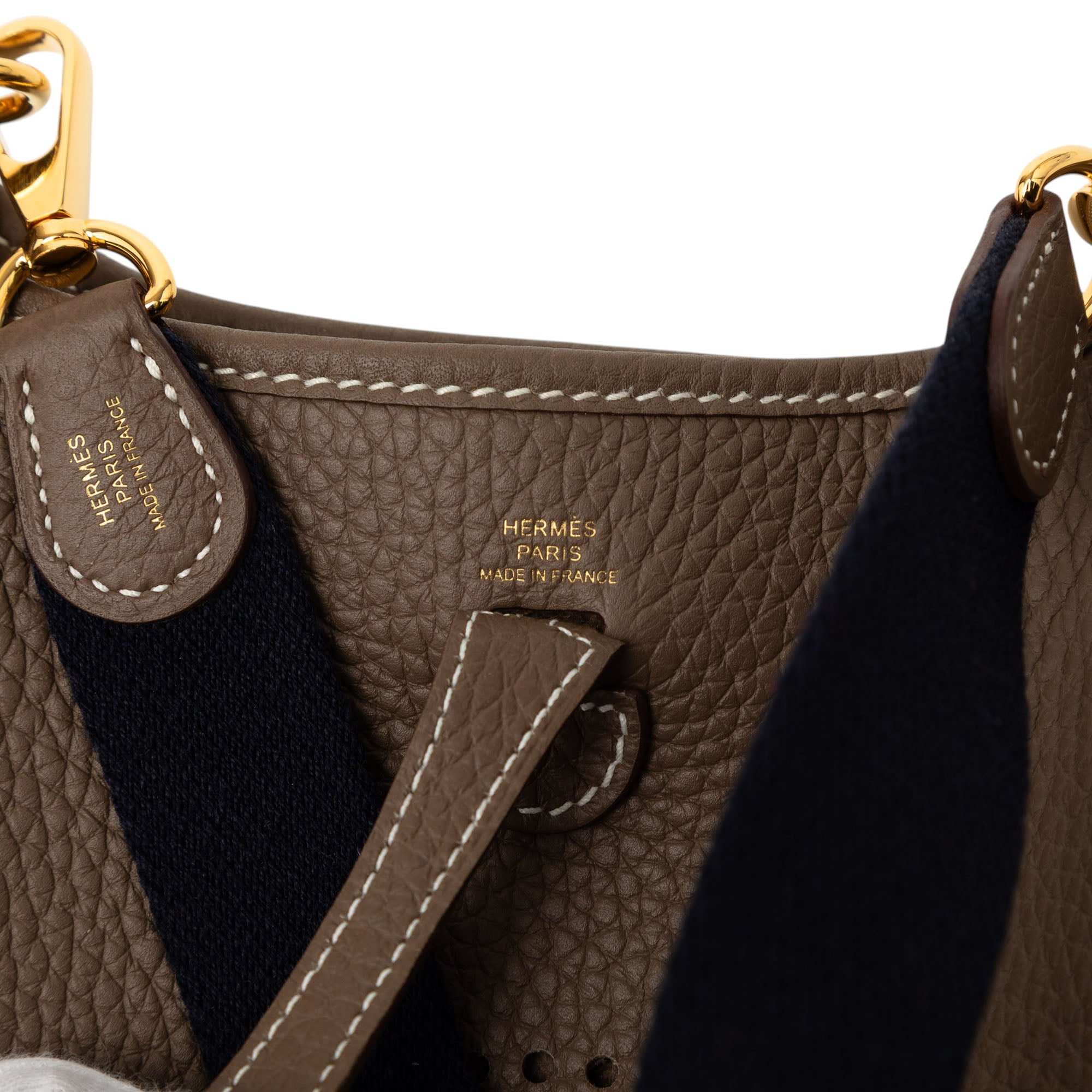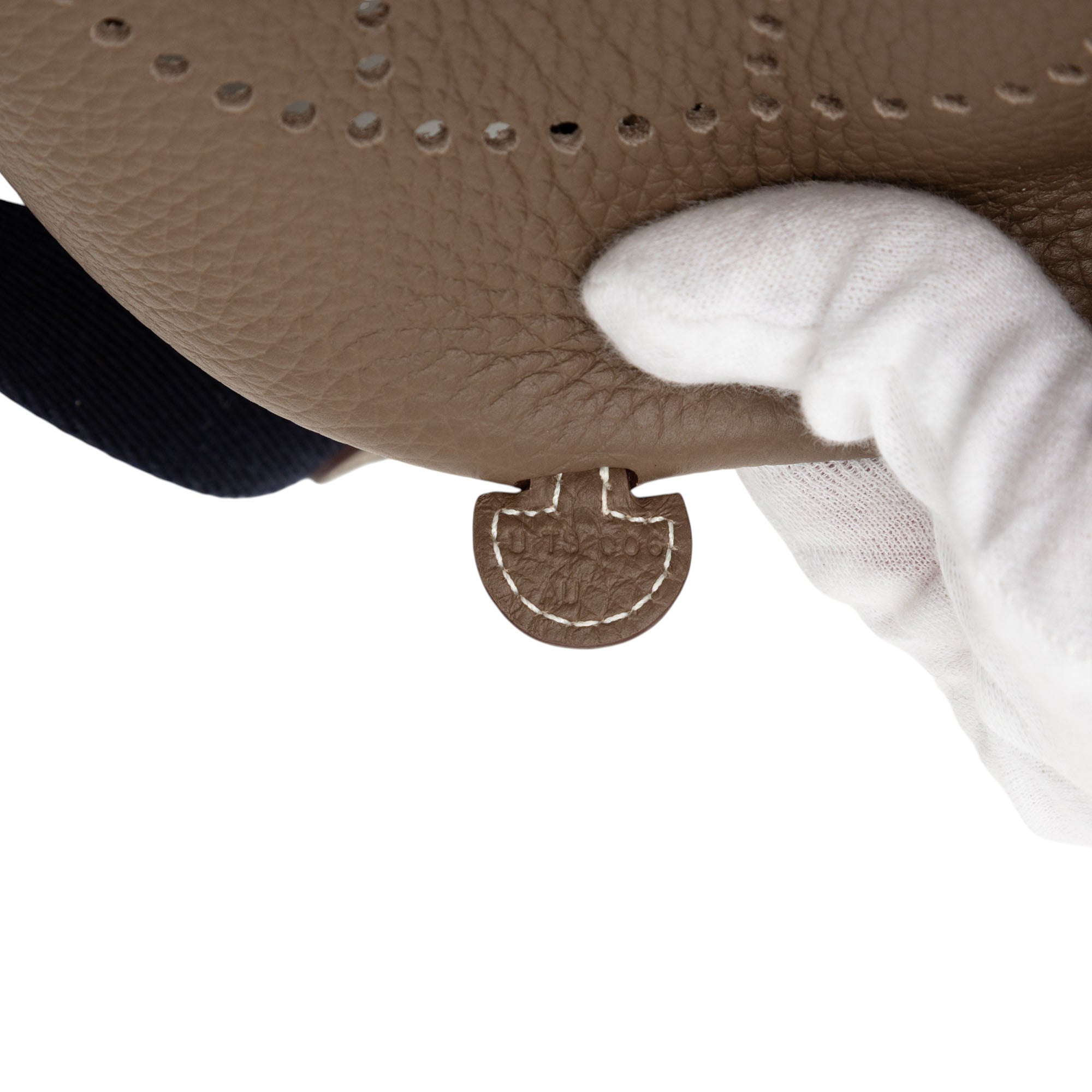 This Evelyne TPM features a Clemence leather body in Etoupe color, a detachable flat canvas strap, and an open top with a strap and snap button closure. Inclusion: Dust bag, box. Retail Price: 4996.00