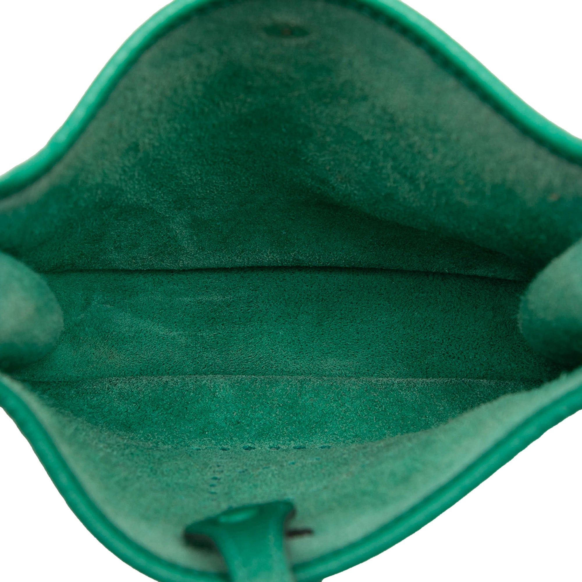 This Evelyne TPM features a Clemence leather body in Vert Vertigo color, a detachable flat strap, and an open top with a strap and snap closure. Retail Price: 5000.00