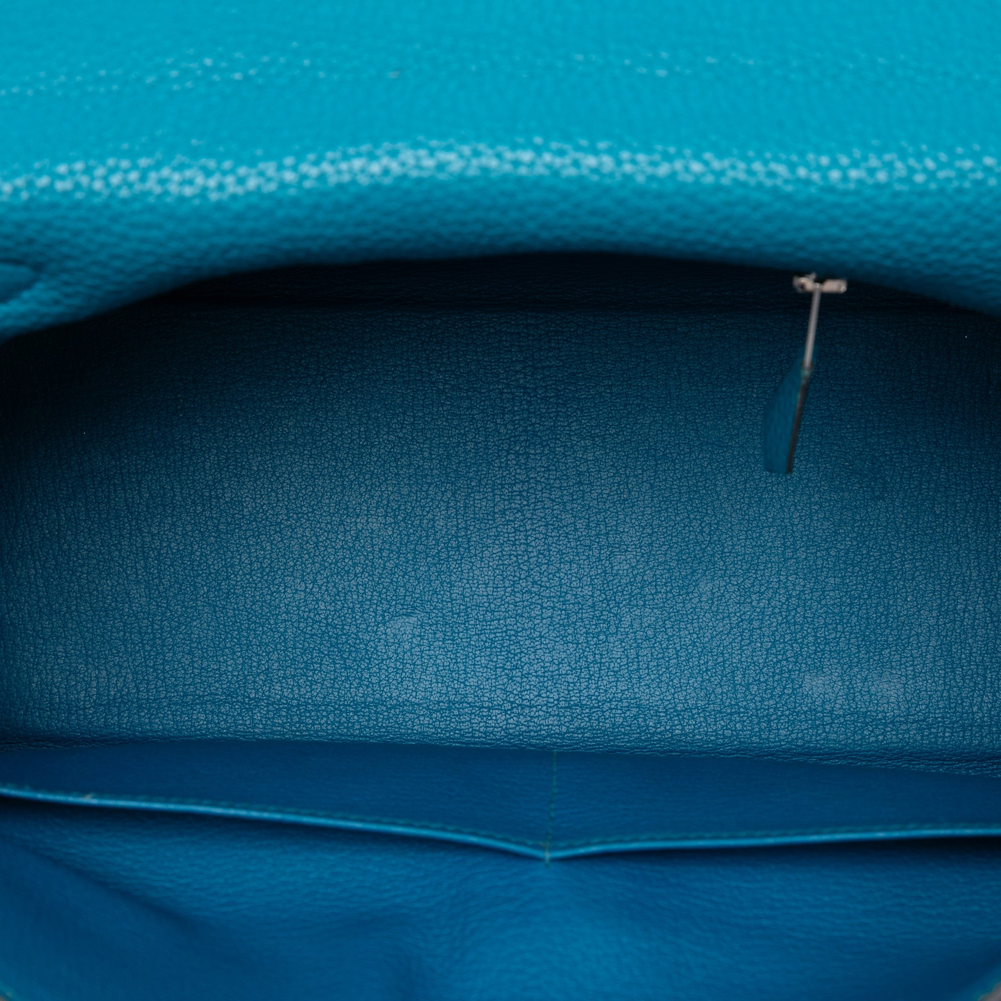This Kelly 32 features a clemence leather body in Blue Izmir color, a rolled leather top handle, a detachable flat leather shoulder strap, a flap with turn lock and pull through closure, and interior zip and slip pockets. Retail Price: 12600.00