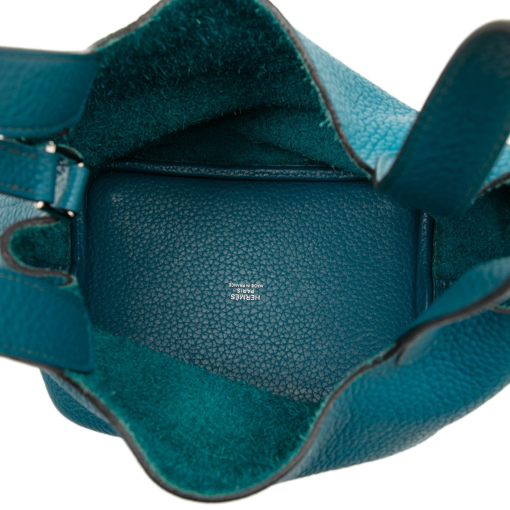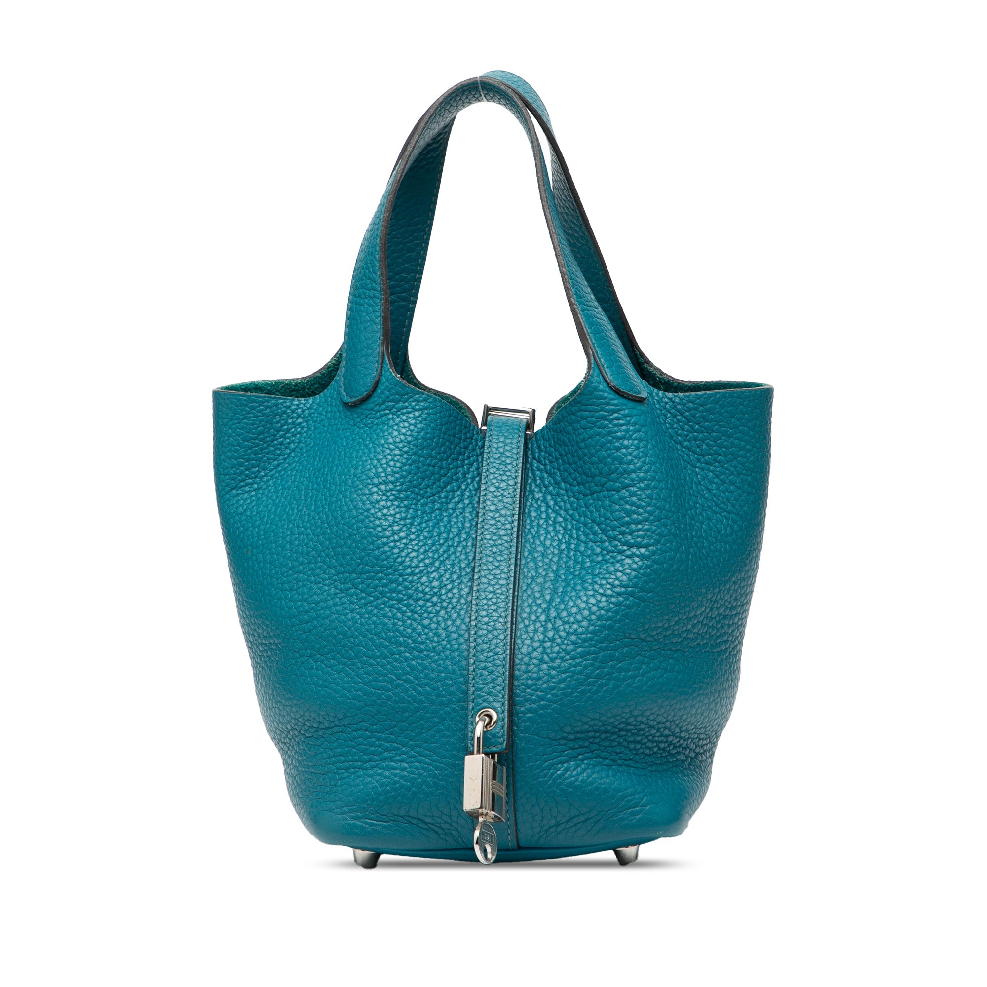 This Picotin Lock features a Clemence leather body in Blue Paon color, flat leather straps, and a top strap and buckle closure. Retail Price: 5321.00