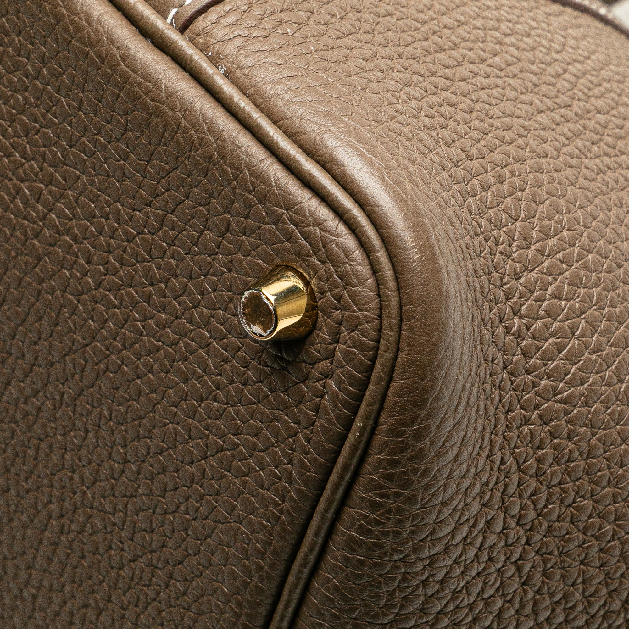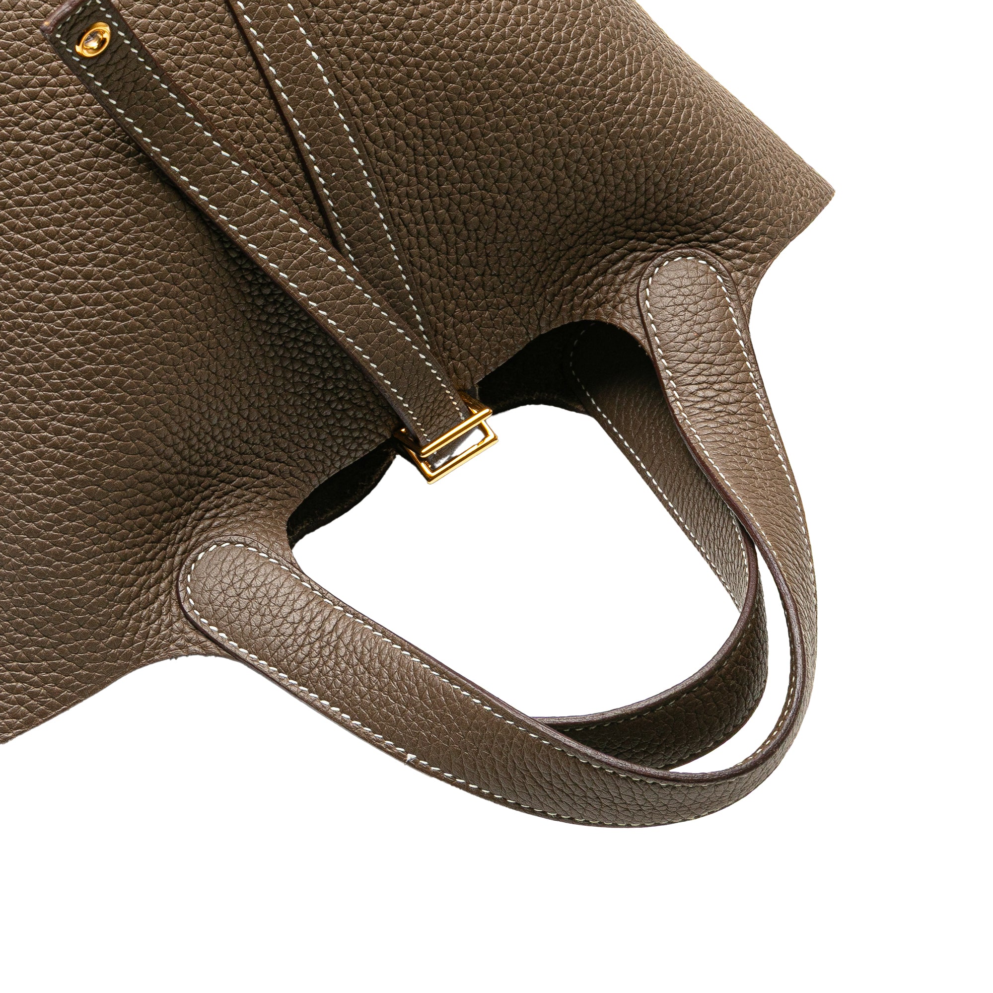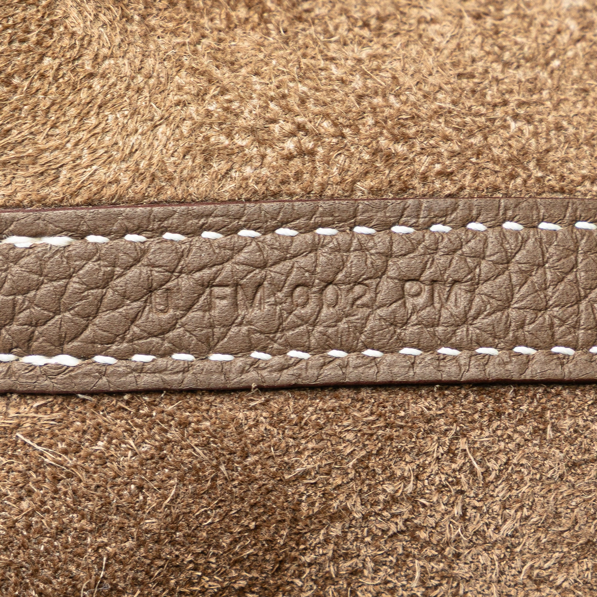 This Picotin features a Clemence leather body in Etoupe color, flat leather handles, and an open top with buckle closure. Inclusion: Dust bag, box. Retail Price: 5500.00