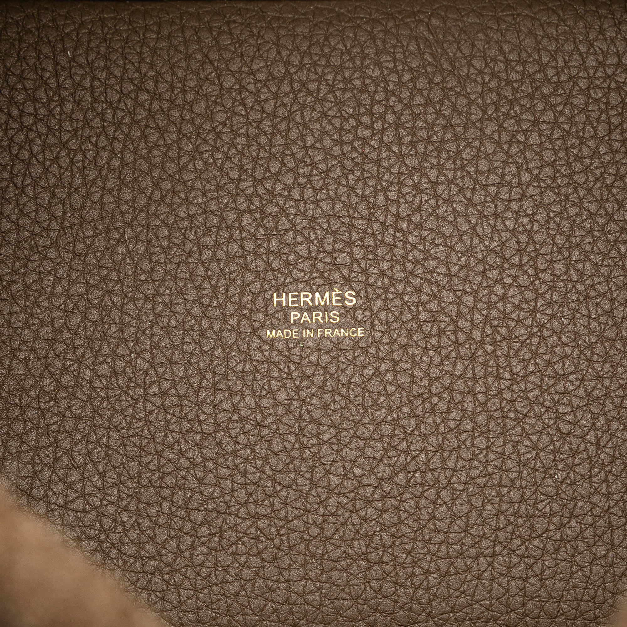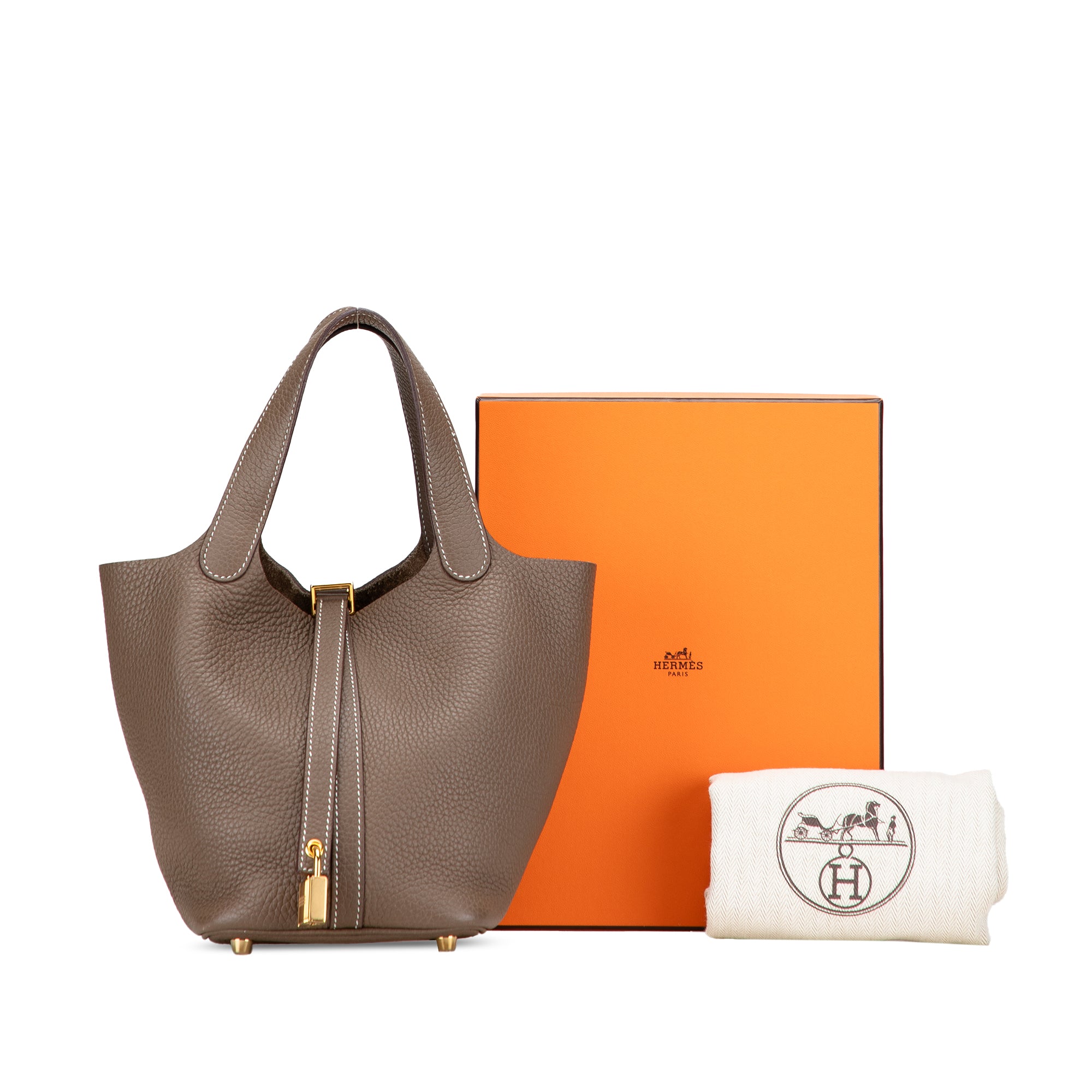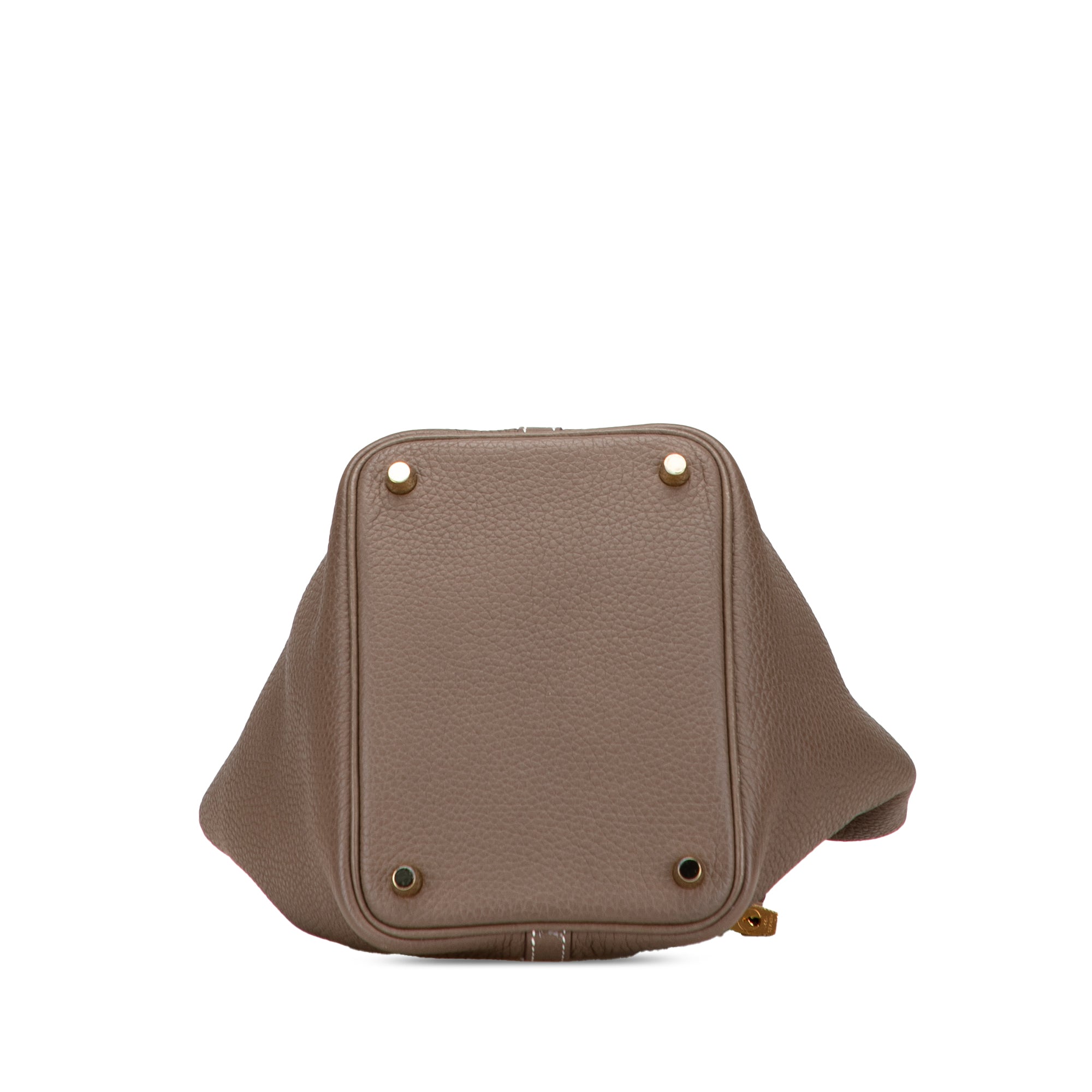 This Picotin features a Clemence leather body in Etoupe color, flat leather handles, and an open top with buckle closure. Inclusion: Dust bag, box. Retail Price: 5500.00