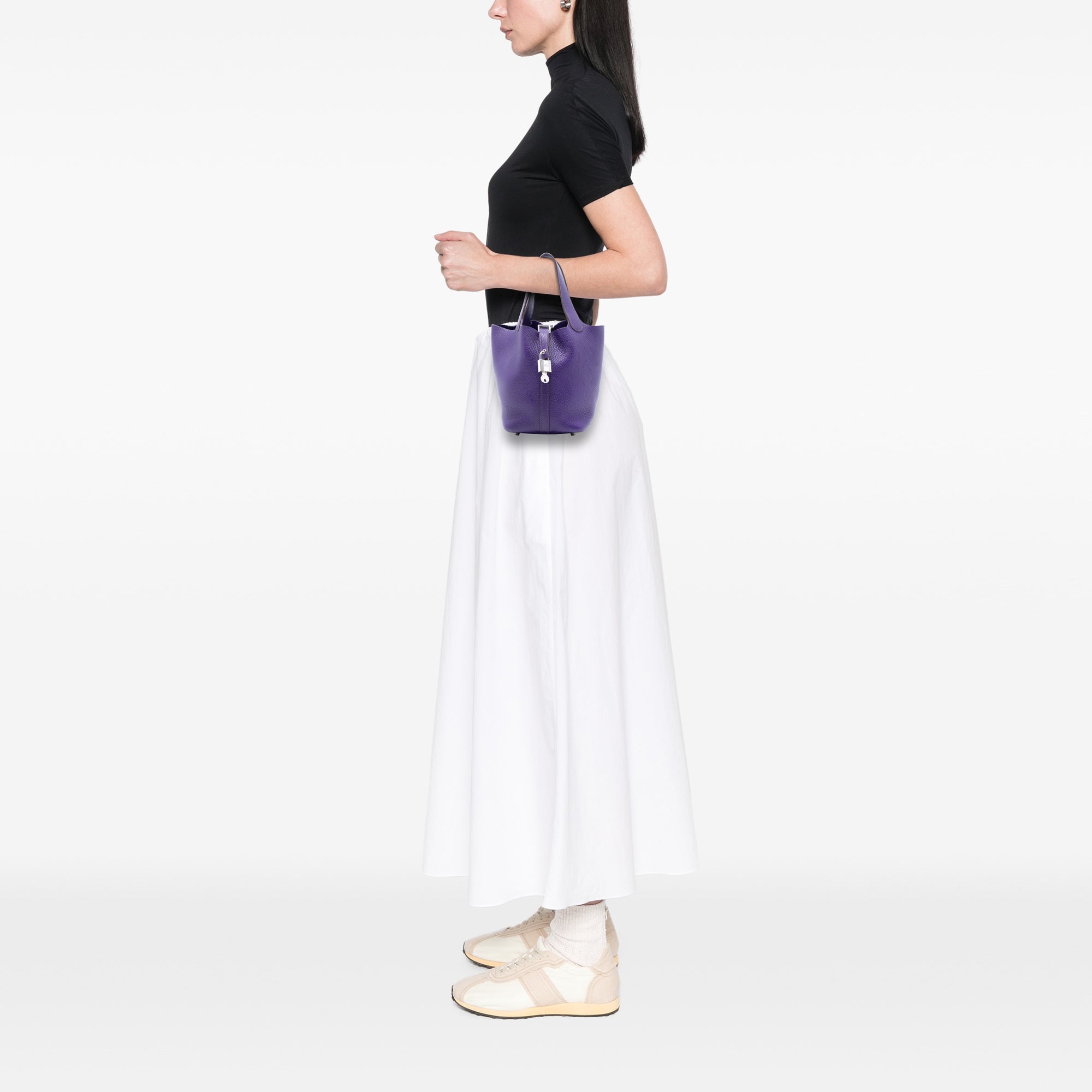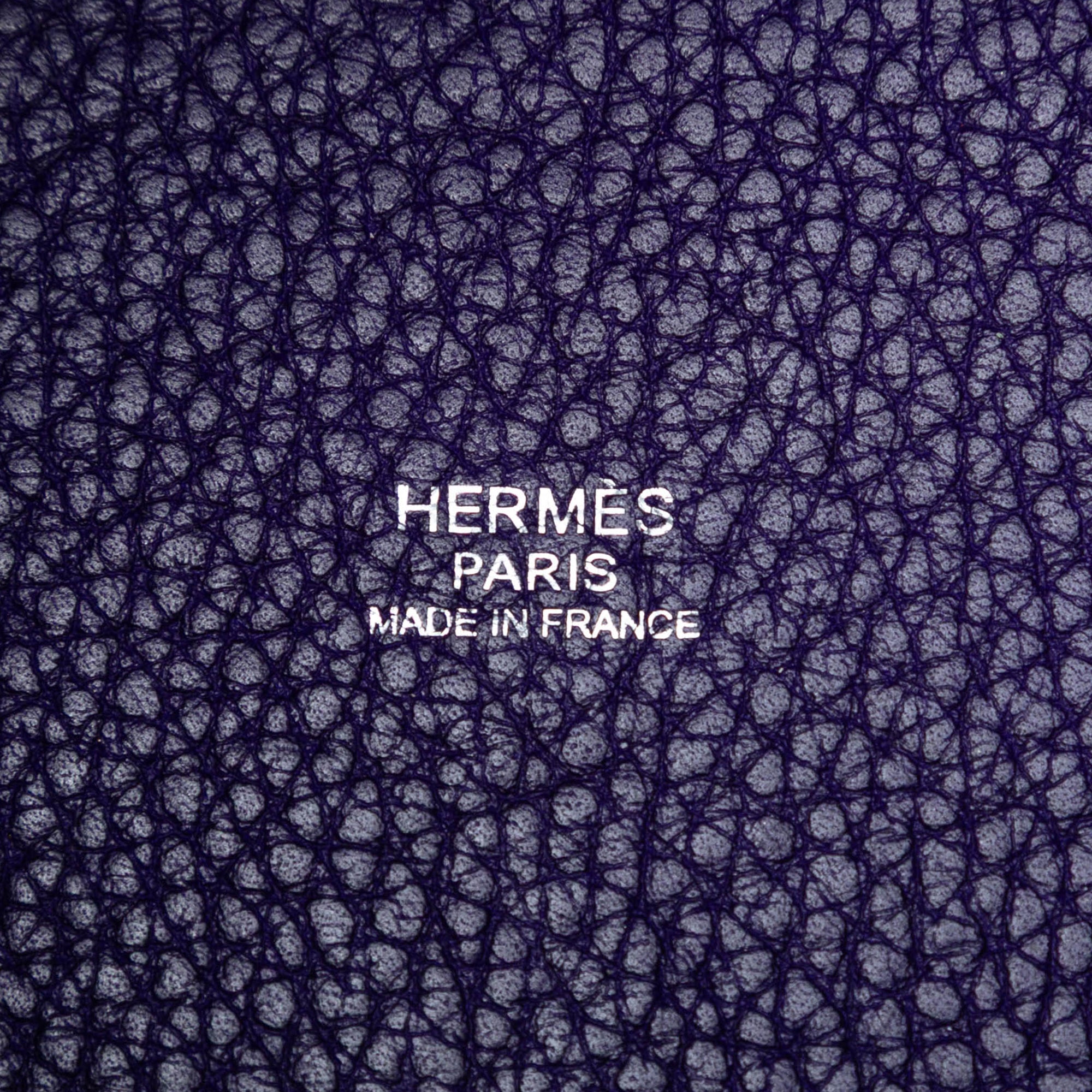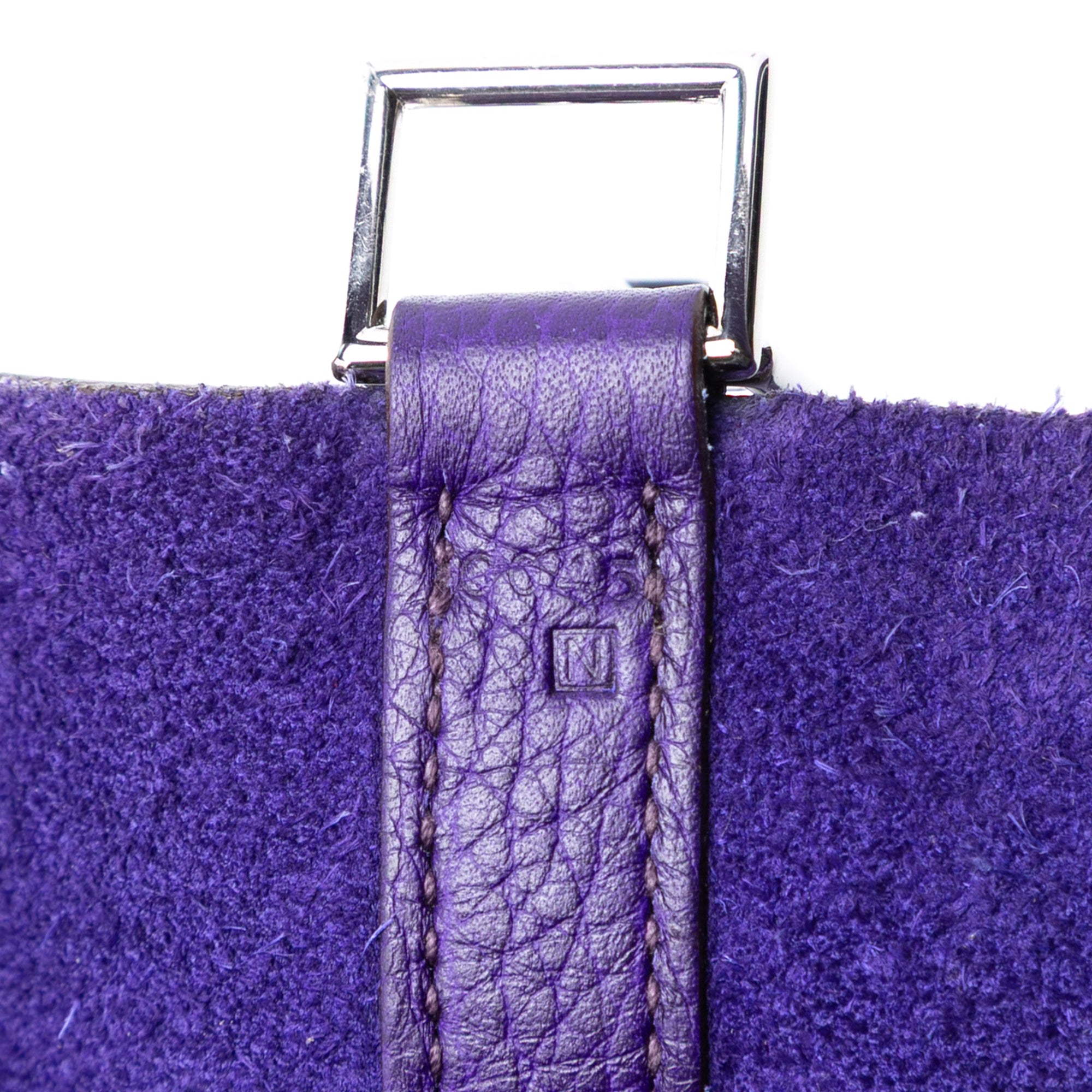This Picotin Lock 18 features a Clemence leather body in Ultraviolet color, flat leather top handles, and an open top with a pull through strap and lock closure. Retail Price: 4500.00