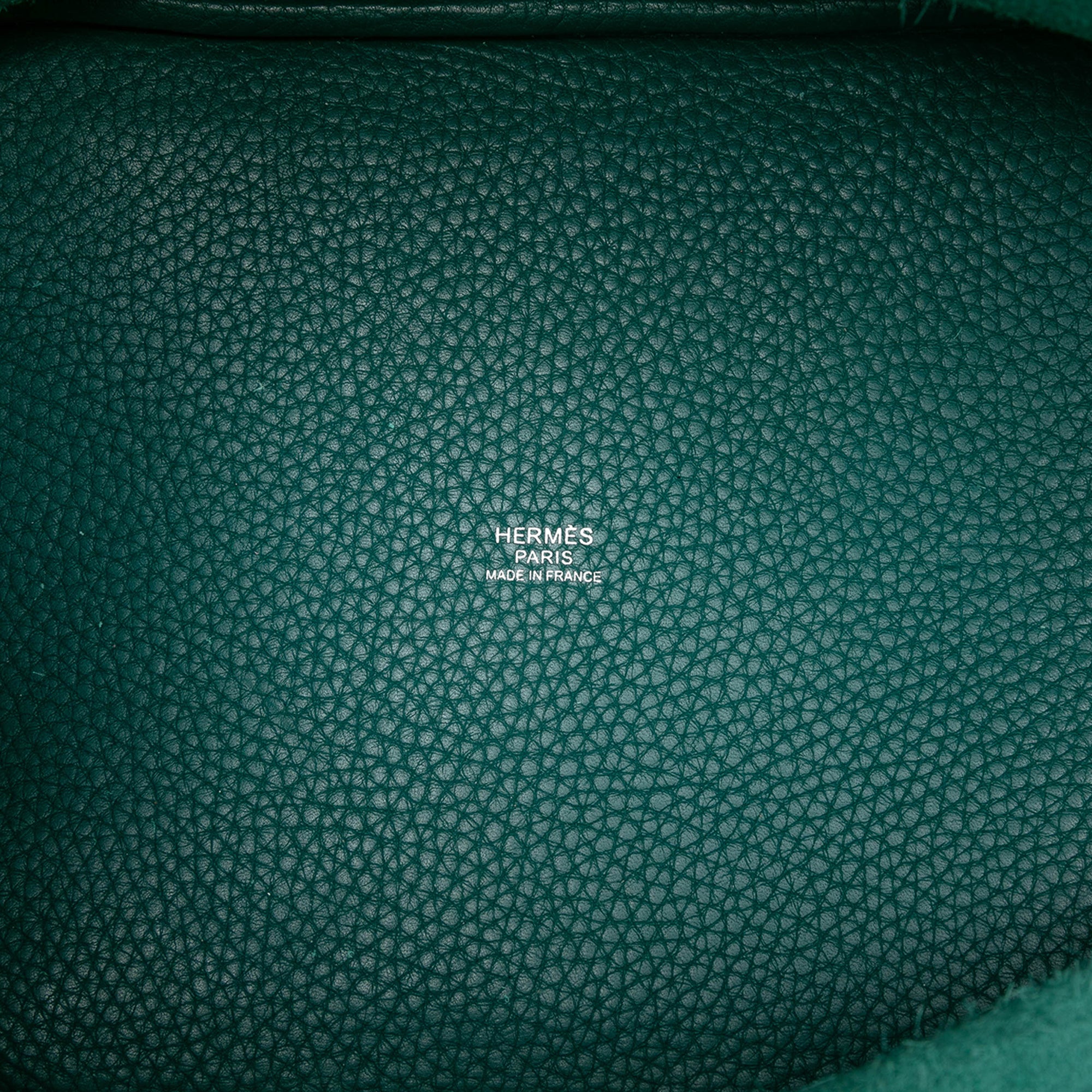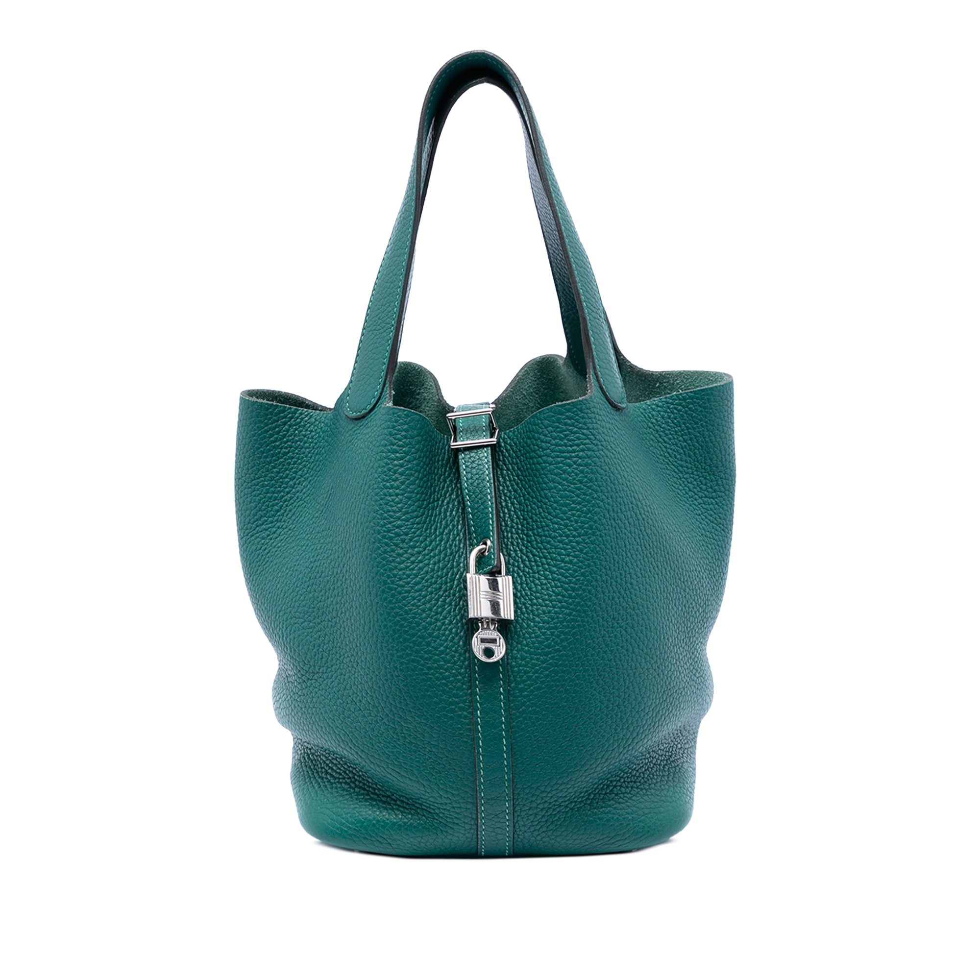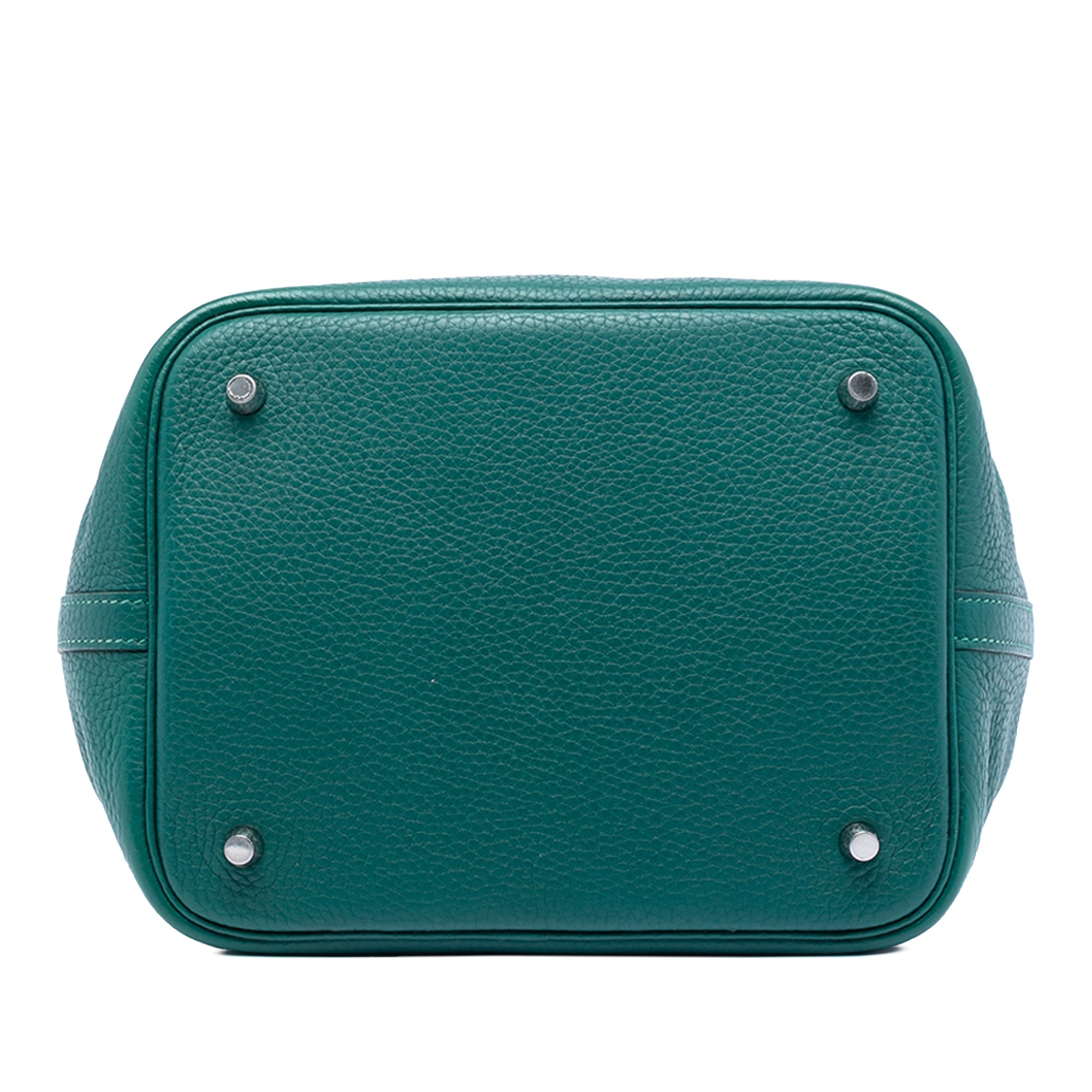 This Picotin 22 features a Clemence leather body in Malachite color, flat leather handles, and an open top with a pull through strap and padlock closure. Retail Price: 3575.00