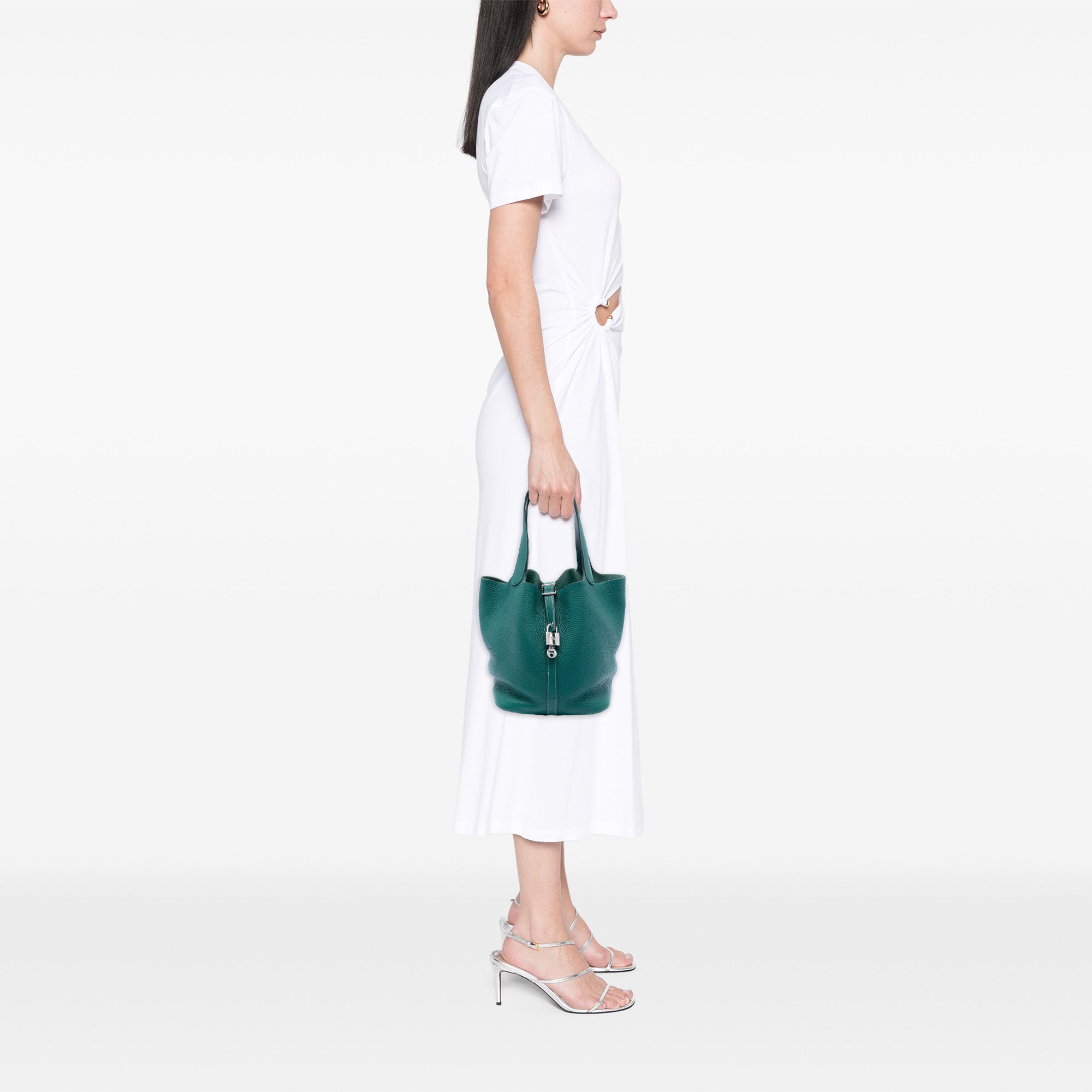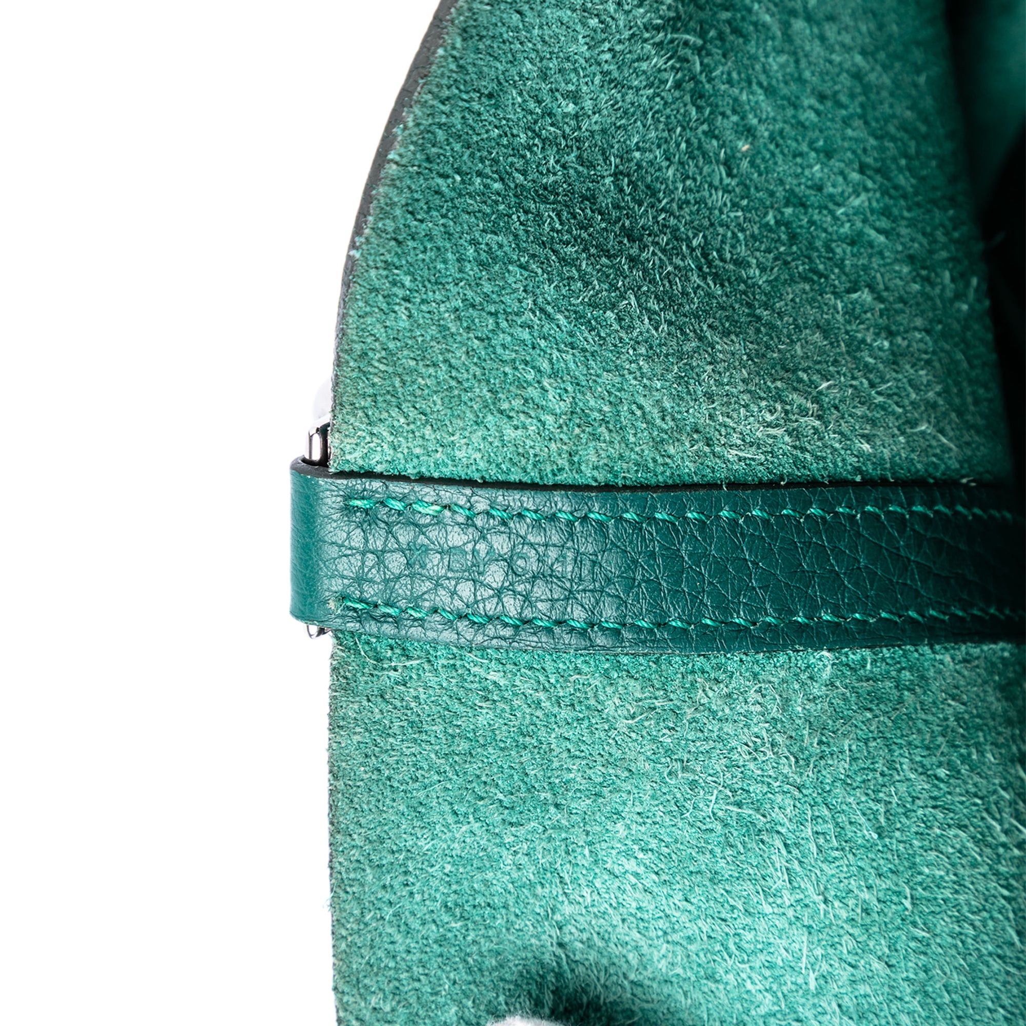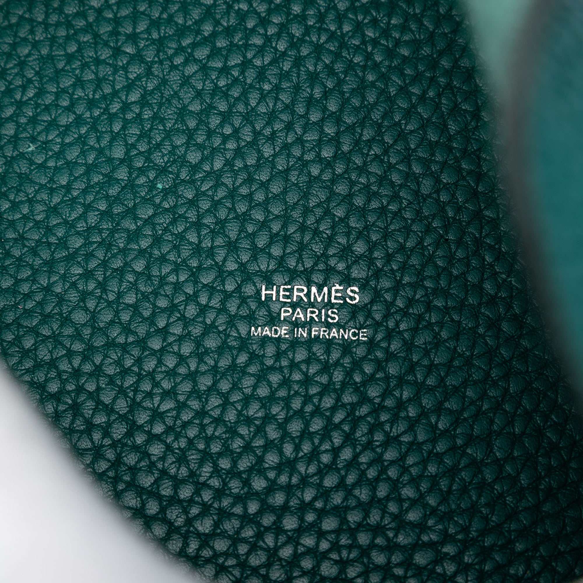 This Picotin 22 features a Clemence leather body in Malachite color, flat leather handles, and an open top with a pull through strap and padlock closure. Retail Price: 3575.00