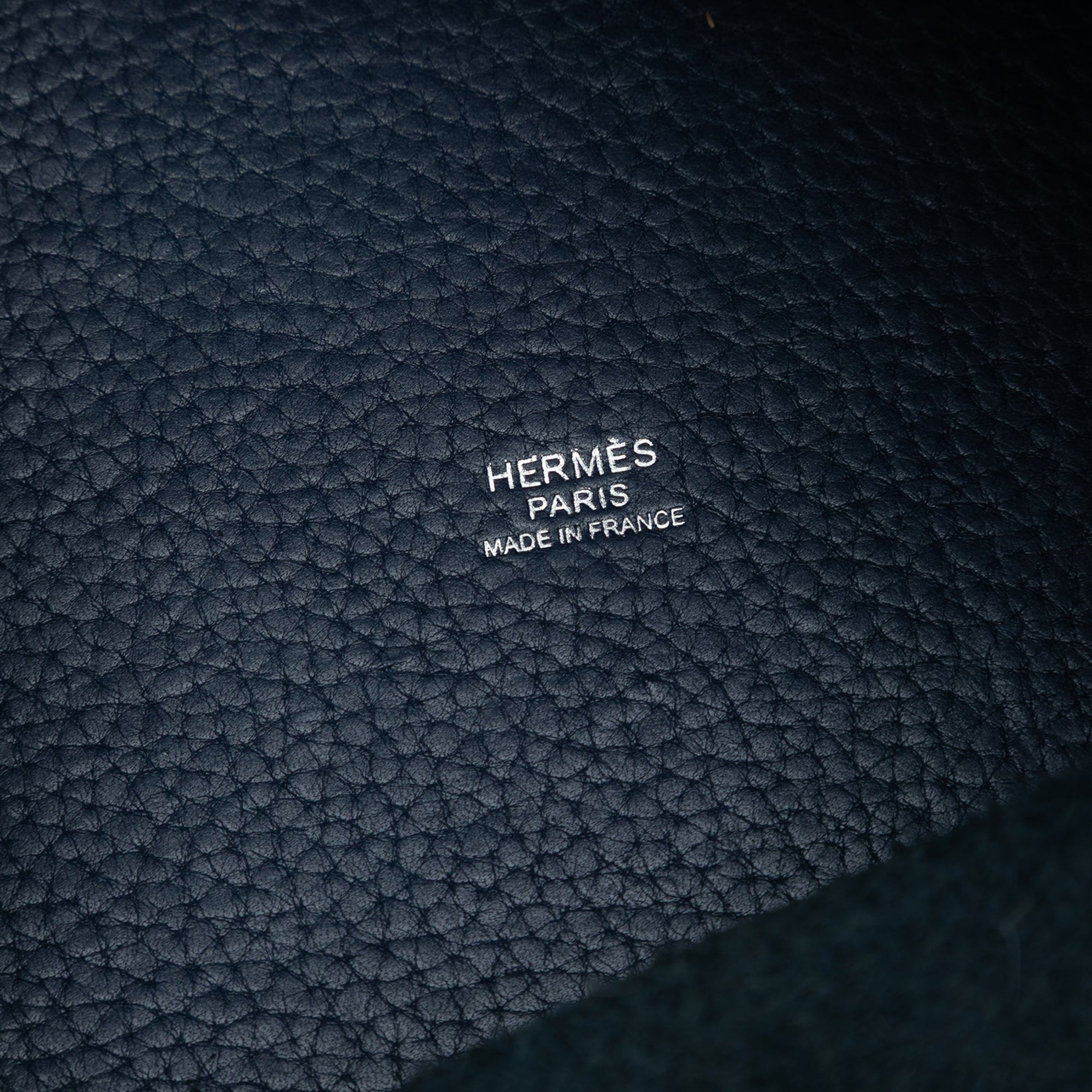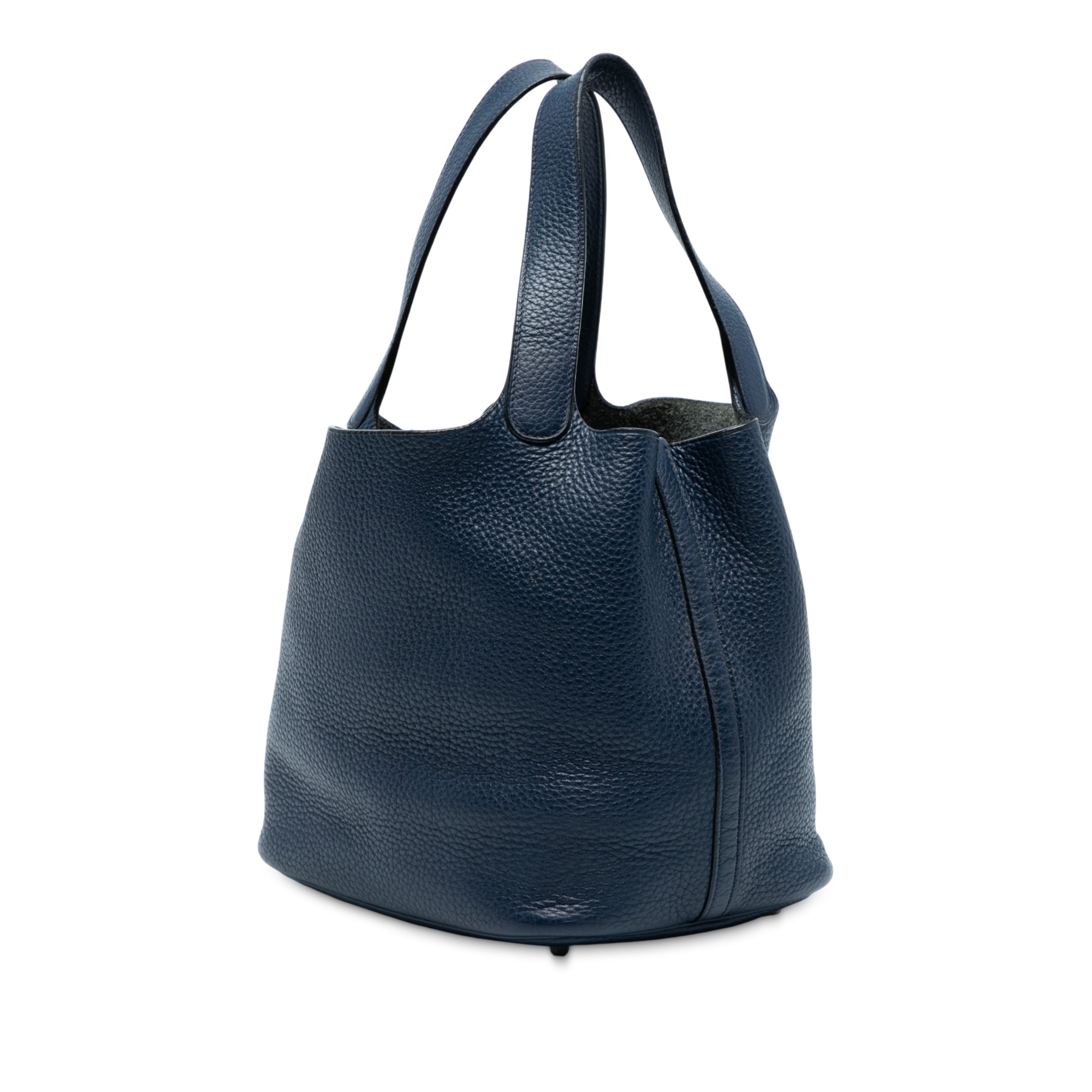 This Picotin 22 features a Clemence leather body in Bleu de Malte color, flat top handles, and an open top with a pull through flat strap and padlock closure. Retail Price: 4870.00