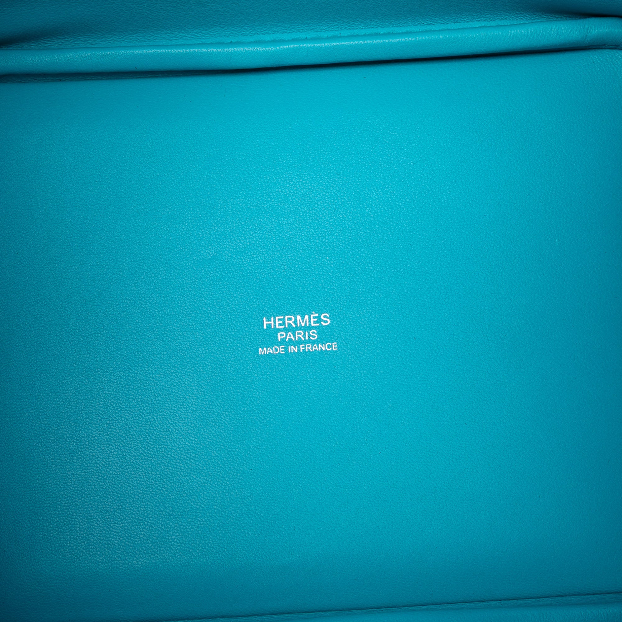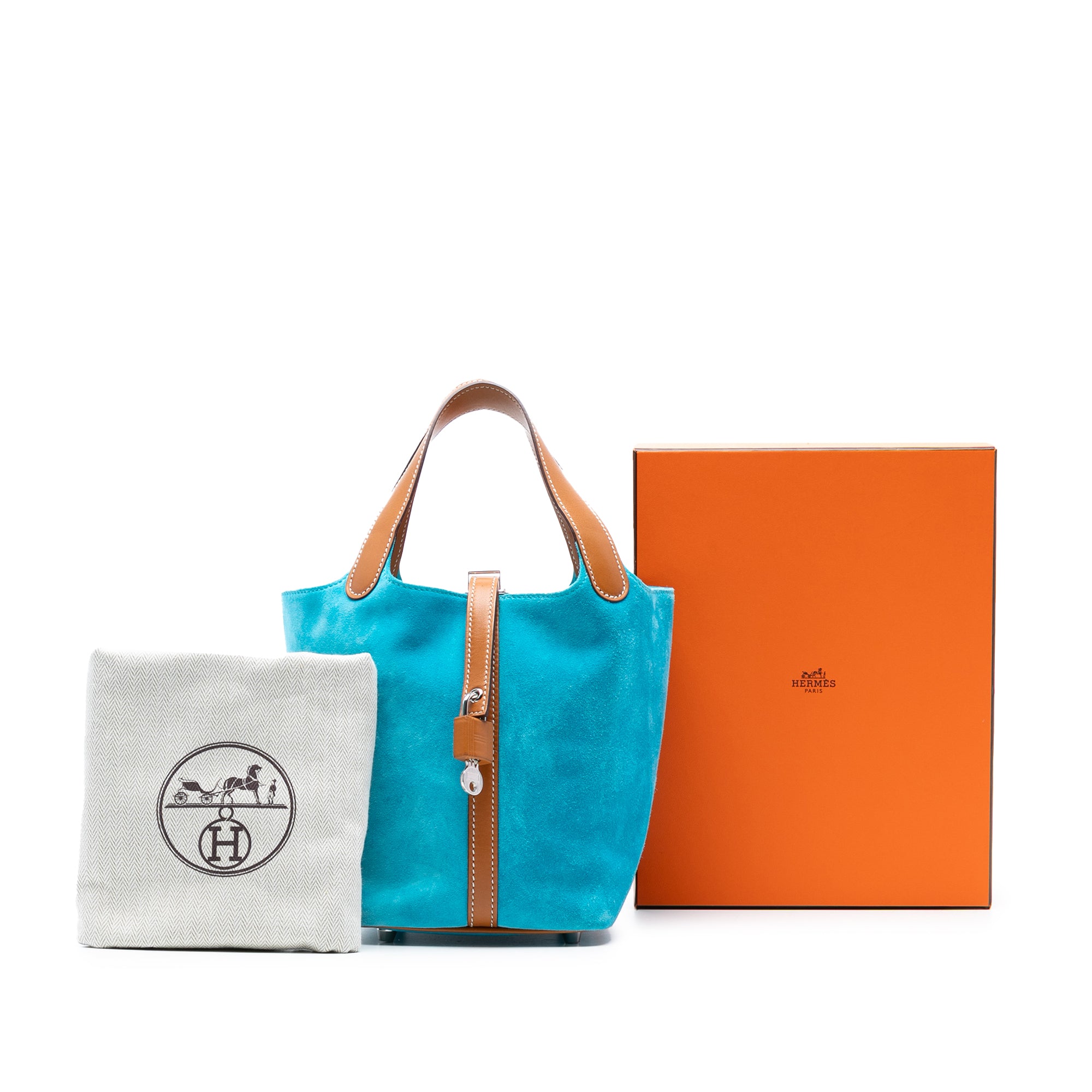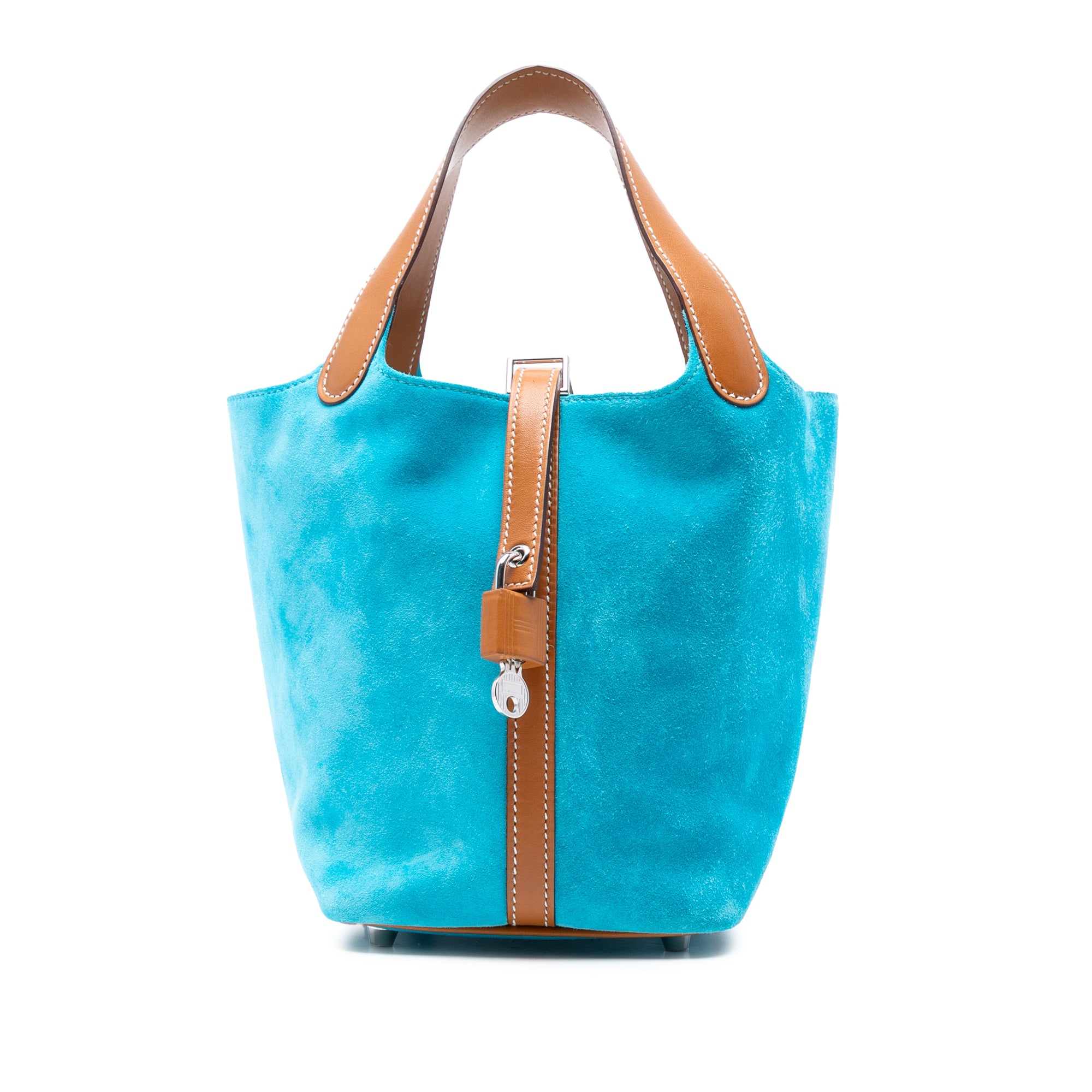 This Picotin 18 features a suede leather body in Turquoise color, Butler leather top handles in Natural color, and an open top with pull-through strap closure. Inclusion: Dust bag, box. Retail Price: 3725.00