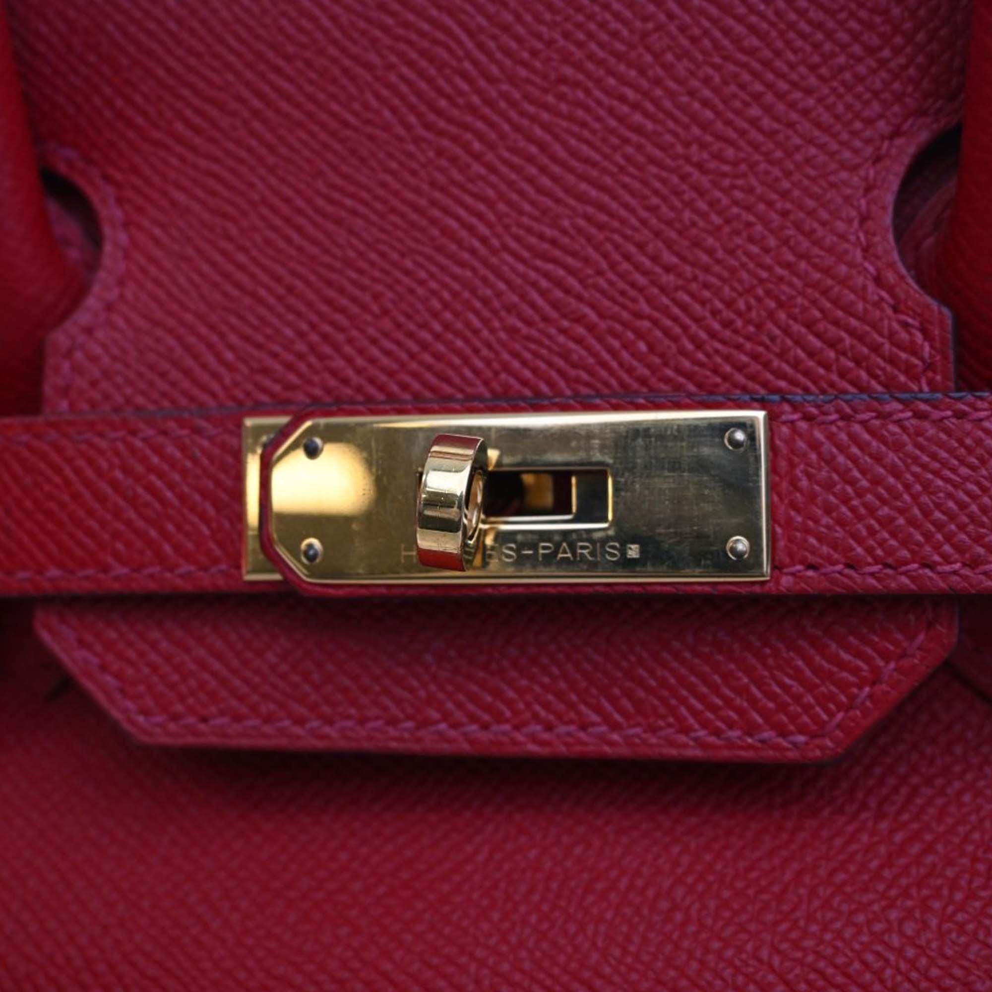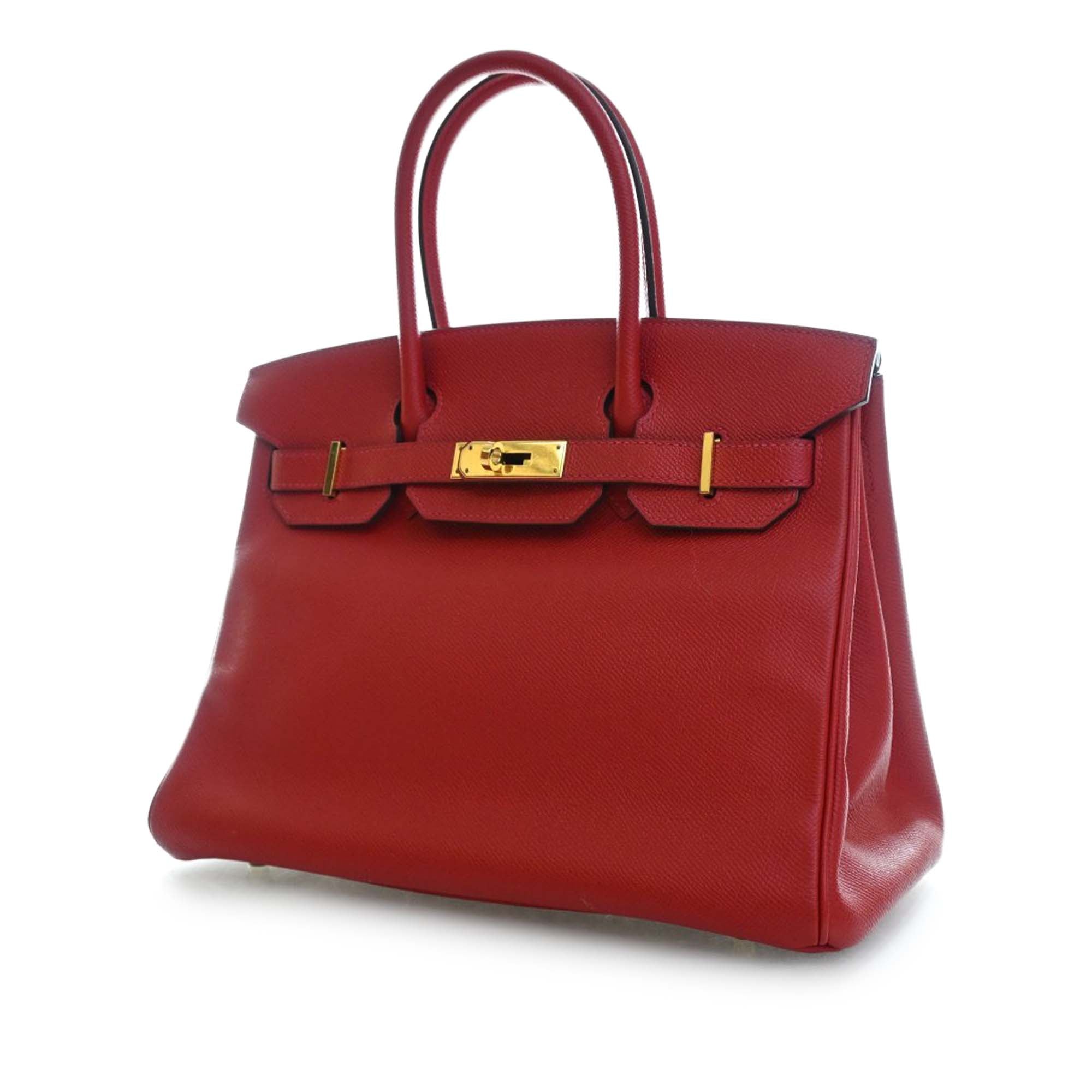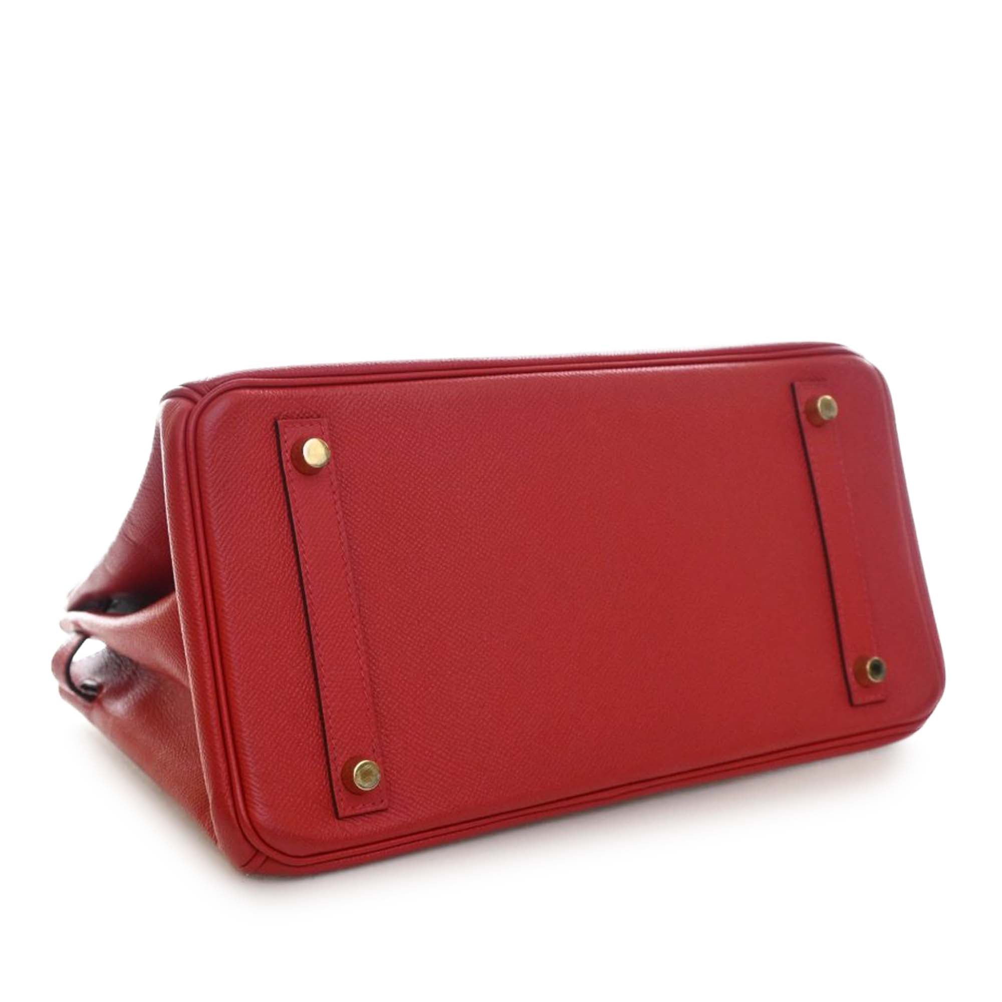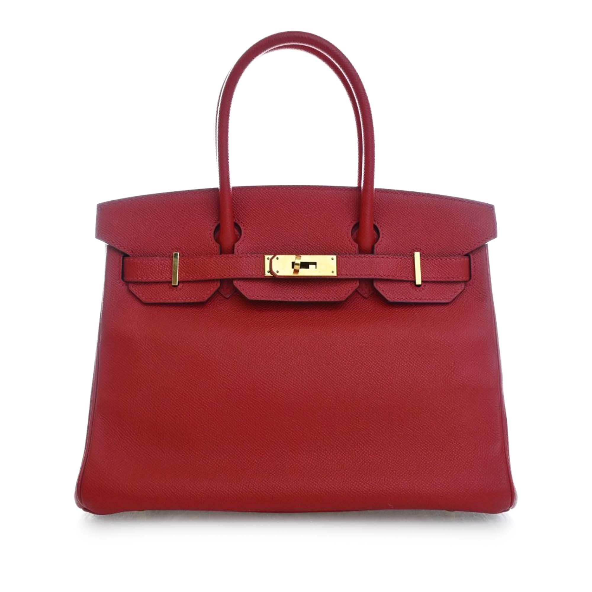 The Epsom Birkin 30 features epsom leather in Rouge Casaque color, rolled leather handles, turn-lock closure at front, and interior slip and zip pockets. Inclusion: Dust bag. Retail Price: 23500.00