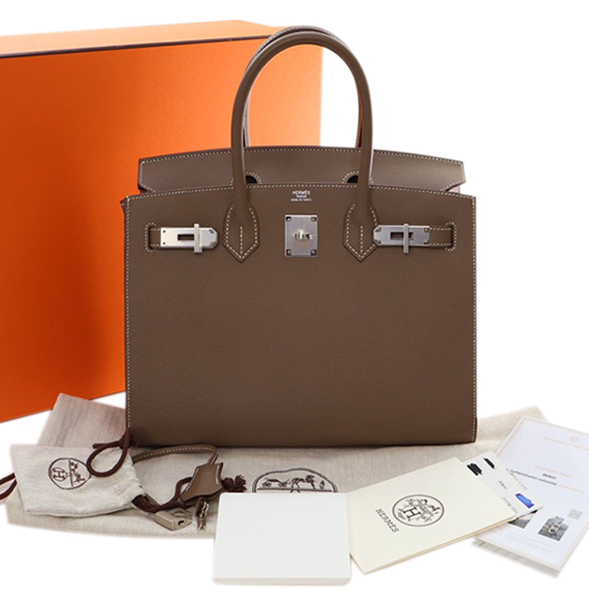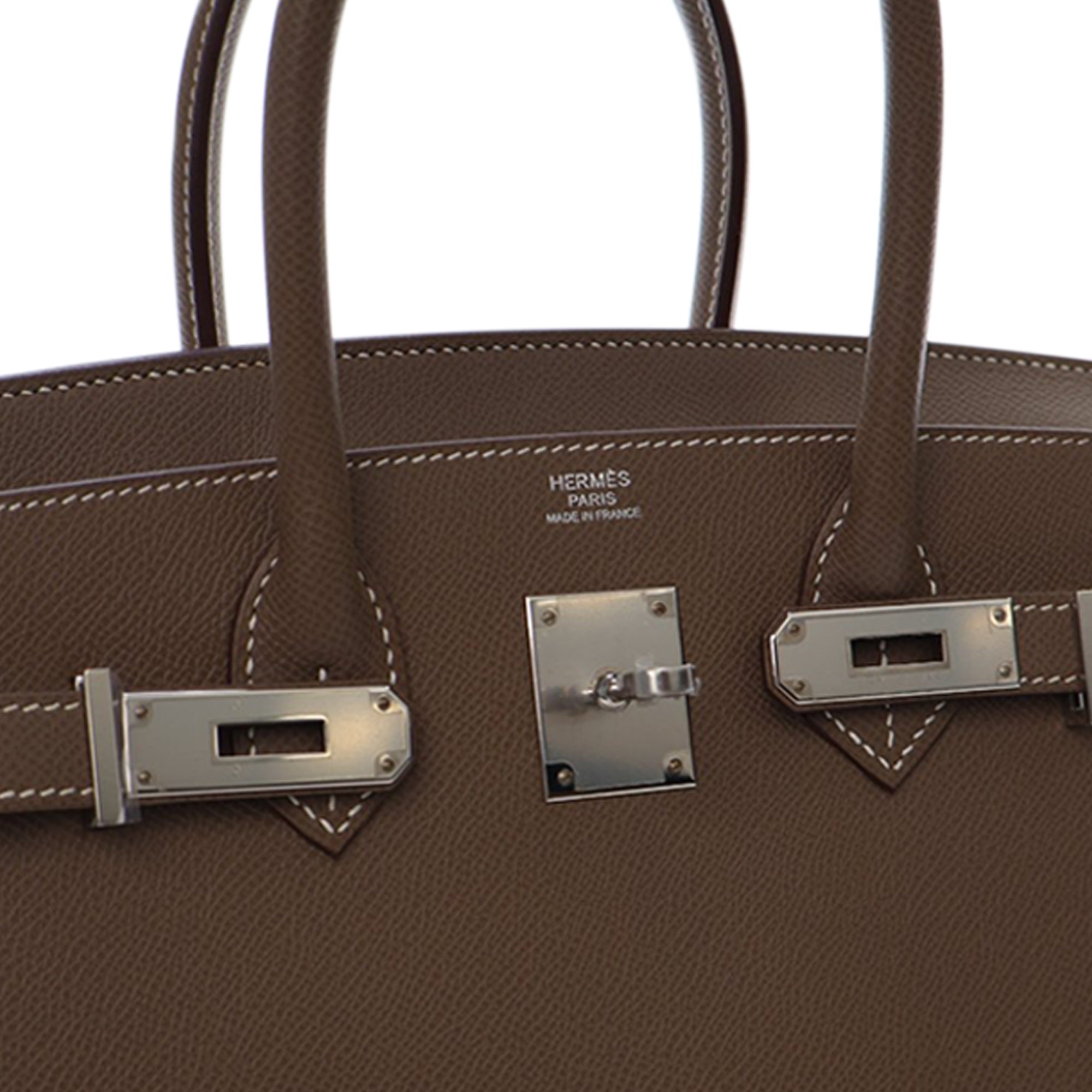 The Birkin 30 features an Epsom leather body in Etoupe color, rolled leather handles, a front flap with a metal lock closure, and interior zip and slip pockets. Inclusion: Dust bag, box. Retail Price: 45000.00