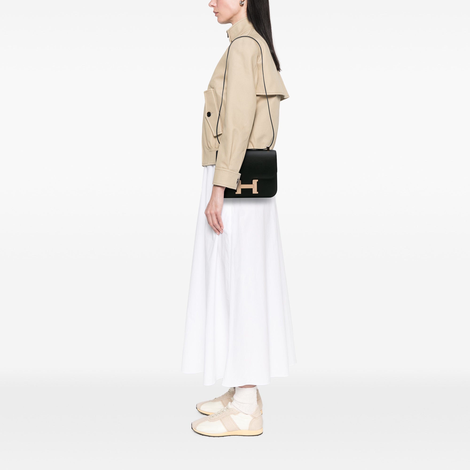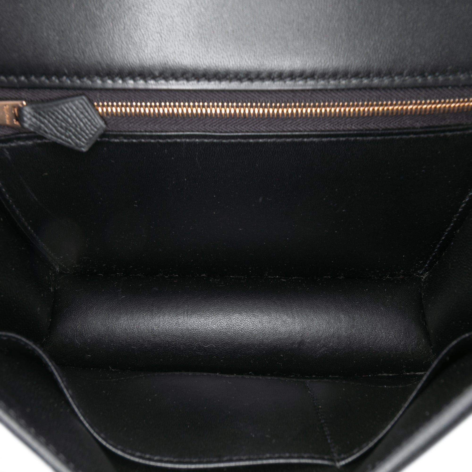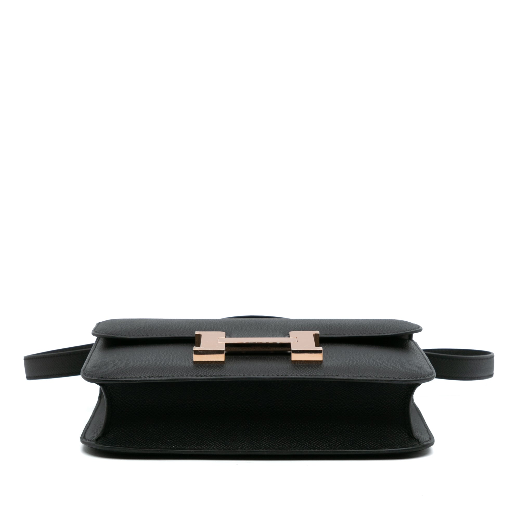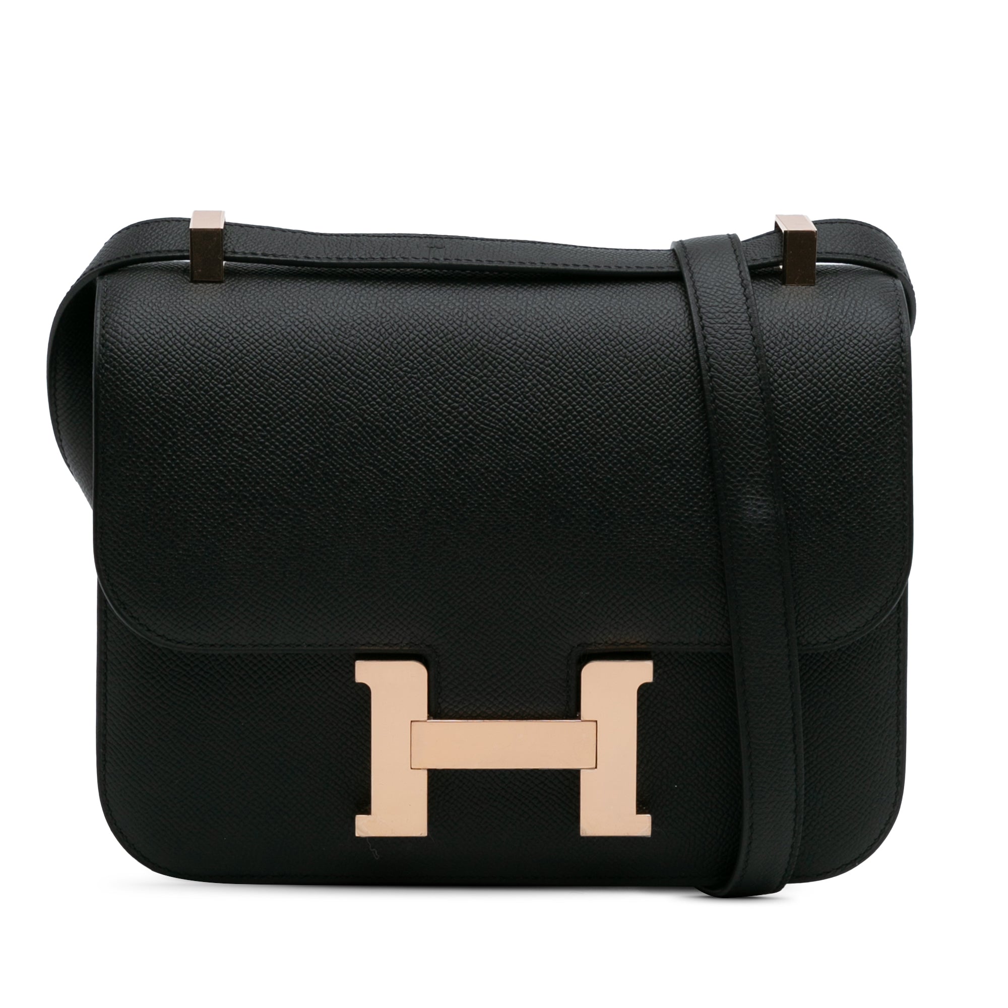 This Constance 24 features an Epsom leather body in Noir color, a flat leather shoulder strap, a front flap with H buckle closure, an exterior back slip pocket, and interior zip and slip pockets. Inclusion: Dust bag, box. Retail Price: 10960.00