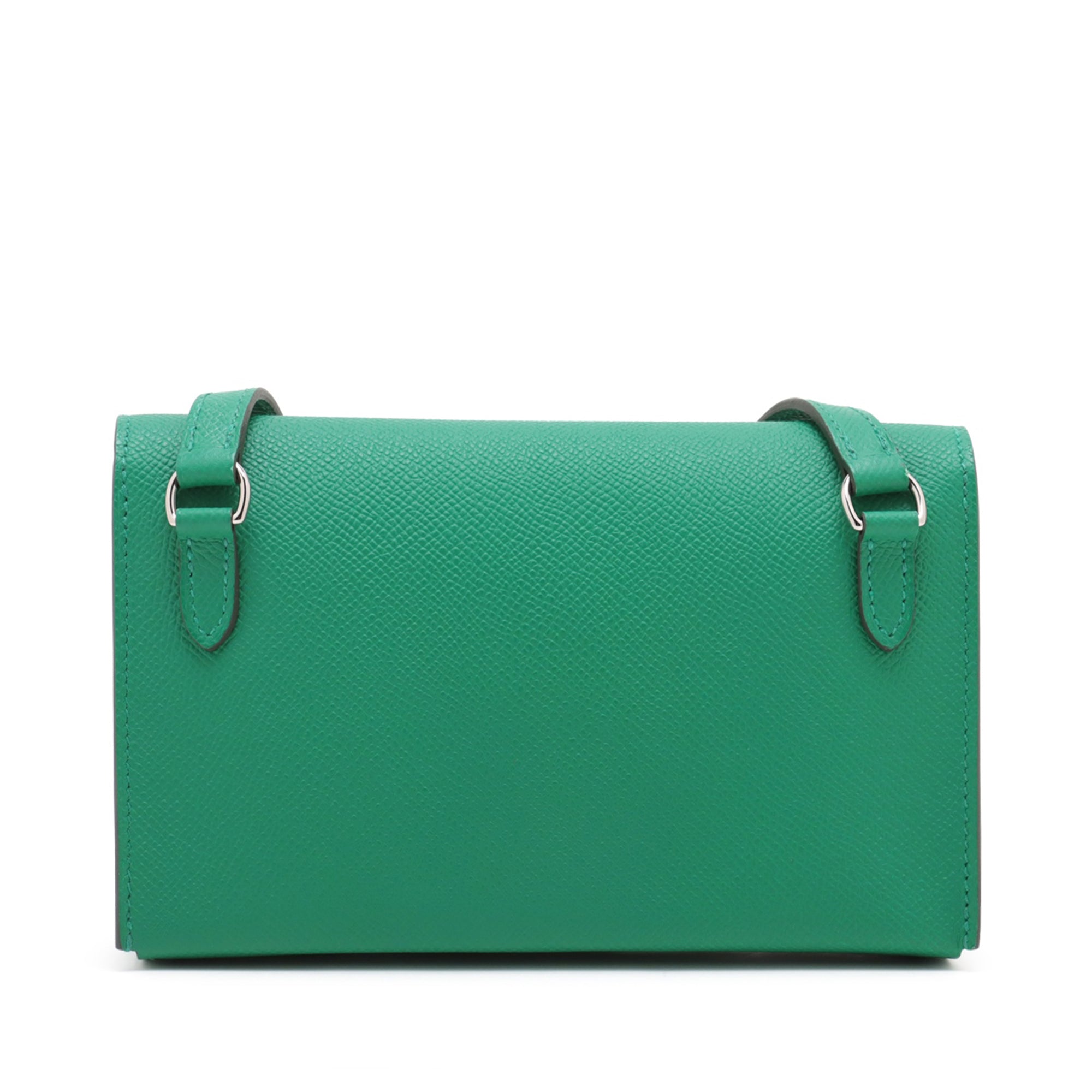 This Hermesnap wallet on strap features an Epsom leather body in Vert Vertigo color, an adjustable flat strap, a front flap with snap closures, and an interior slip pocket. Inclusion: box. Retail Price: 3750.00