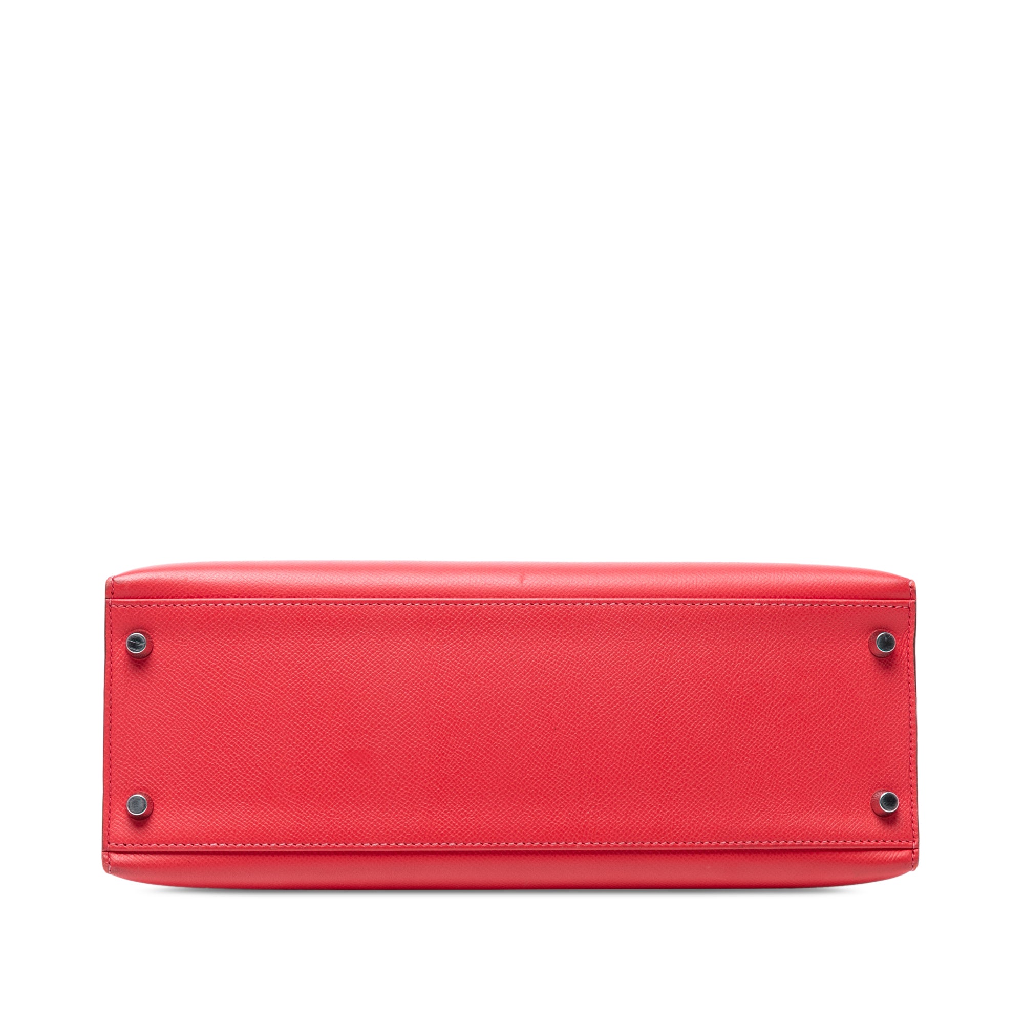 The Kelly Sellier 32 features an Epsom leather body in Bougainvillea color, a rolled leather top handle, a detachable flat leather shoulder strap, a flap with turn lock and pull through closure, and interior zip and slip pockets. Retail Price: 10000.00