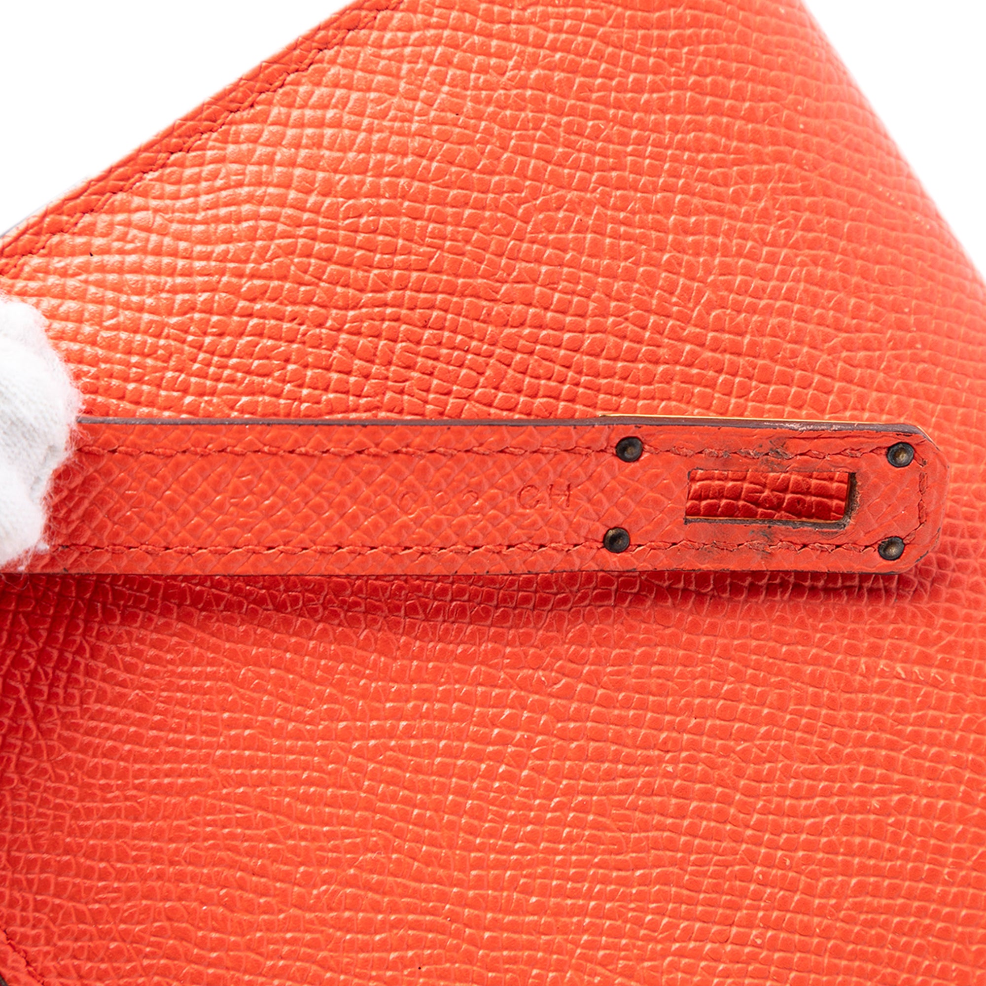 This Kelly long wallet features an Epsom leather body in Capucine color, a front turn lock closure, and interior zip and slip pockets. Retail Price: 2000.00