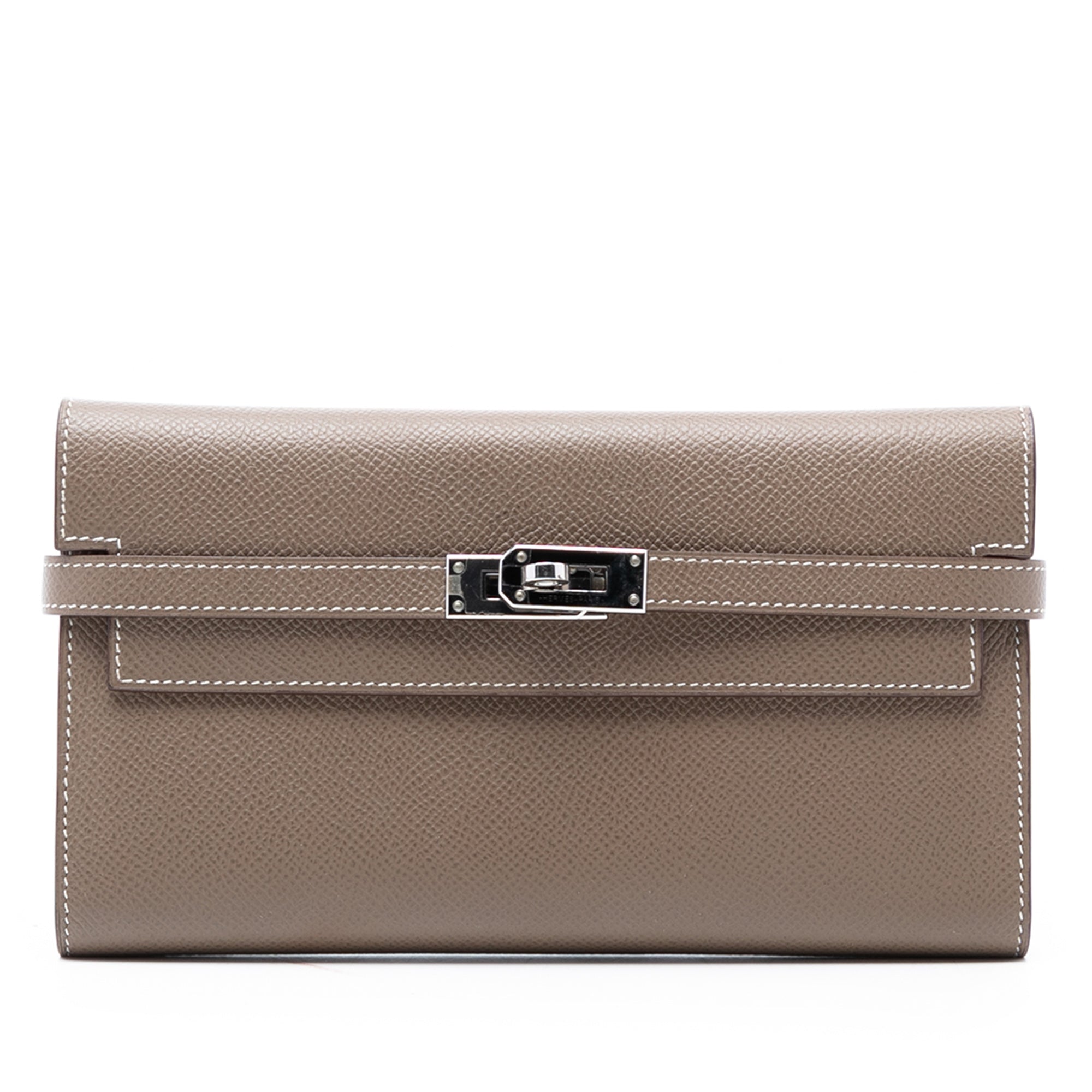 This Kelly wallet features an Epsom leather body in Etoupe color, a front flap with turn lock closure, and interior zip and slip pockets. Inclusion: box. Retail Price: 5050.00