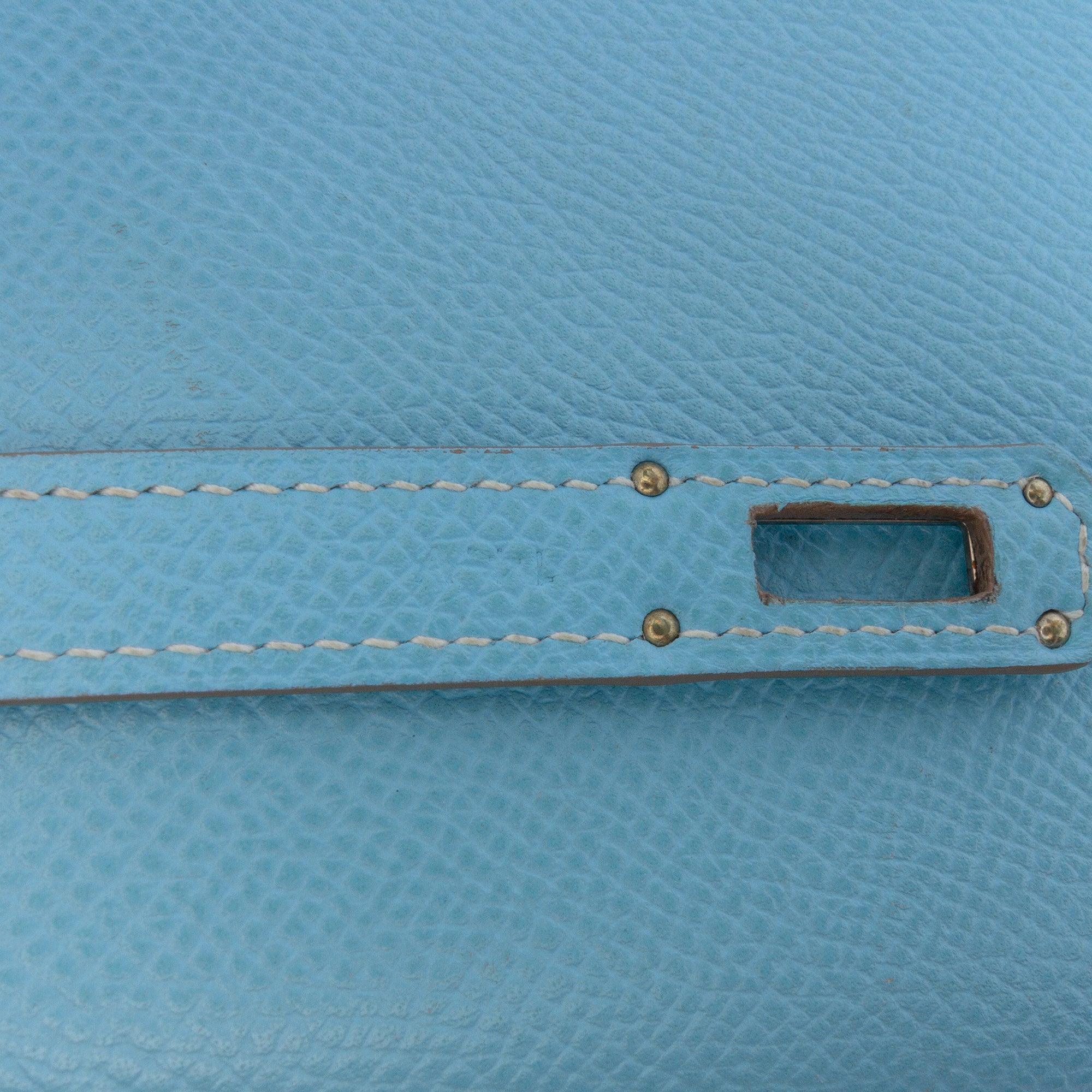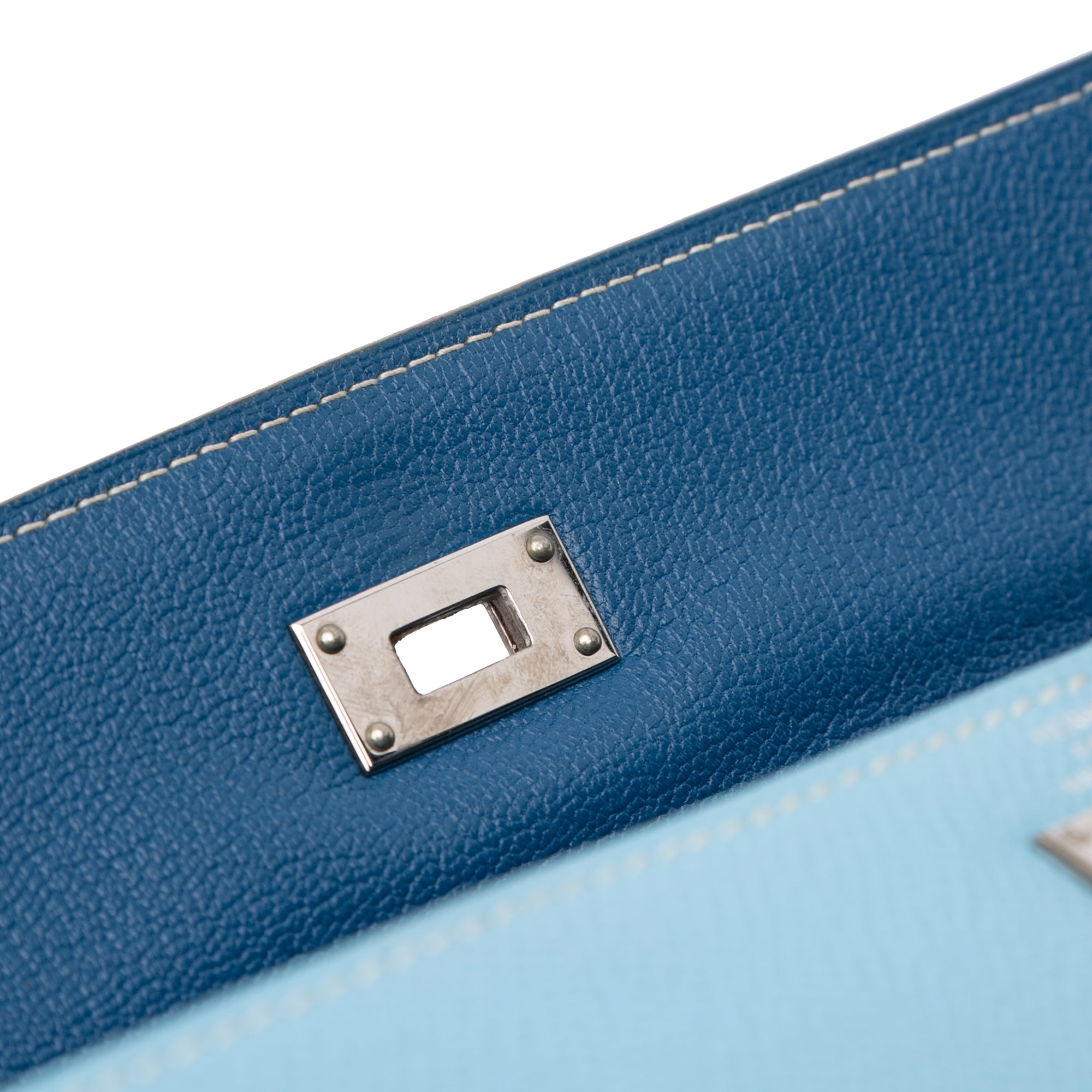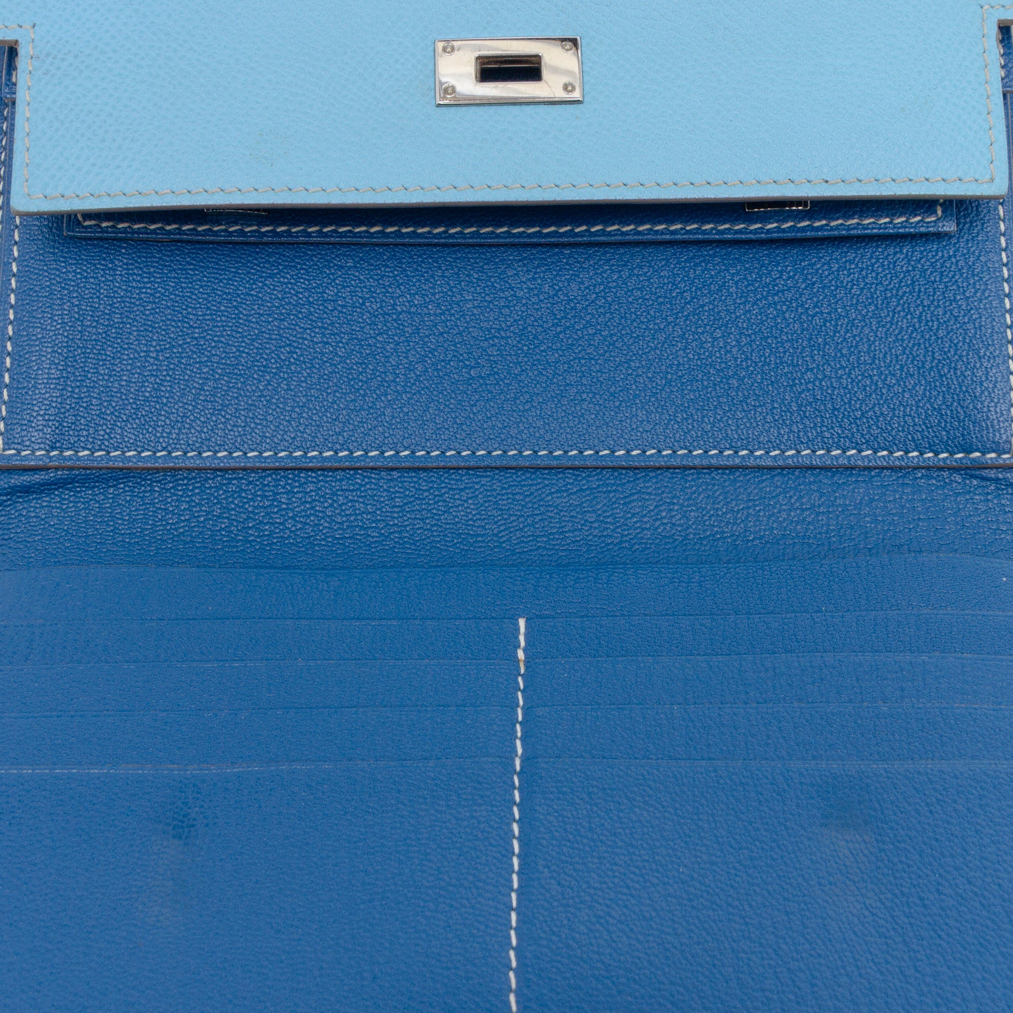 This Kelly wallet features an Epsom leather body in Blue Aztec color, a front flap with turn lock closure, and interior zip and slip pockets and card slots. Retail Price: 6140.00
