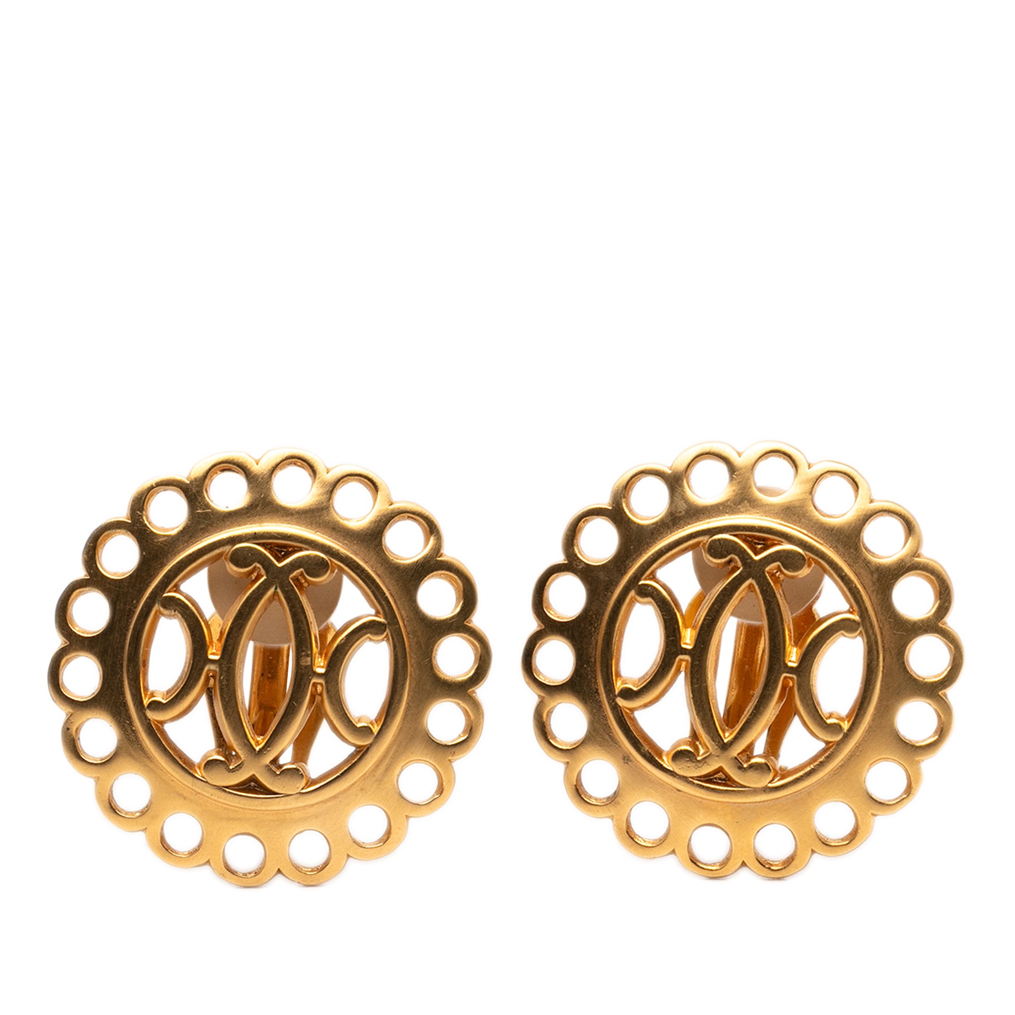 These earrings features a gold-plated metal body and clip on closures. Retail Price: 400.00