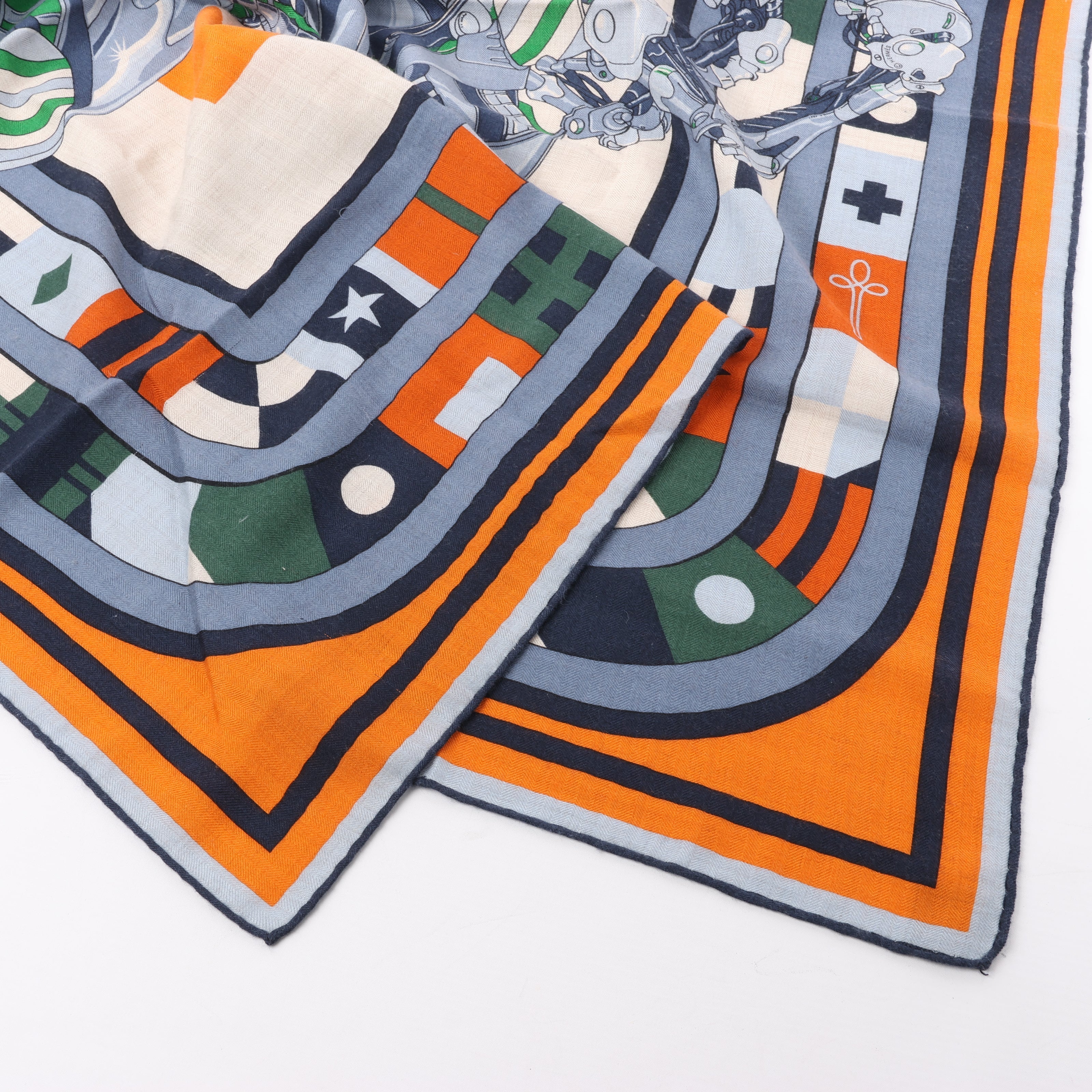 Hermès Carré 100 “ROBOCABAR” scarf in blue and orange blends futuristic charm with heritage. Featuring a robotic horse on a graphic border, this cashmere-silk square is bold, rare, and undeniably striking. A collector’s standout.