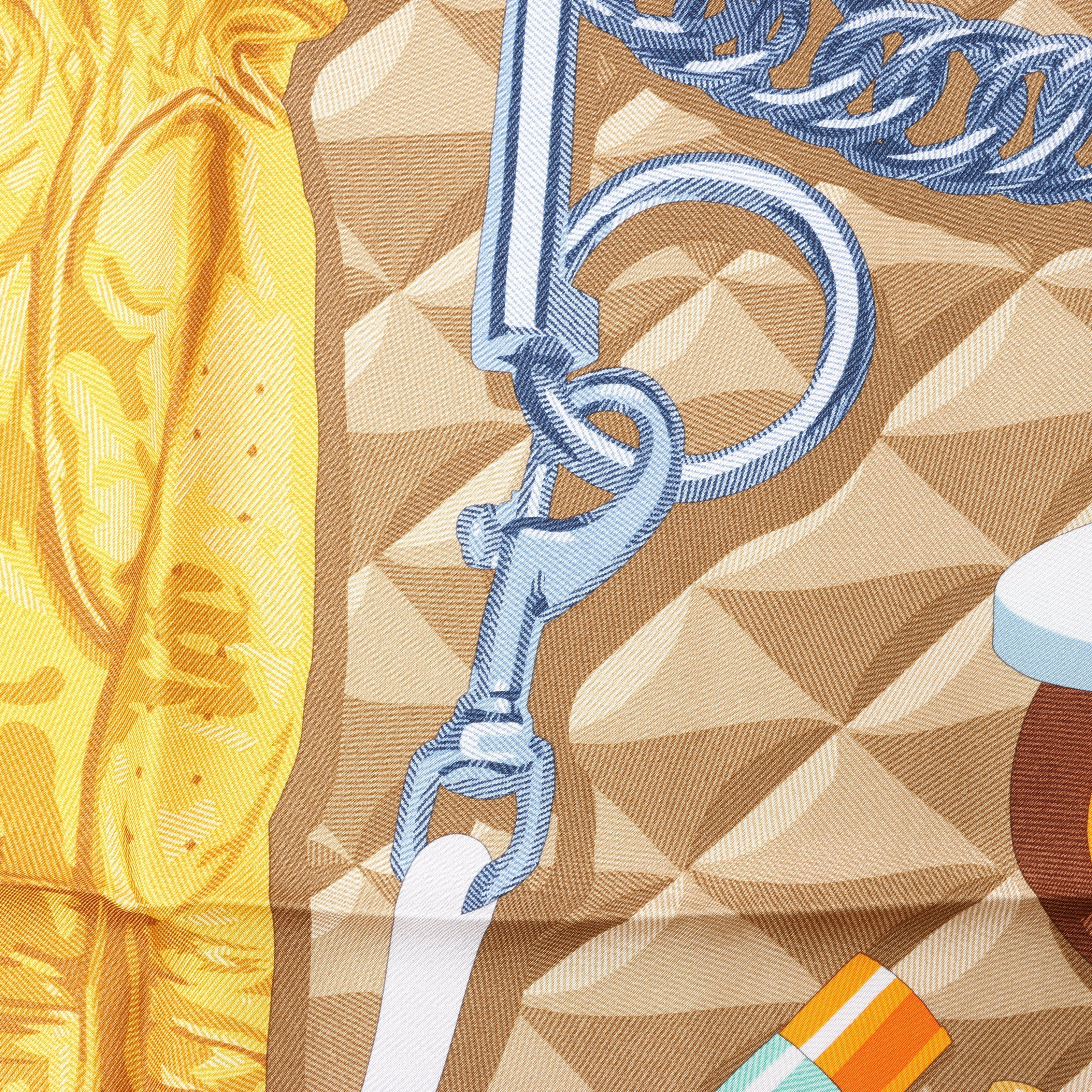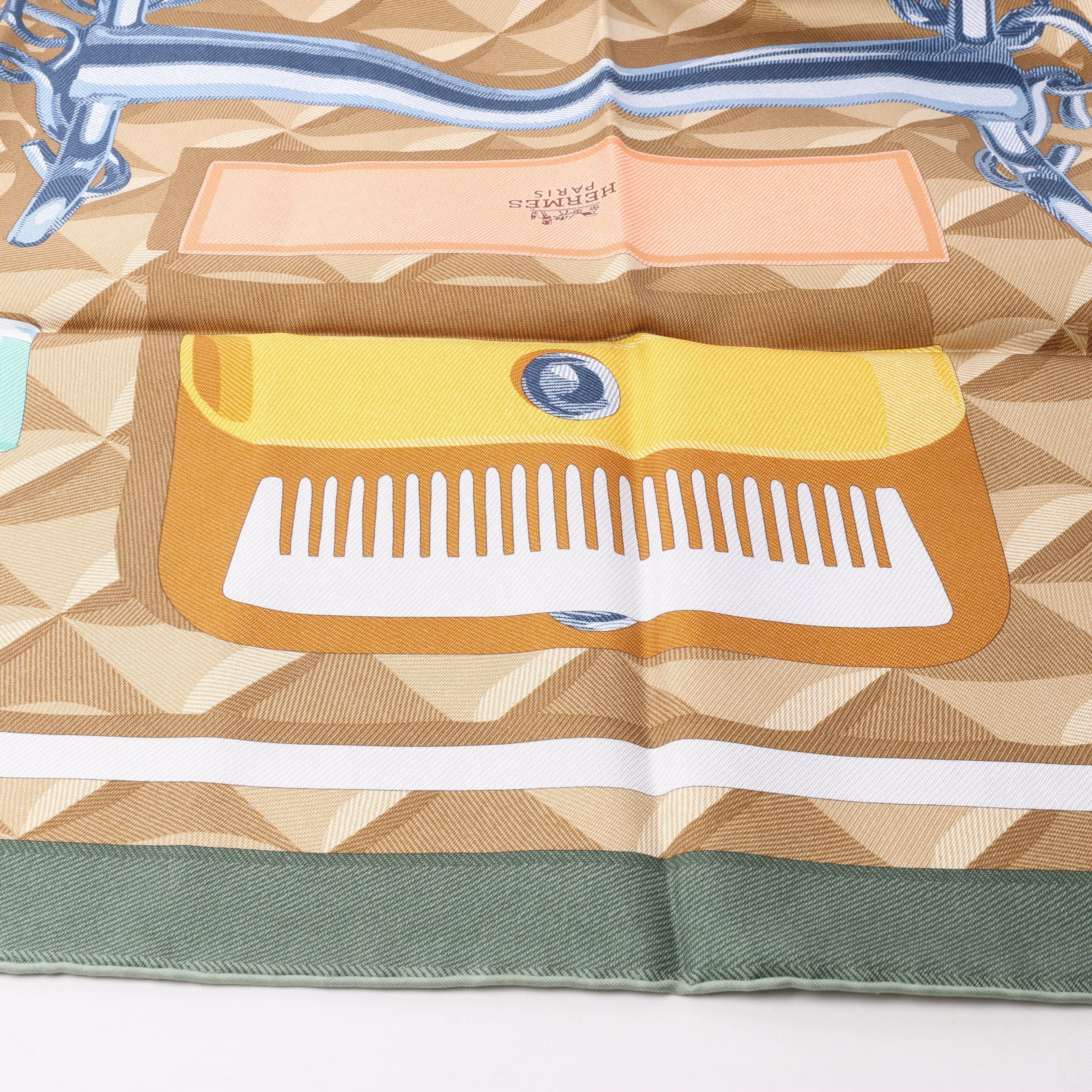 Hermès Carré 90 “BEAUTÉ COMPOSÉE” scarf in 100% silk, featuring a refined palette of green and beige with equestrian grooming and beauty tools. A whimsical yet elegant design that fuses classic Hermès themes with playful sophistication.