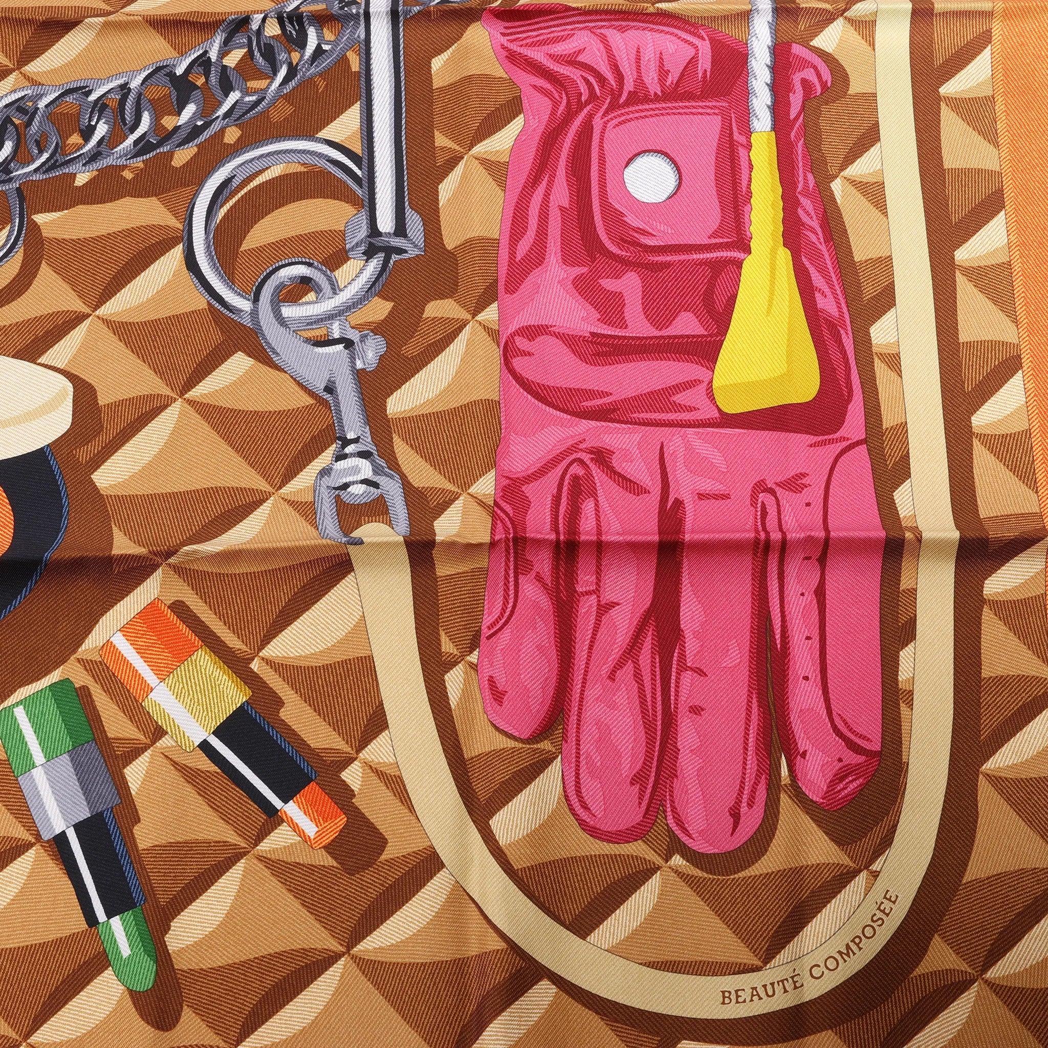 Showcase your flair with the Hermès Carré 90 "Beauté Composée" scarf in vibrant orange. Made from luxurious silk, this playful design fuses equestrian elements with beauty essentials—perfect for adding a chic, contemporary twist to your accessory collection.