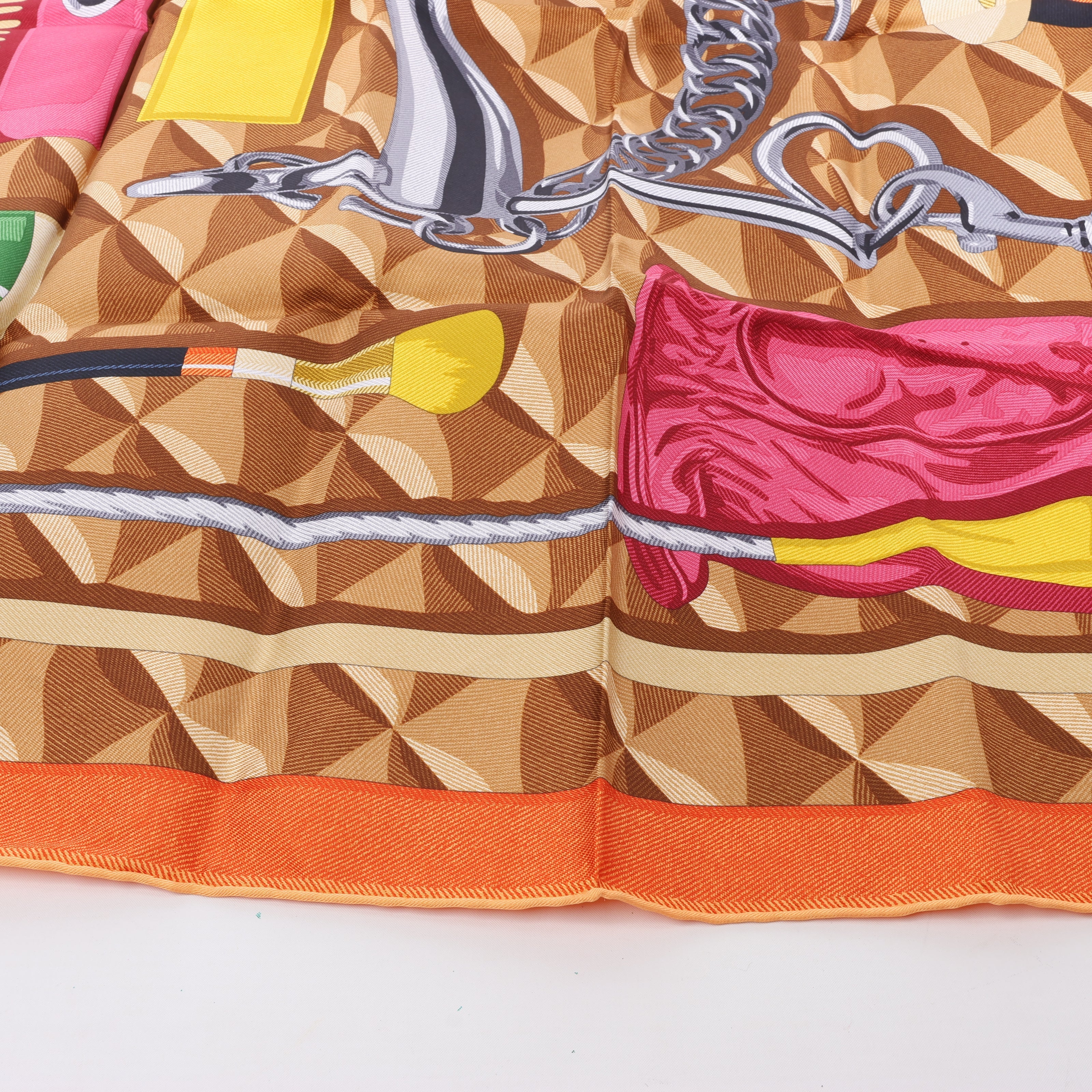Playful and chic, this Hermès Carré 90 "Beauté Composée" handkerchief in orange silk features a bold composition of makeup, gloves, and equestrian bits—blending fashion and whimsy in a vibrant, graphic design.