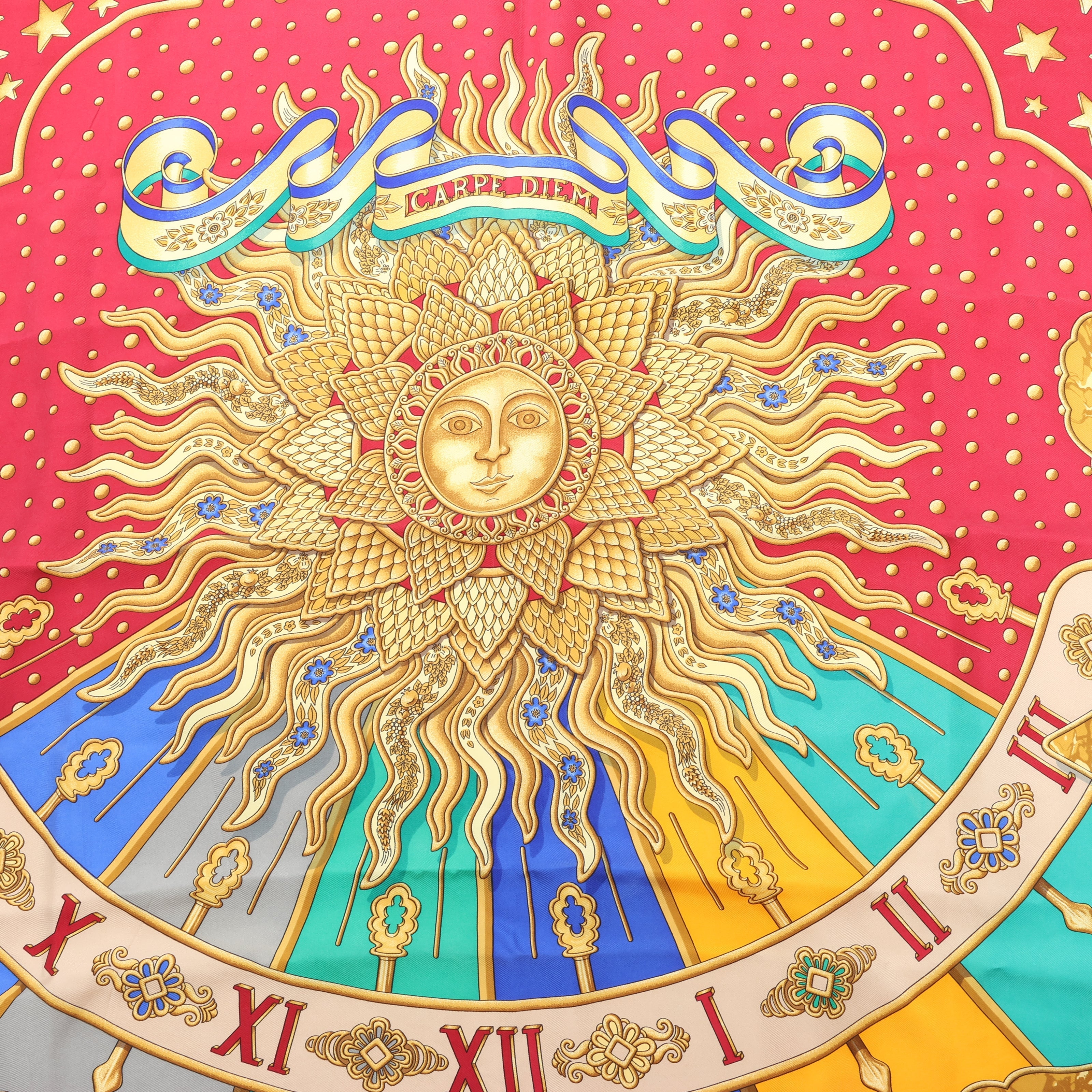 Hermès Carré 90 “Carpe Diem” scarf in 100% silk, featuring a radiant sun motif with baroque details and bold red, gold, and multicolor accents. A striking, collectible piece celebrating timeless elegance and vibrant Hermès artistry.