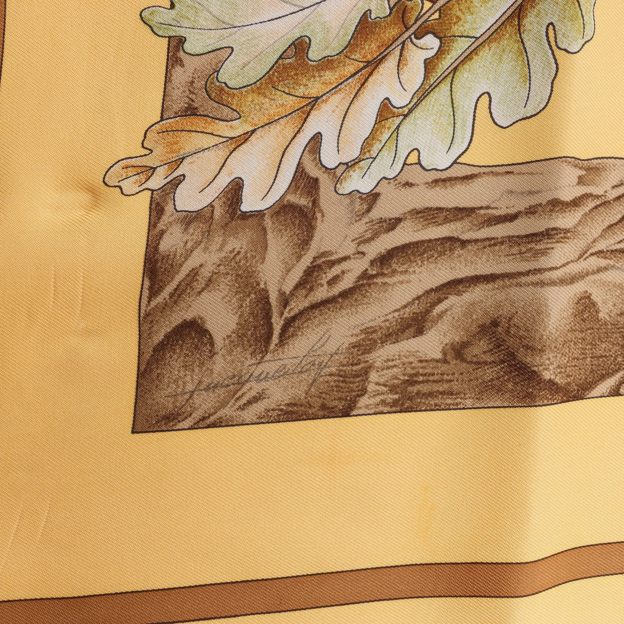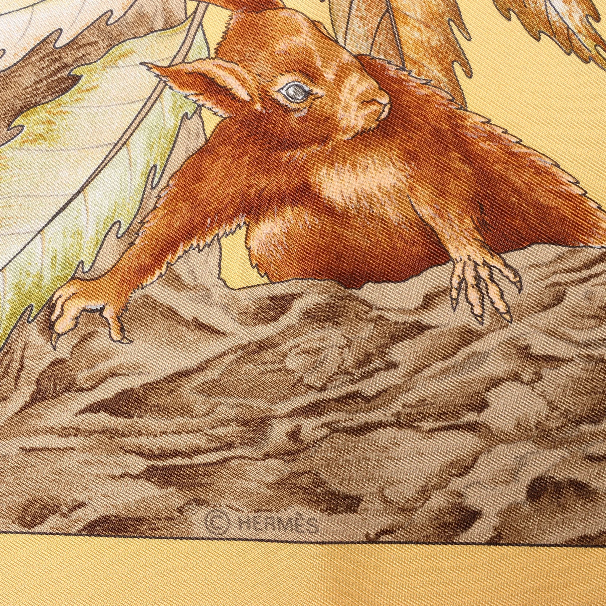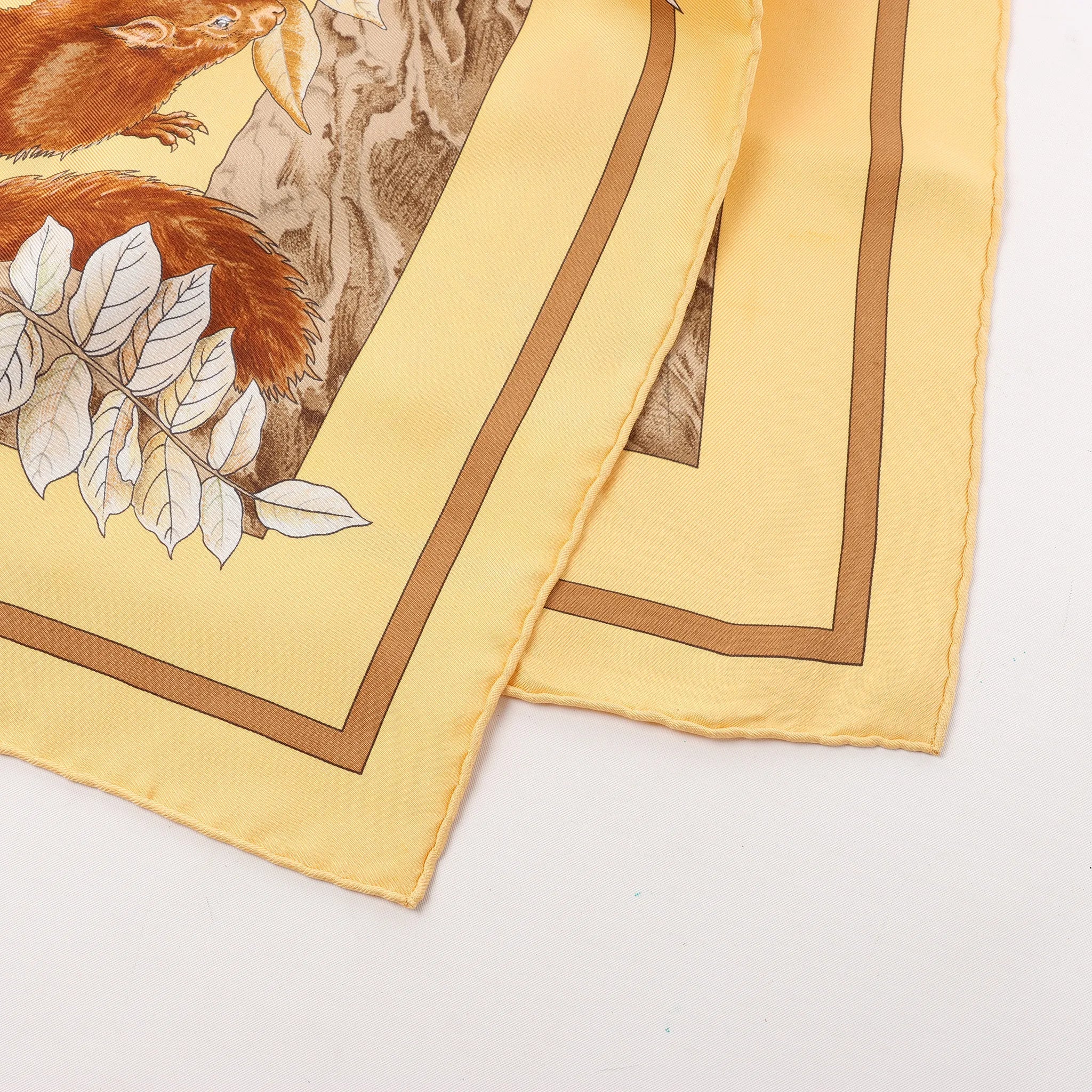 Delight in woodland whimsy with the Hermès Carré 90 "Casse Noisette" in cheerful yellow. Crafted from luxurious silk, this playful scarf features charming squirrels amidst autumn leaves—perfect for nature lovers and adding a cozy, elegant touch to any look.