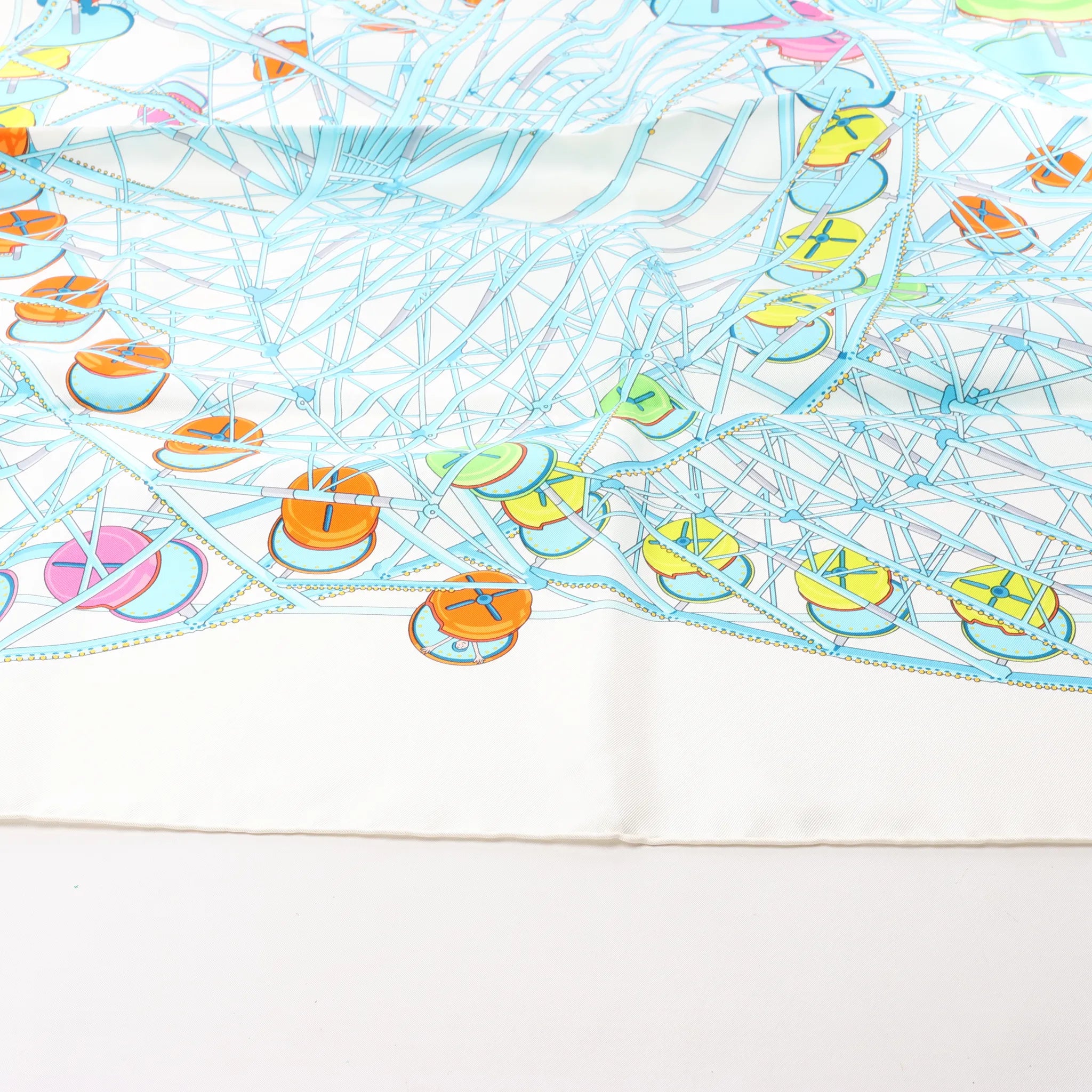 The Hermès Carré 90 "Grande Roue" in white and blue captures the whimsical charm of a Ferris wheel in motion. Crafted from luxurious silk, this vibrant scarf features pastel-colored gondolas and intricate structural details—perfect for playful, modern styling.