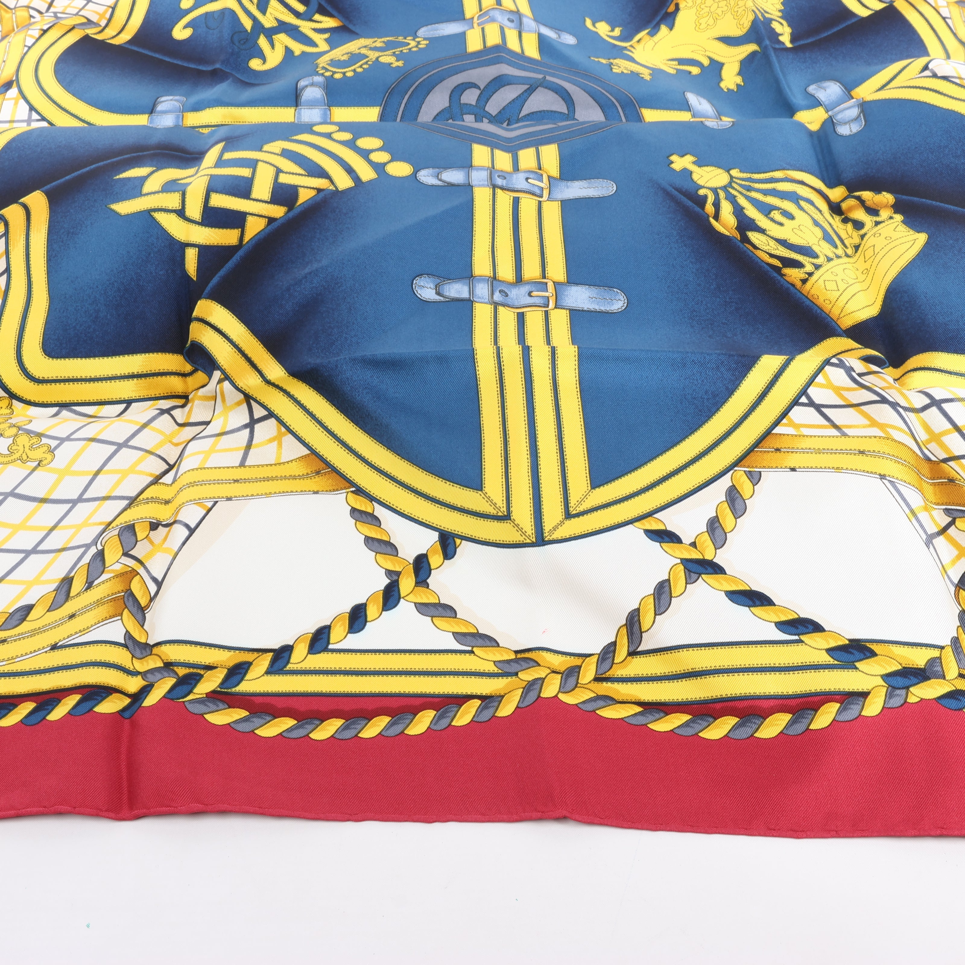 Regal and bold, this Hermès Carré 90 "Grande Tenue" silk handkerchief in burgundy features ornate crests, crowns, and braided detailing in rich gold and navy—an elegant nod to ceremonial equestrian attire.