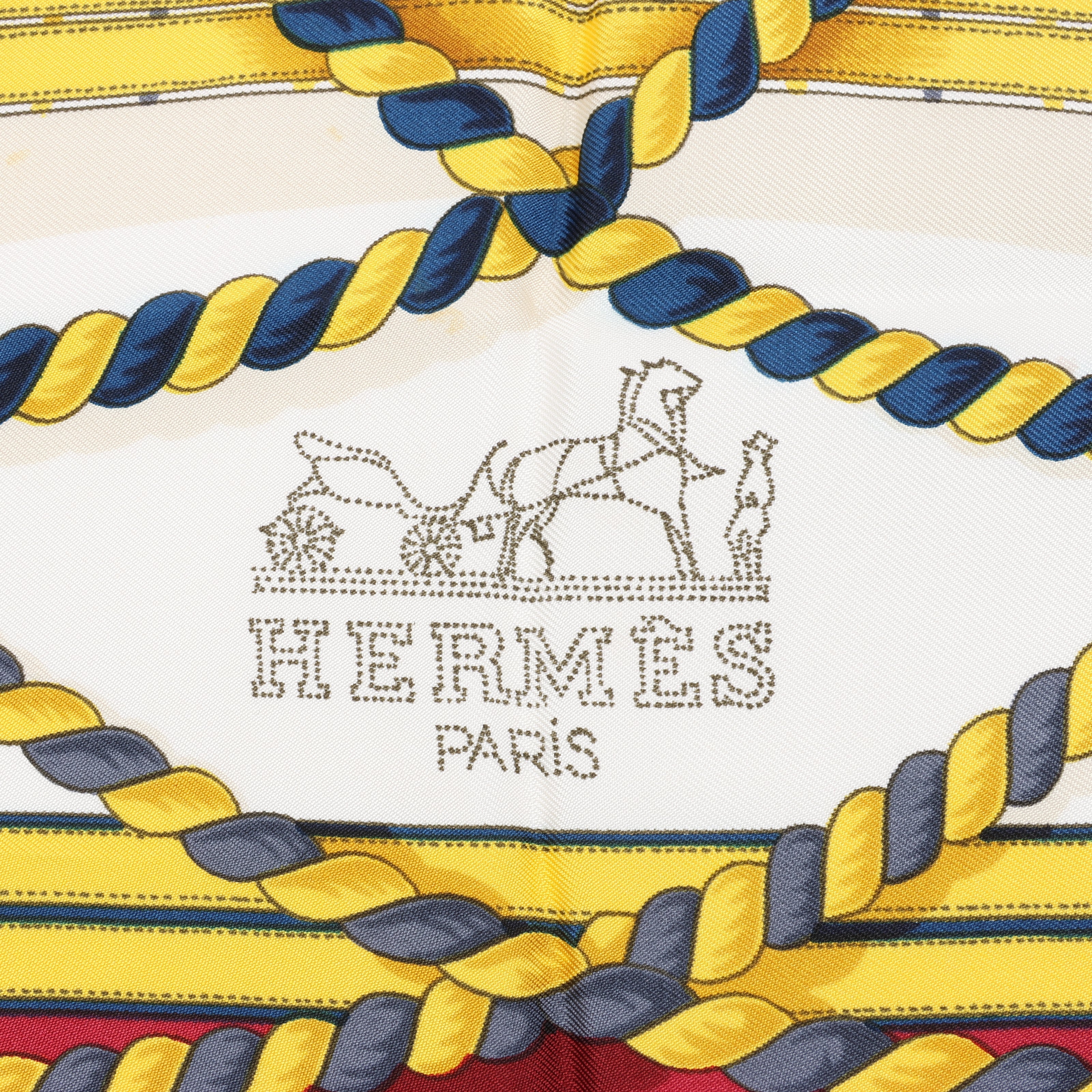 Brand: HermesModel: Carre 90Size: 90x90 cm Condition: ExcellentCondition Details: Gently worn with marked areas and a removed tag — please refer to photos for full condition.Main Colour: BurgundyColours: Gold, NavyMain material: SilkManufactured In: FranceComes With: -