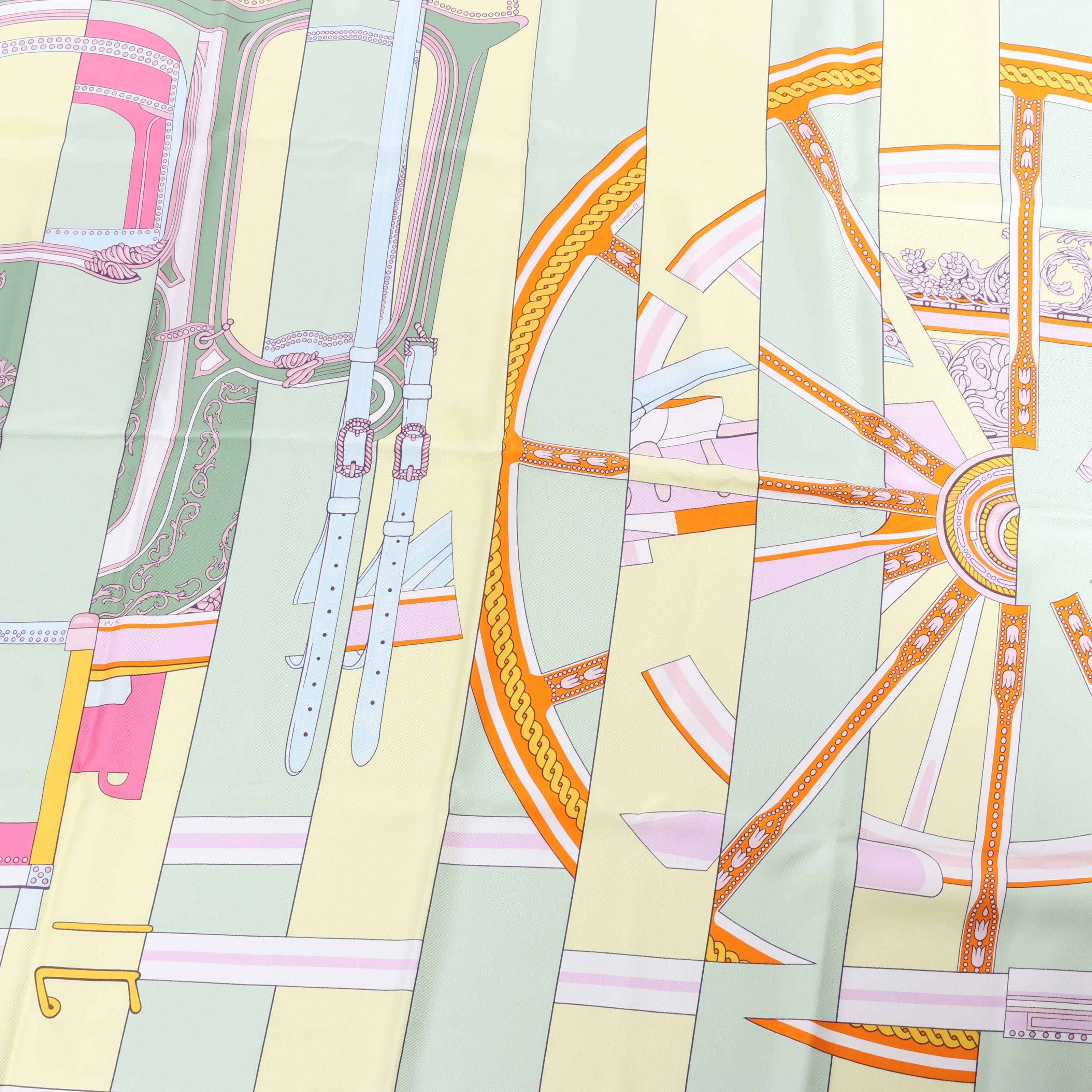 This elegant Hermès silk scarf presents the "La Berline Bayadère" design, showcasing a refined carriage and wheel motif in soft, pastel hues. Striped in alternating bands of pale yellow, mint green, and blush pink, the artwork highlights intricate carriage details, leather harnesses, and ornate wheel spokes accented in bright orange. The design is framed with a delicate lavender and white patterned border. Made from luxurious 100% silk twill with hand-rolled edges, this carré blends sophistication with a light, springtime palette, making it an effortlessly chic accessory.