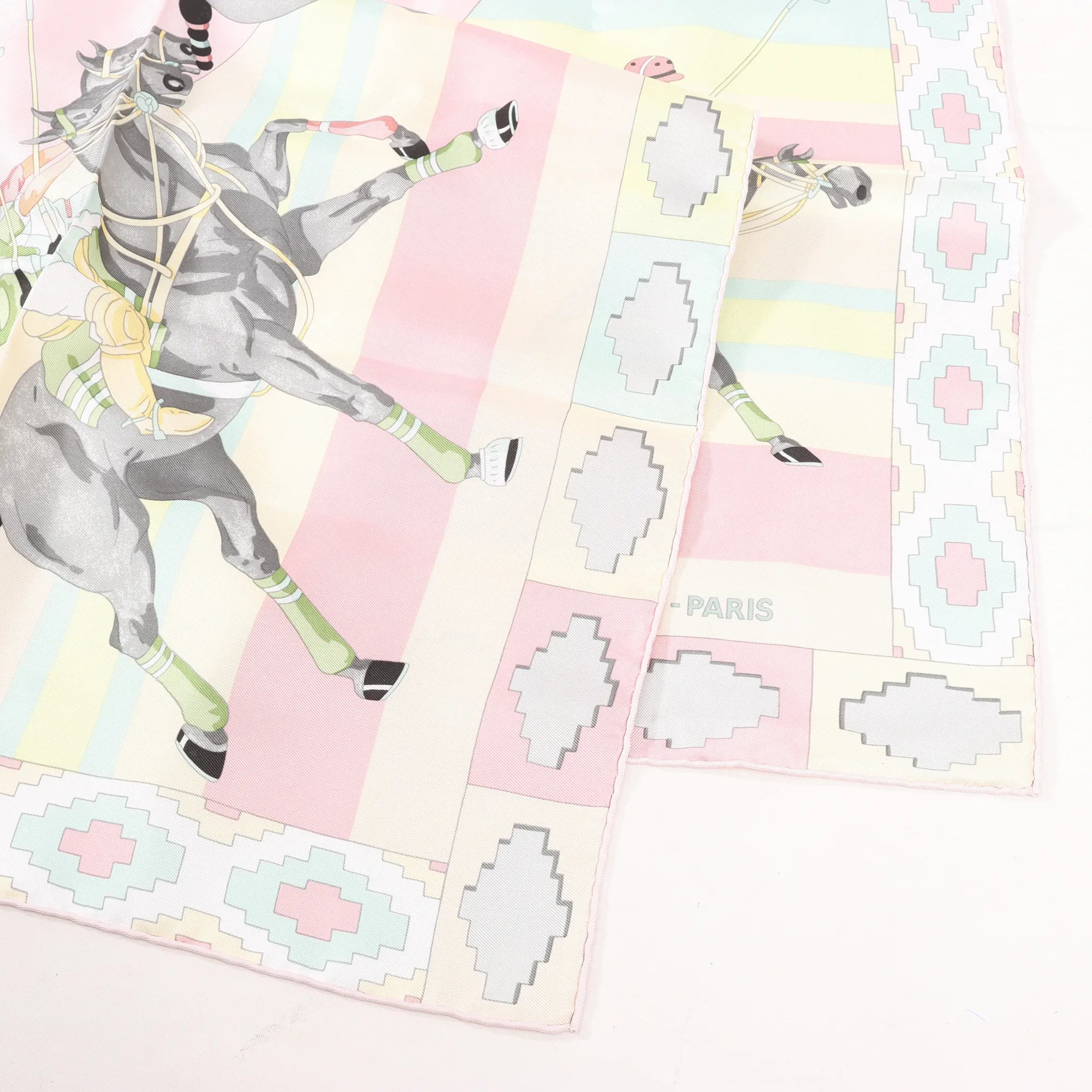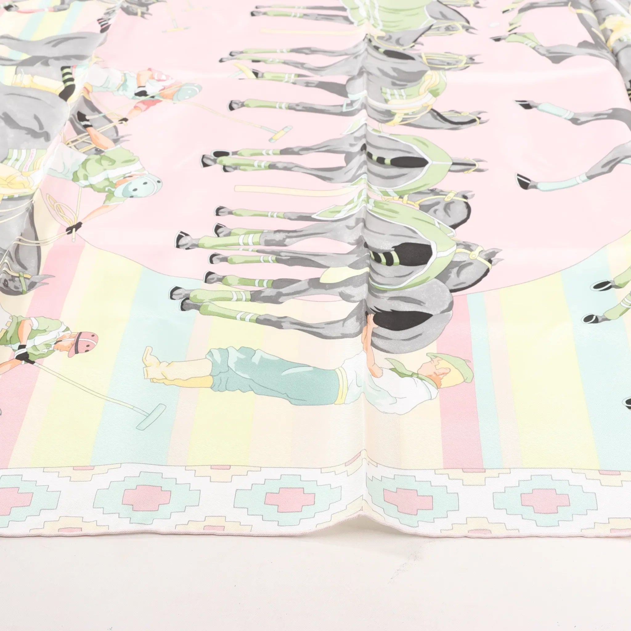 The Hermès Carré 90 "Les Poneys de Polo" scarf in pink silk showcases a dynamic equestrian motif with pastel hues - crafted in luxurious silk twill for timeless elegance and collectible charm.
