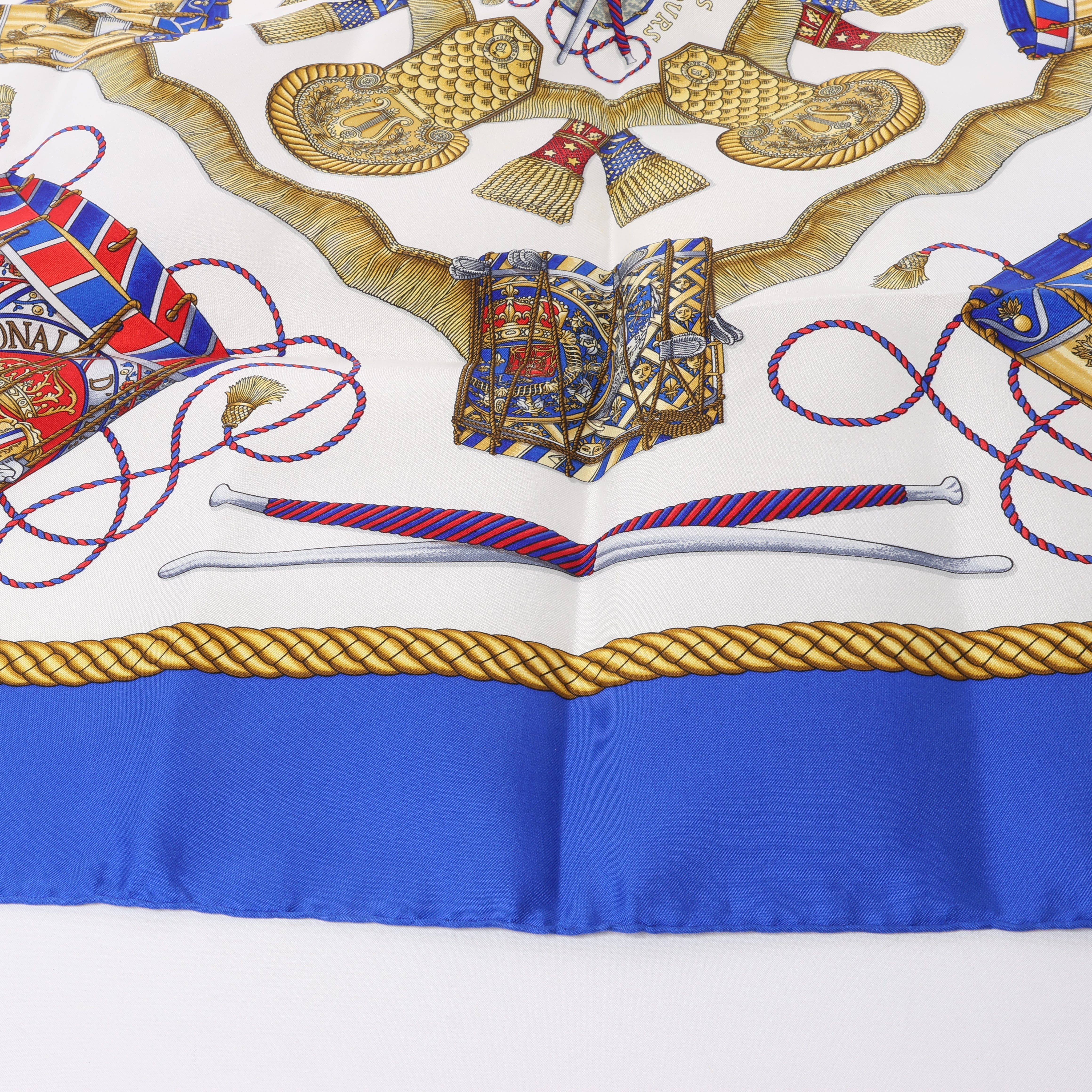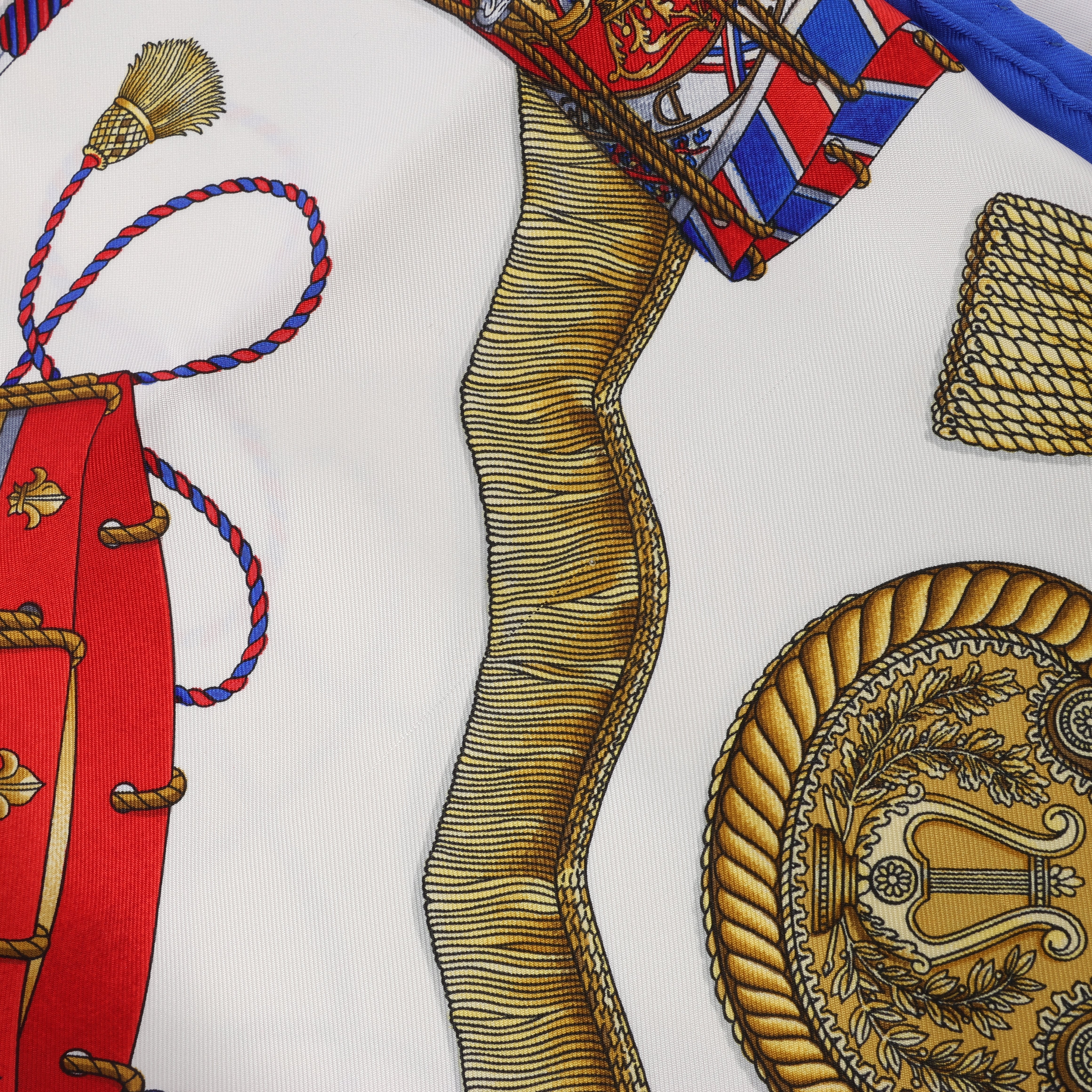 Hermès Carré 90 "Les Tambours" scarf in vibrant blue silk features regal drums, cords, and military motifs in rich red, gold, and navy tones. Crafted from 100% silk, this striking piece echoes ceremonial elegance and timeless luxury.