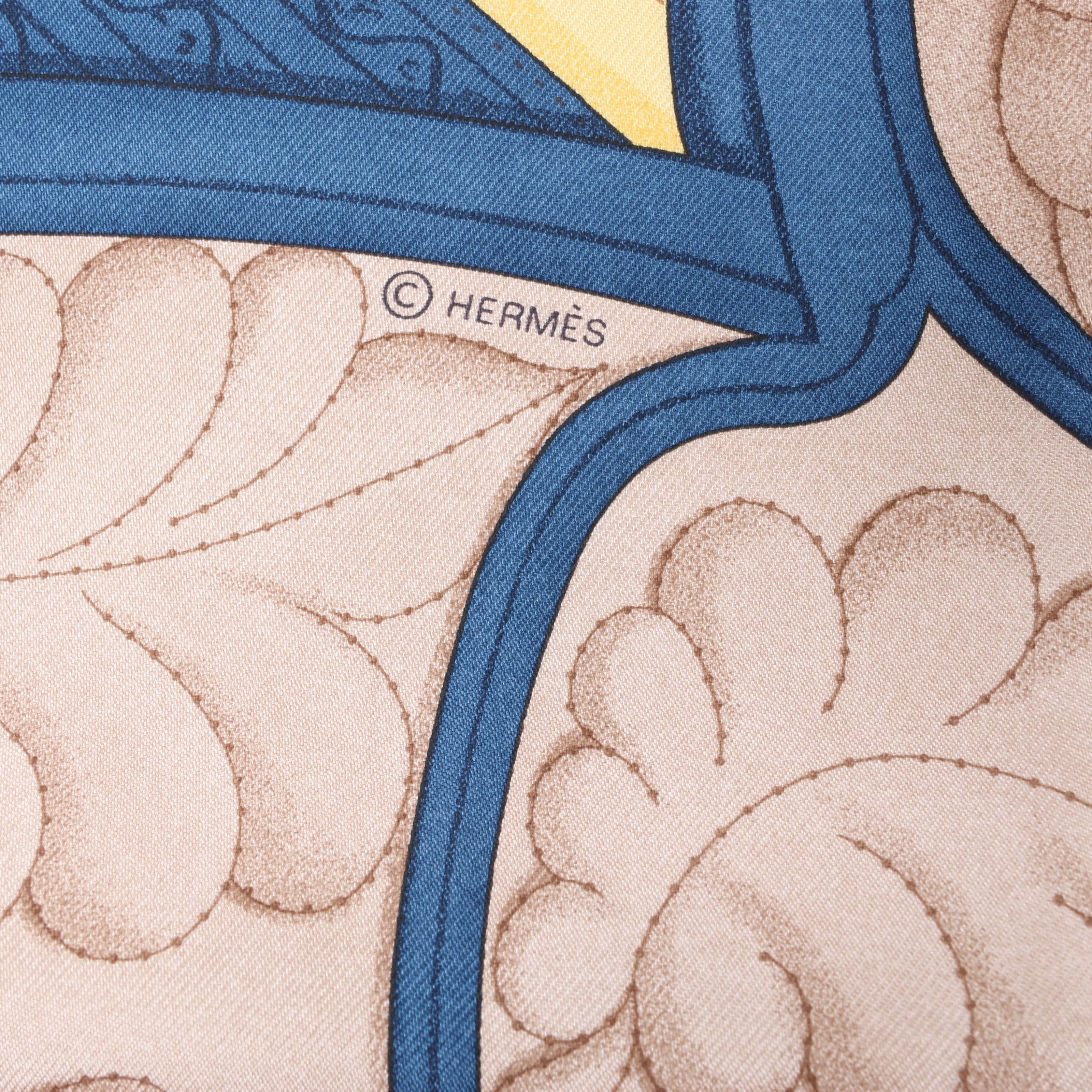 Brand: HermesSize: 90x90 cm Condition: Never worn with tagCondition Details: -Main Colour: OrangeColours: Blue, BeigeMain material: 100% silkManufactured In: FranceComes With: Box, brand tag