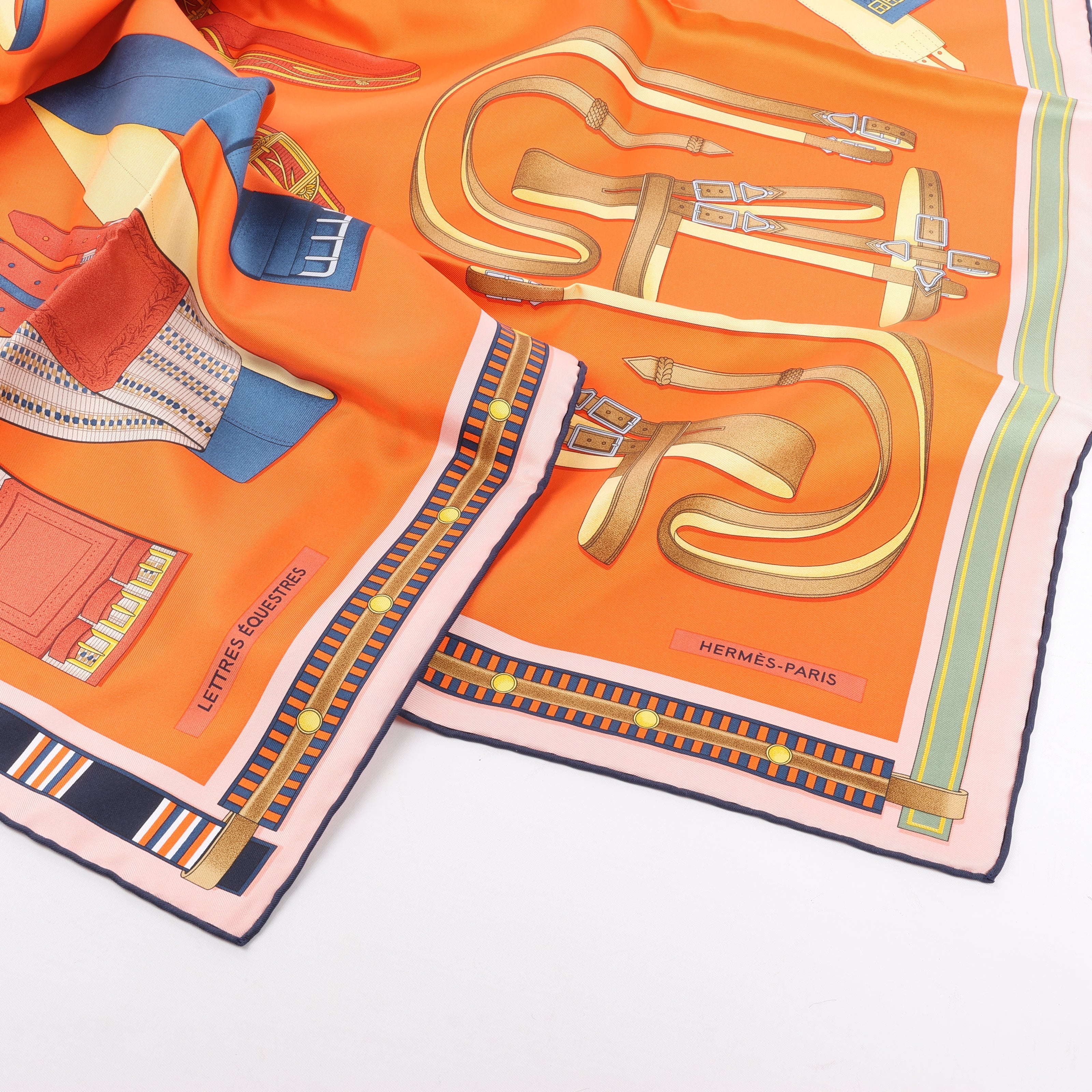 Hermès Carré 90 “Lettres Equestres” scarf in 100% silk, featuring bold equestrian-inspired lettering and tack details on a vibrant orange background. A playful yet refined piece that captures Hermès' equestrian heritage with striking color.