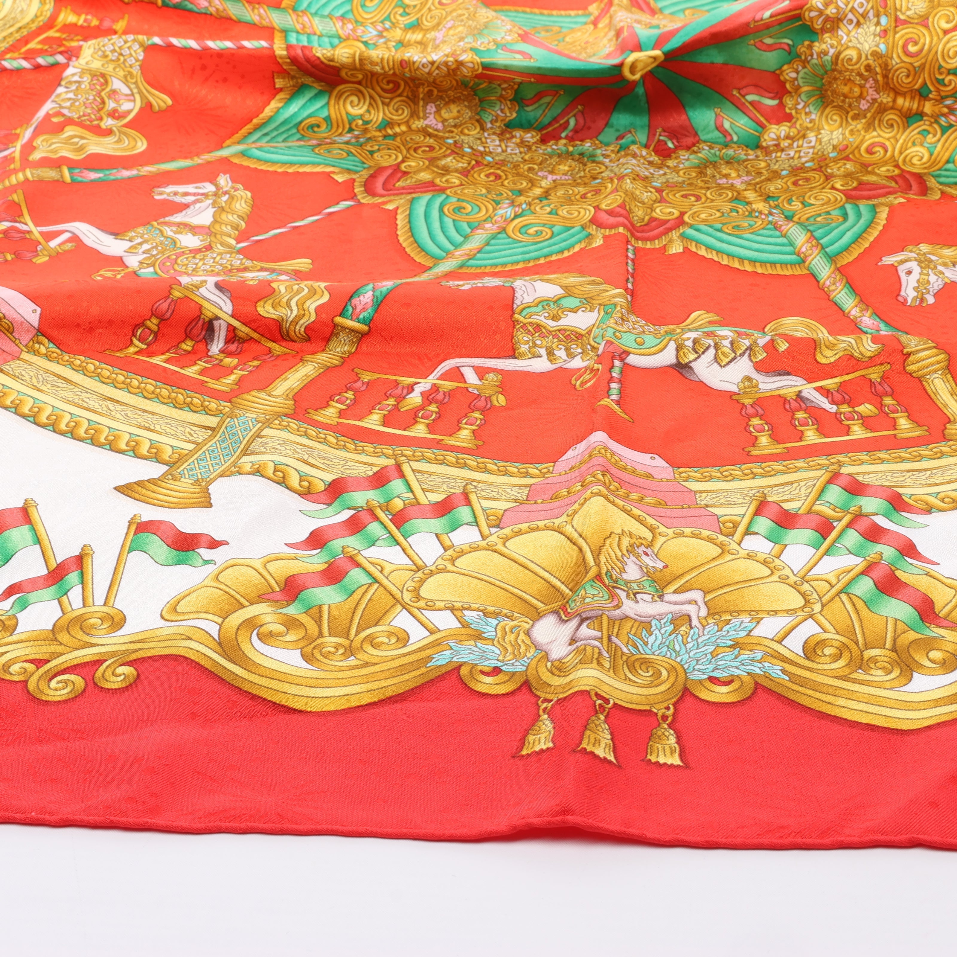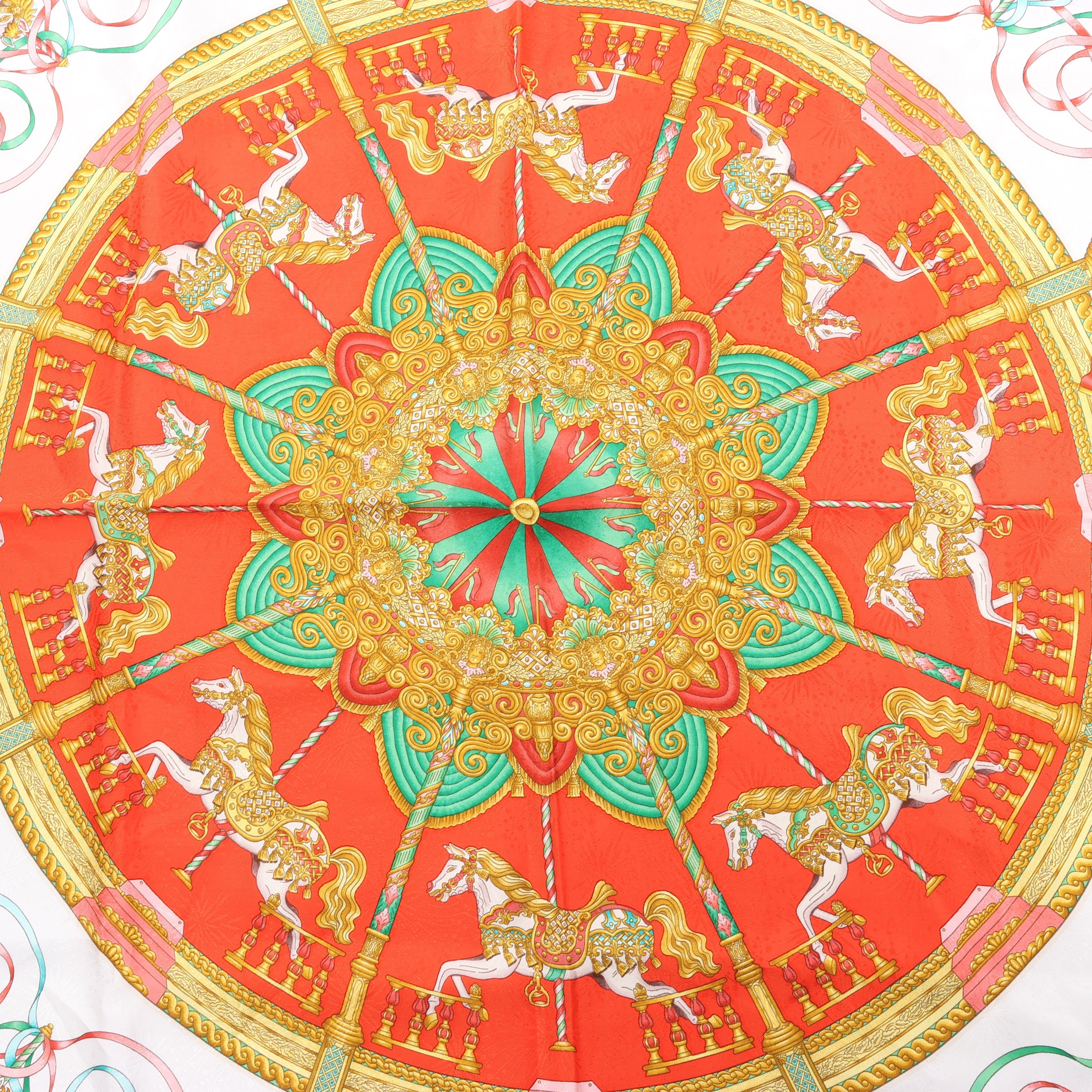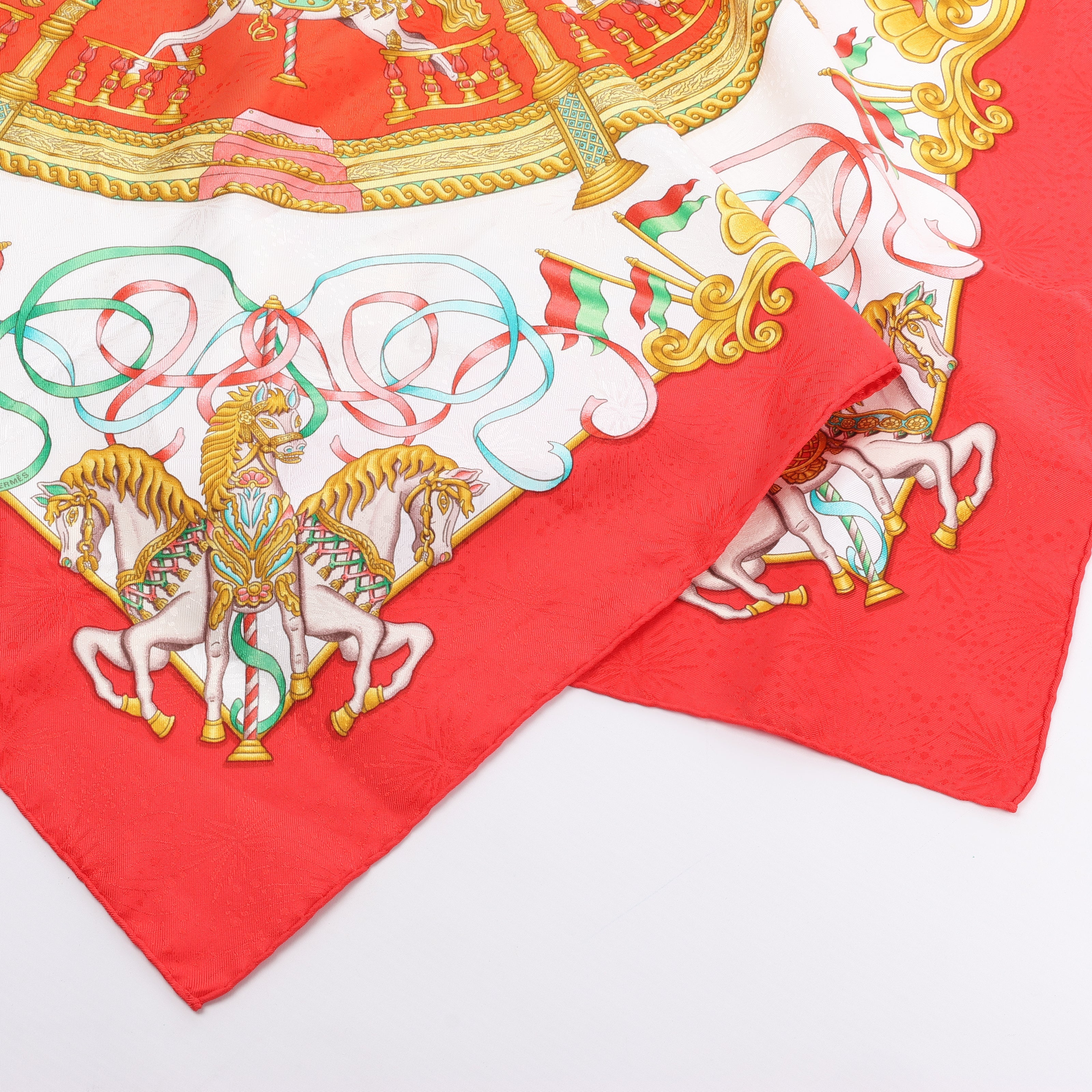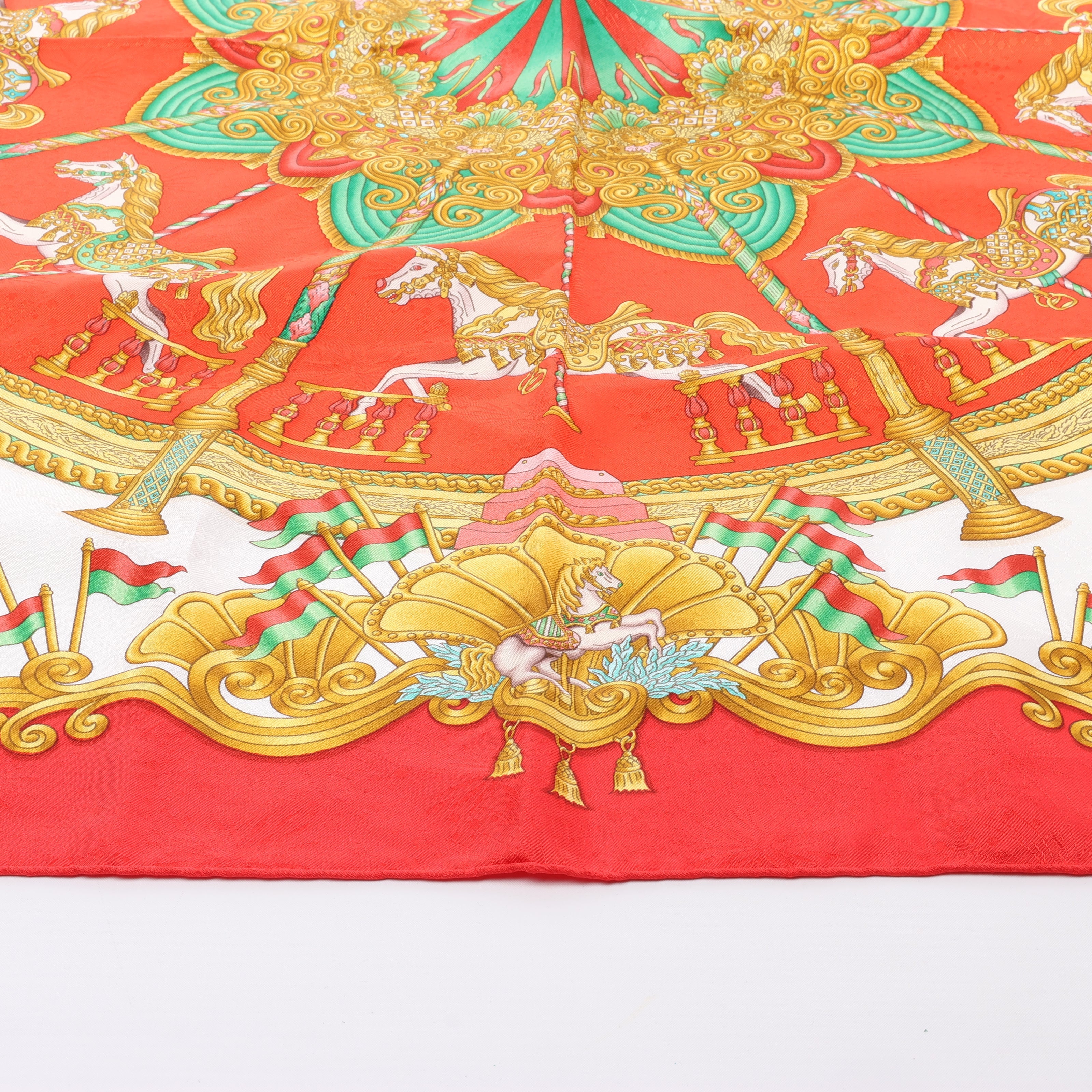 Hermès Carré 90 “Lunapark” silk scarf in vibrant red showcases a dazzling carousel-inspired motif with ornate horses and festive flourishes—an exuberant celebration of whimsical elegance and timeless craftsmanship.