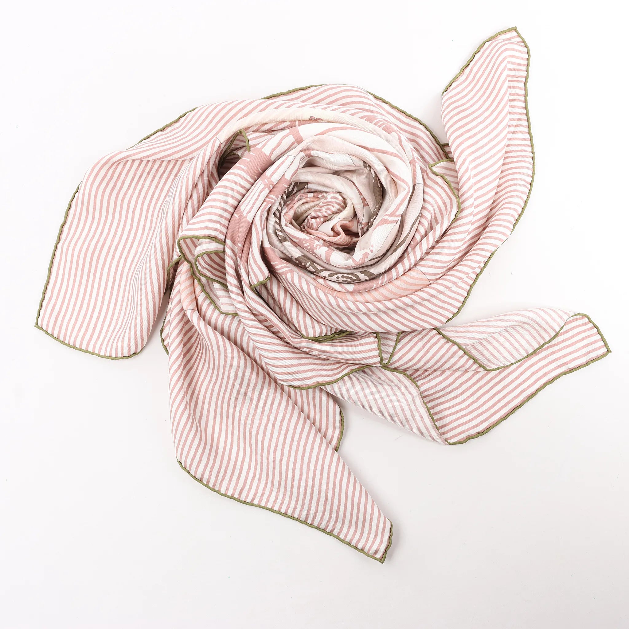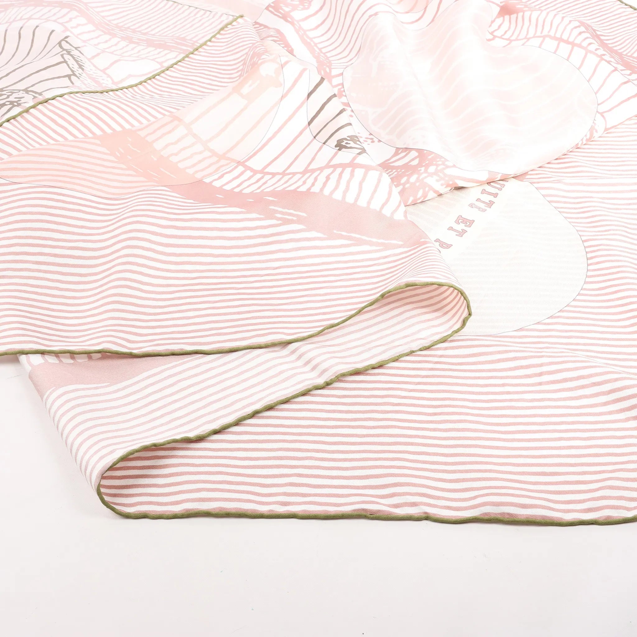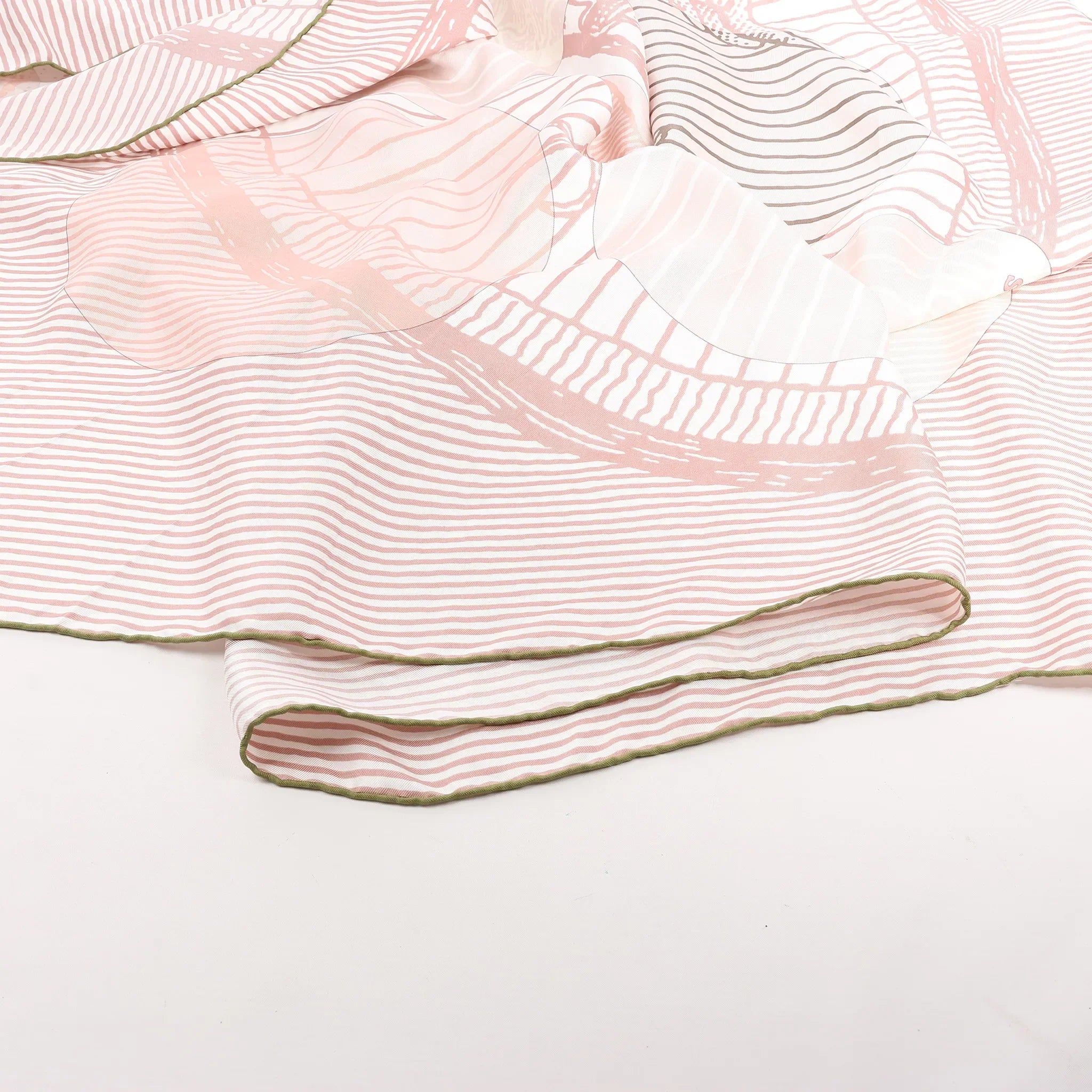 The Hermès Carré 140 "Suite et Poursuite" in pink is a refined silk scarf that blends elegance with movement. Featuring layered circular patterns, equestrian elements, and intricate linework, this soft-toned piece is perfect for a graceful, modern statement.