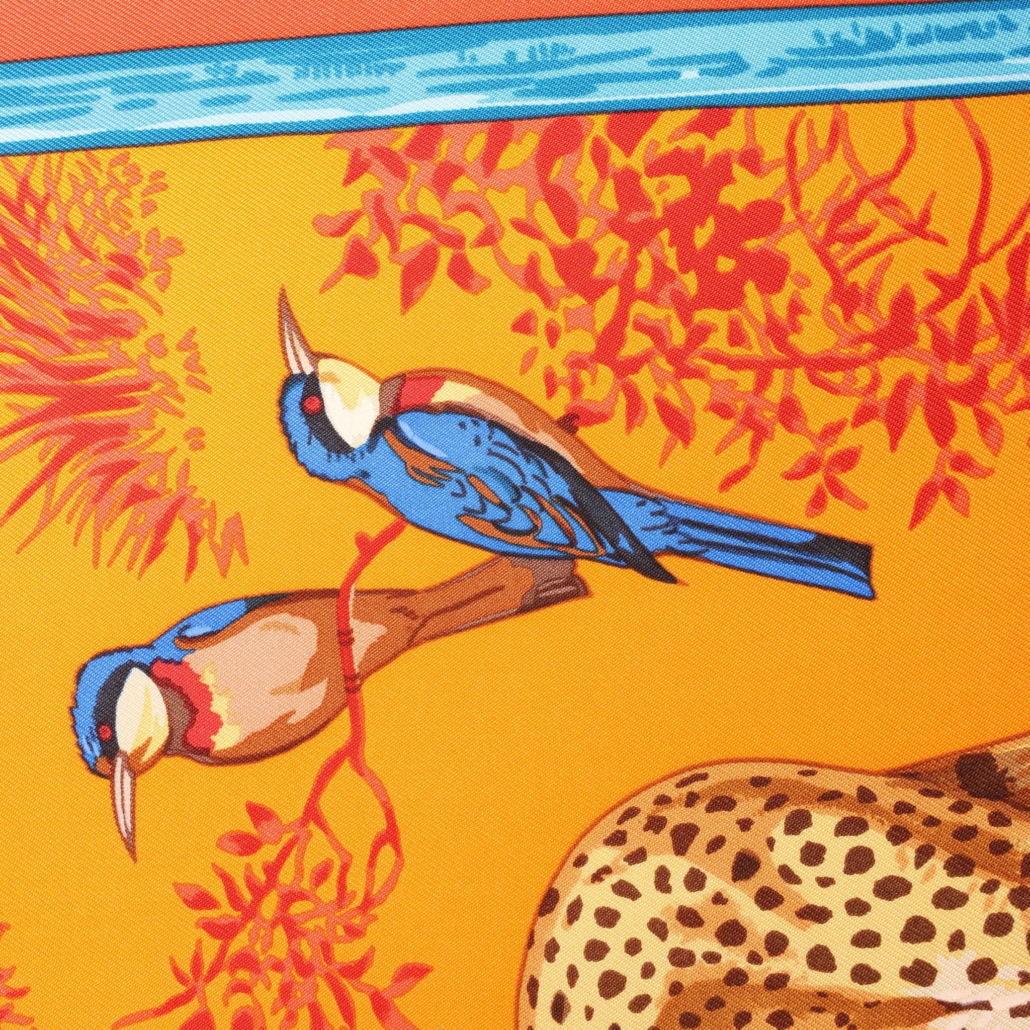 The Hermès Carré 90 "Tendresse Feline" in orange captures the wild charm of the animal kingdom. Crafted from luxurious silk, this vibrant scarf features playful big cats, birds, and jungle scenes—perfect for adding a bold and exotic touch to your look.