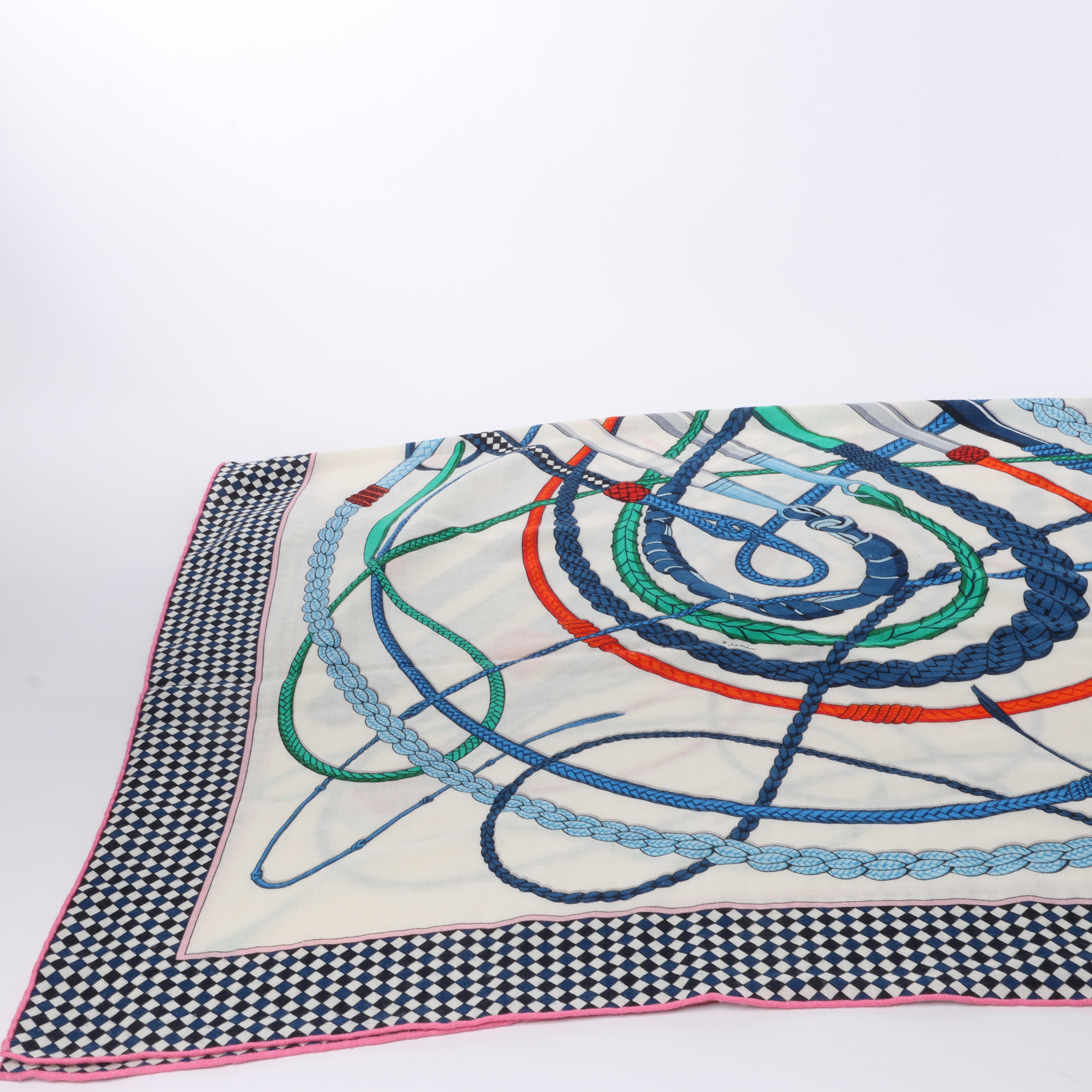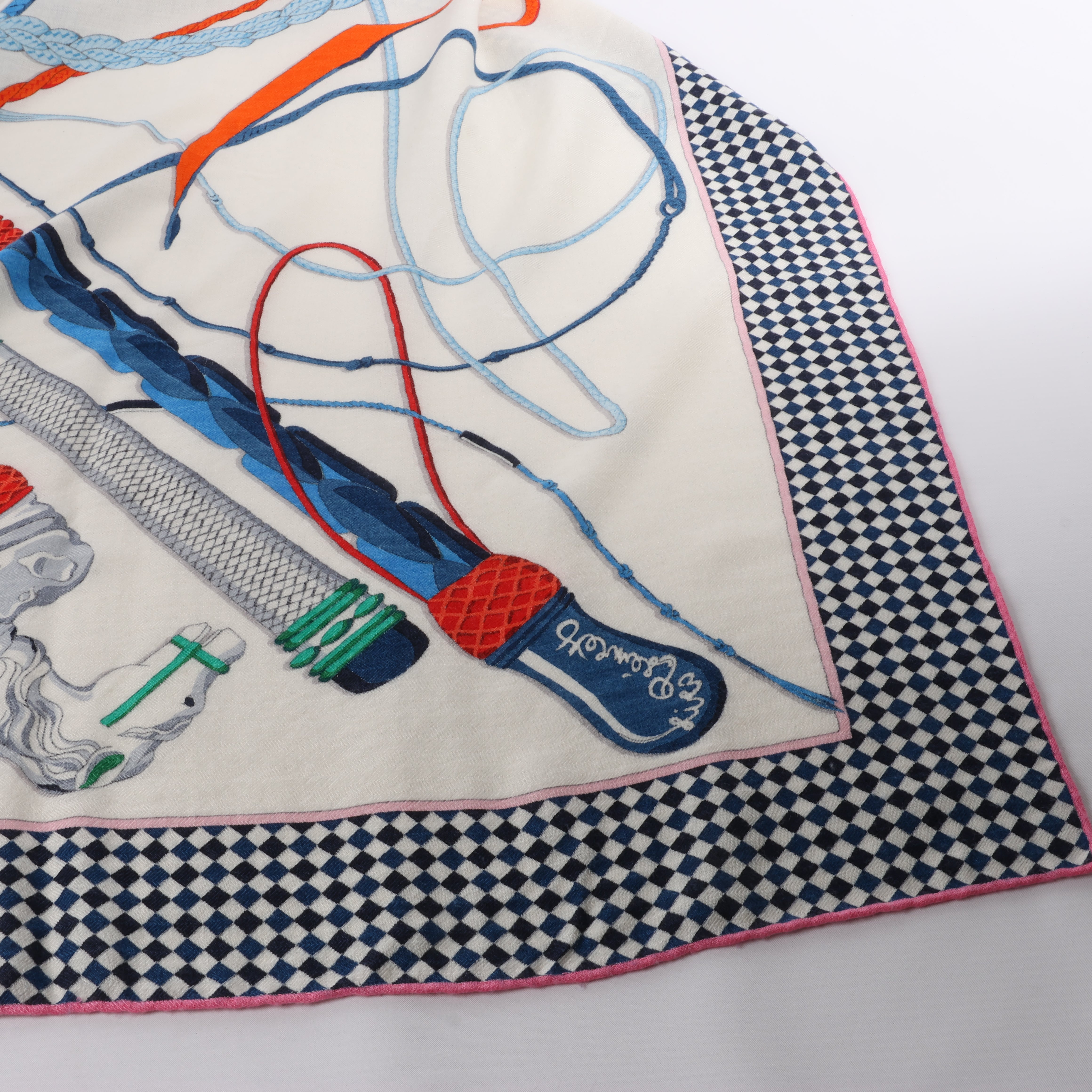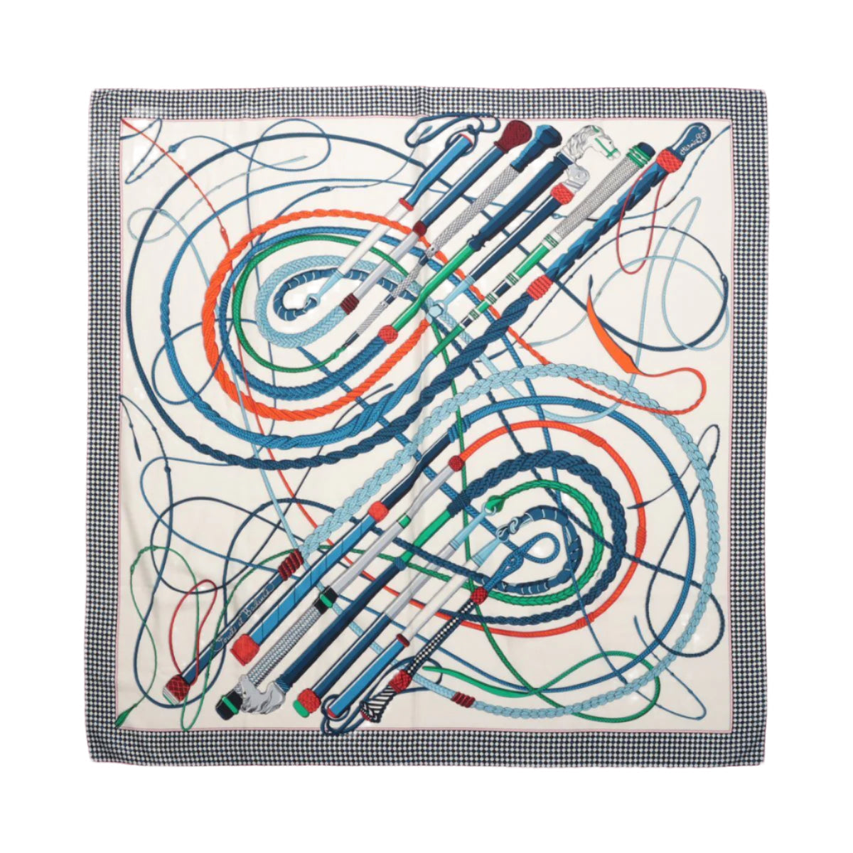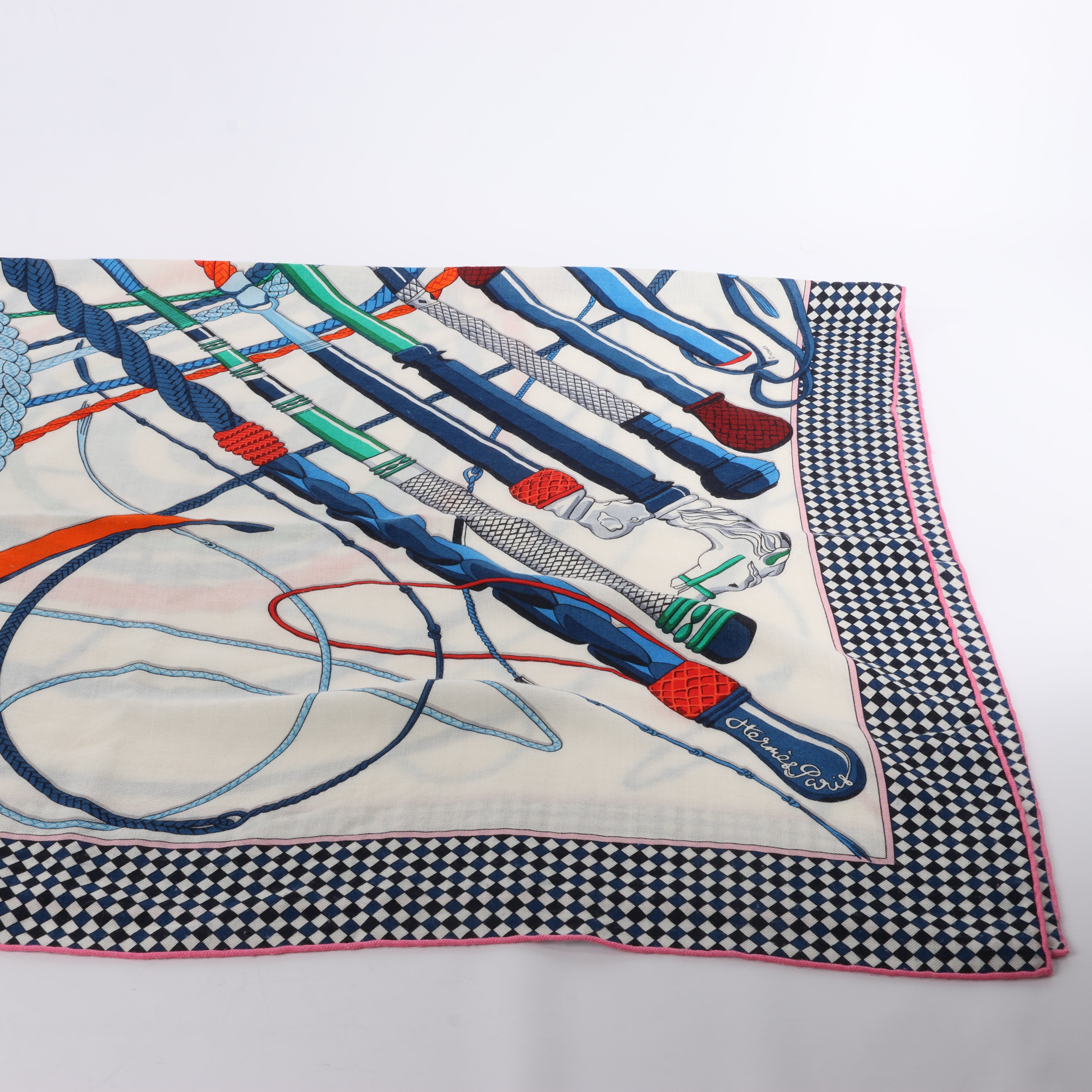 Hermès Carré Geant "Fouets et Badines" scarf in a bold multicolor palette. Crafted in luxurious cashmere and silk, it features dynamic whip and riding crop motifs—an elegant statement for collectors and style connoisseurs alike.