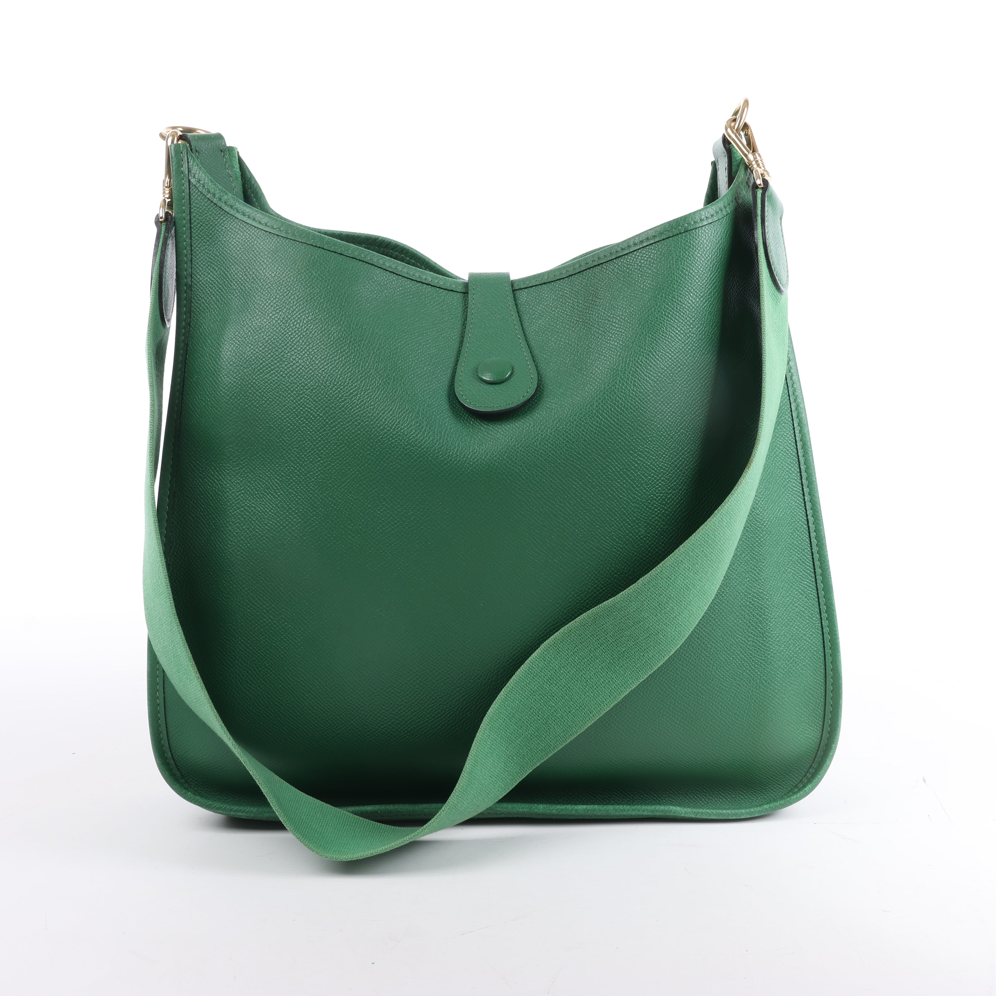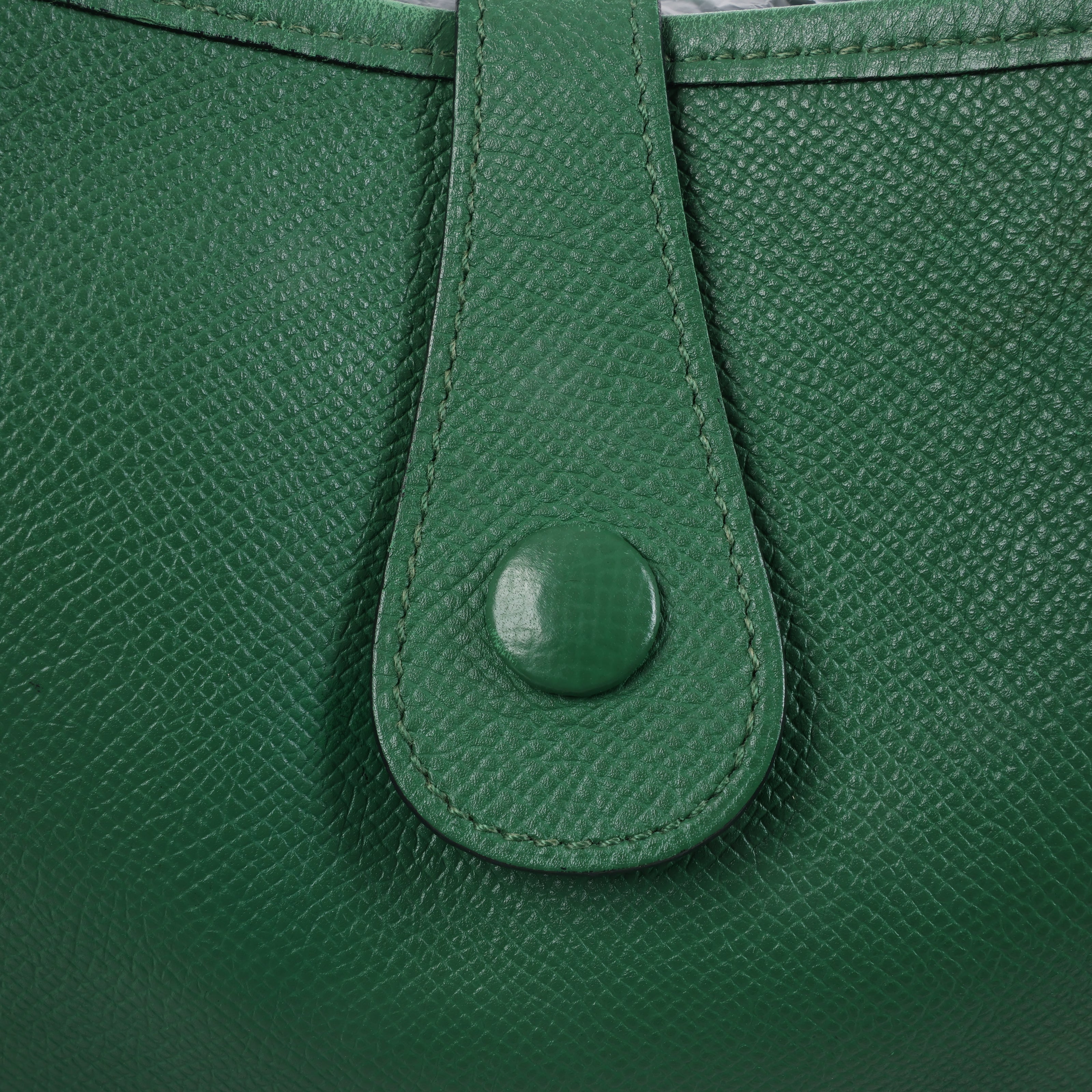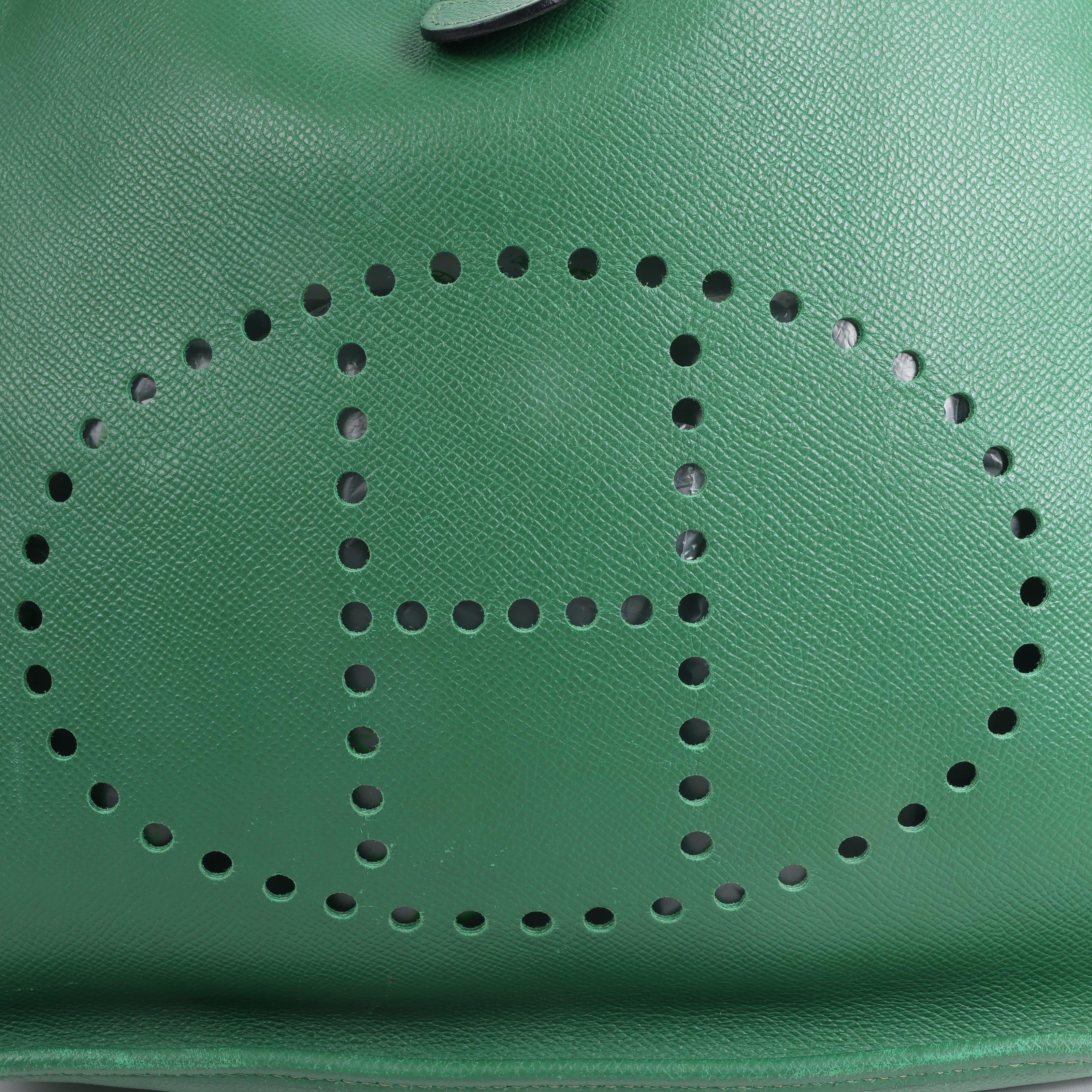 Brand: HERMES Model: EvelyneSize: GM Width: 30 cm Height: 30 cmExterior Condition: Very GoodInterior Condition: ExcellentCondition Details: The exterior leather is clean and in good condition with some light rubbing here and there. The shoulder strap is clean and in excellent condition. Hardware remains shiny and crisp. The interior is remains very good condition with some light signs of use.Colour: GreenInterior Colour: GreenHardware Colour: SilverMaterial: LeatherComes With: shoulder strap, Entrupy certificate