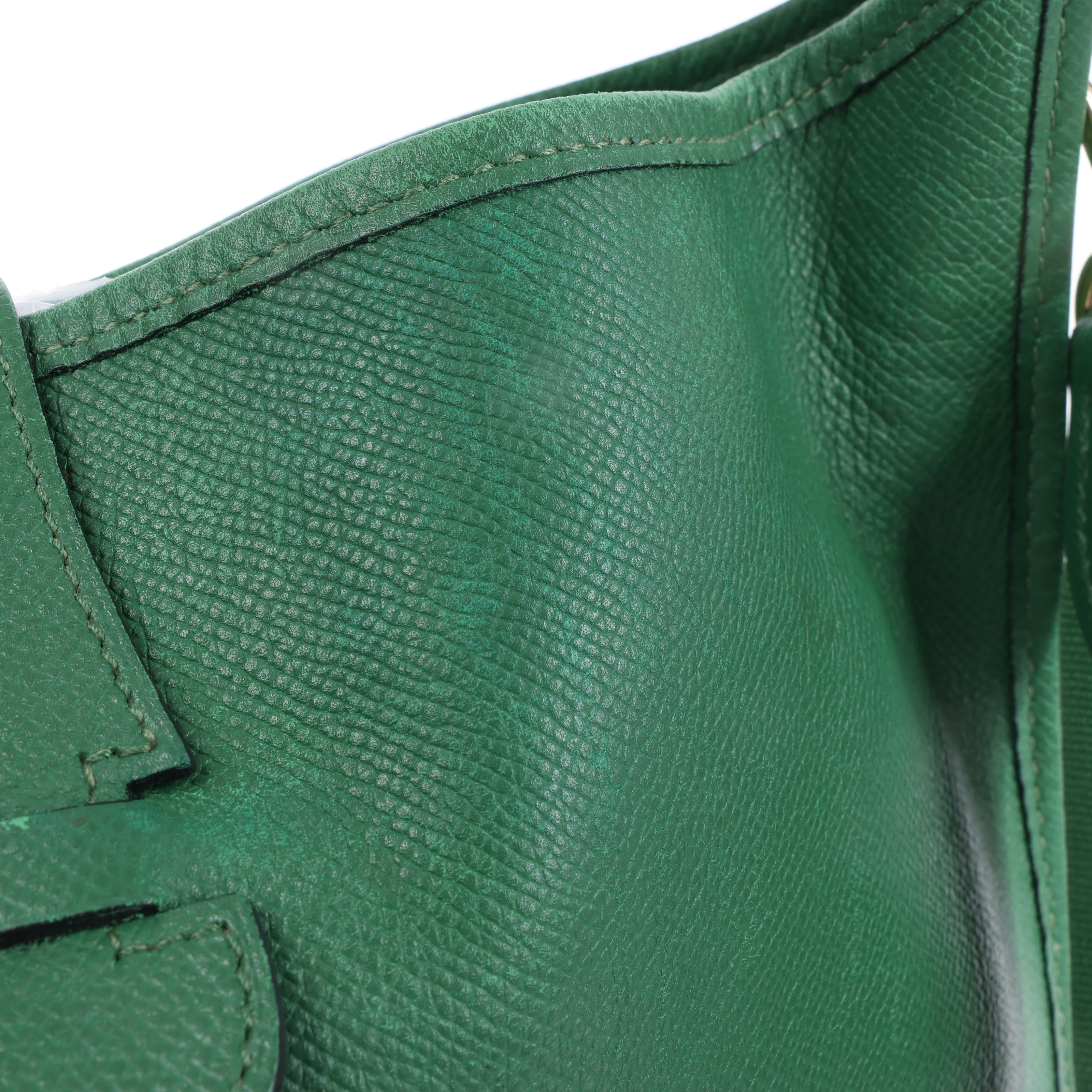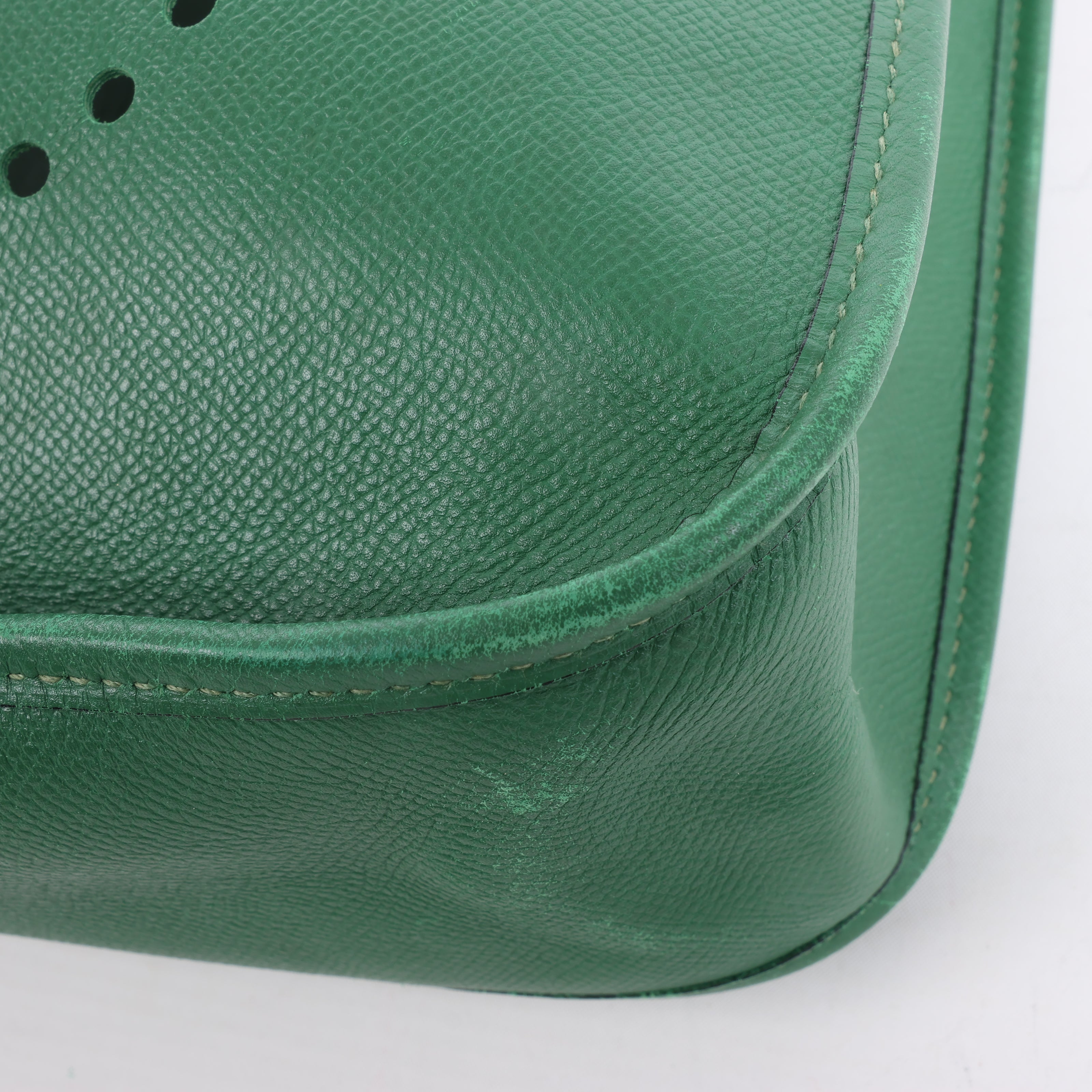 Hermès Evelyne I 33 GM in vibrant green cushbell leather, B: 1998. Features signature perforated “H”, adjustable strap, and silver-tone hardware—casual luxury with iconic flair.