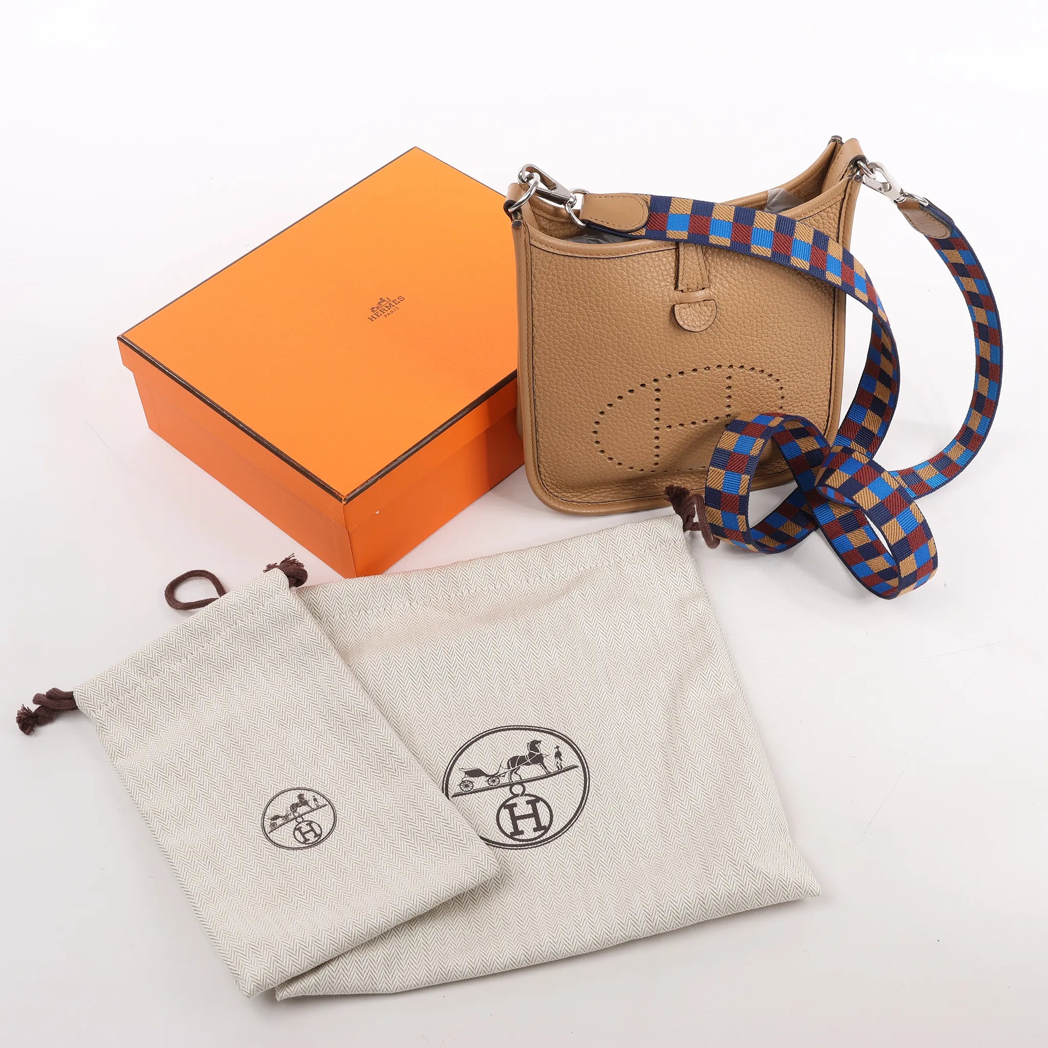 The Hermès Evelyne TPM in Taurillon Clemence leather blends timeless elegance with casual flair. This Chai-hued 2022 edition features the iconic perforated "H" and a bold Maxi Quadrille strap—perfect for hands-free luxury with a pop of color.
