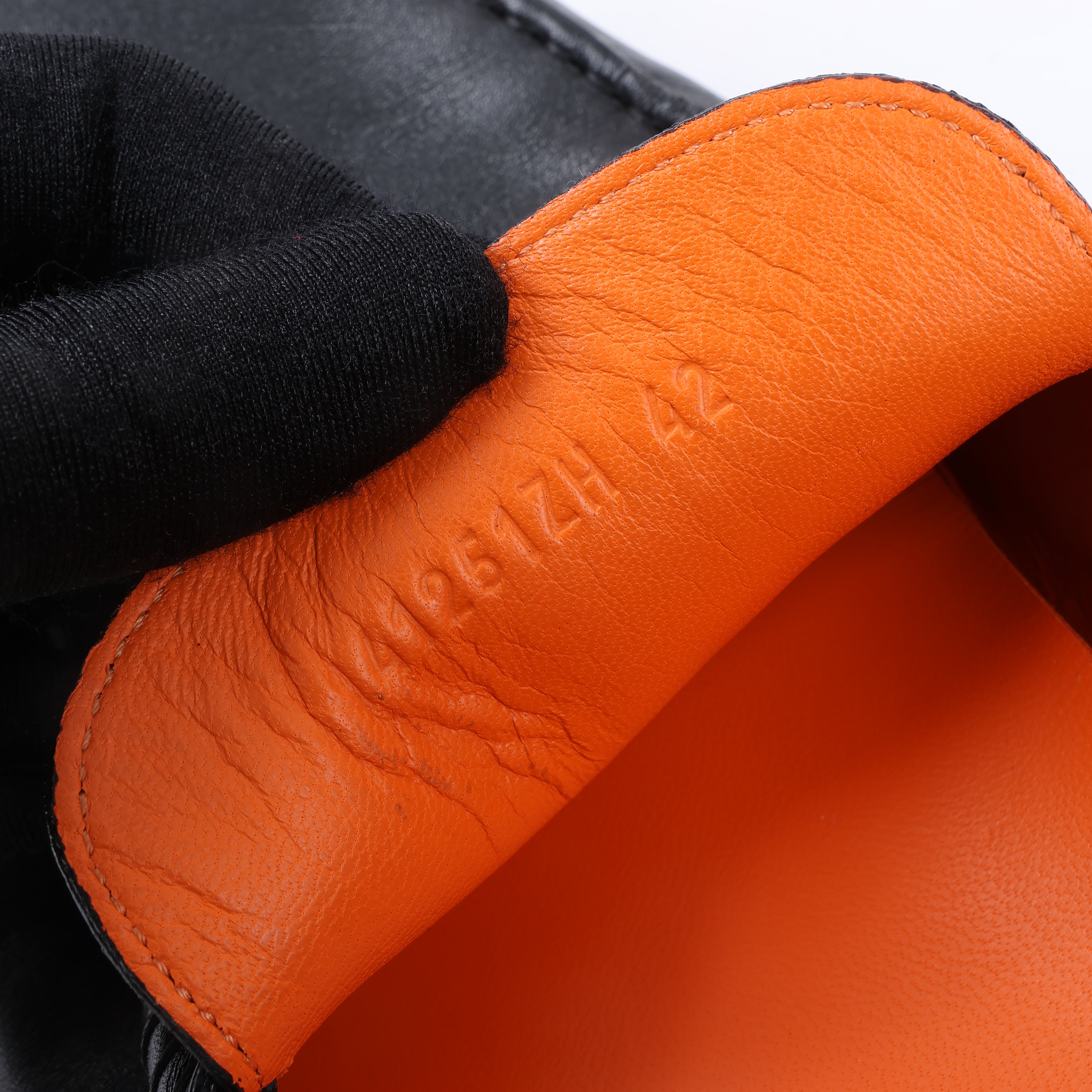 Brand: HERMESSize: EU 42Condition: ExcellentCondition Details: Has some signs of use on outsole, also has light crease on leatherMain Colour: BlackColours: Orange, SilverMain material: LeatherMaterials: -Product Code: -Manufactured In: ItalyComes With: -