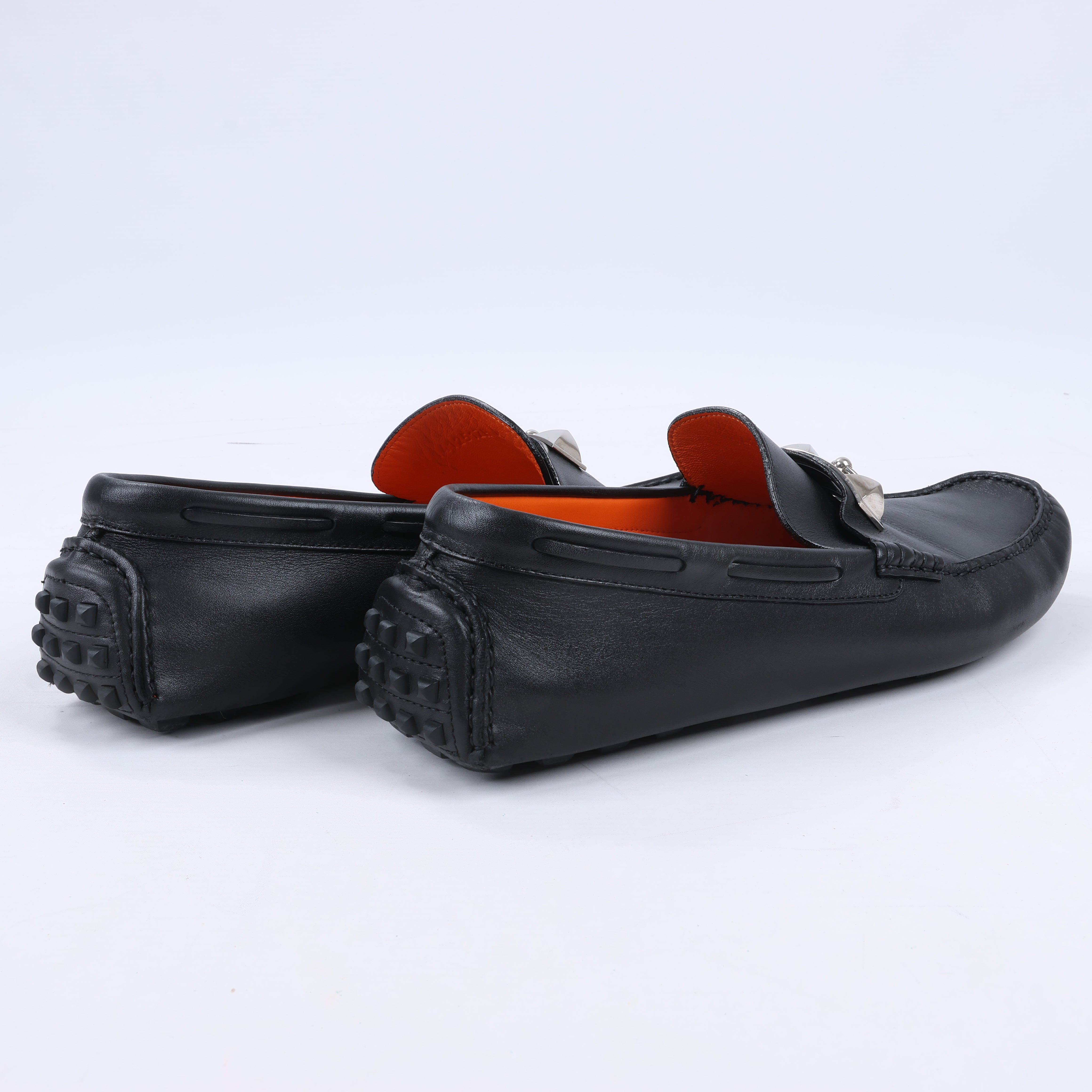 Drive in style with these Hermès Irving moccasins in size 42 EU. Crafted from luxurious black leather, they feature the iconic Collier de Chien silver hardware and a vibrant orange interior. Perfect for effortless sophistication and refined comfort on the go.