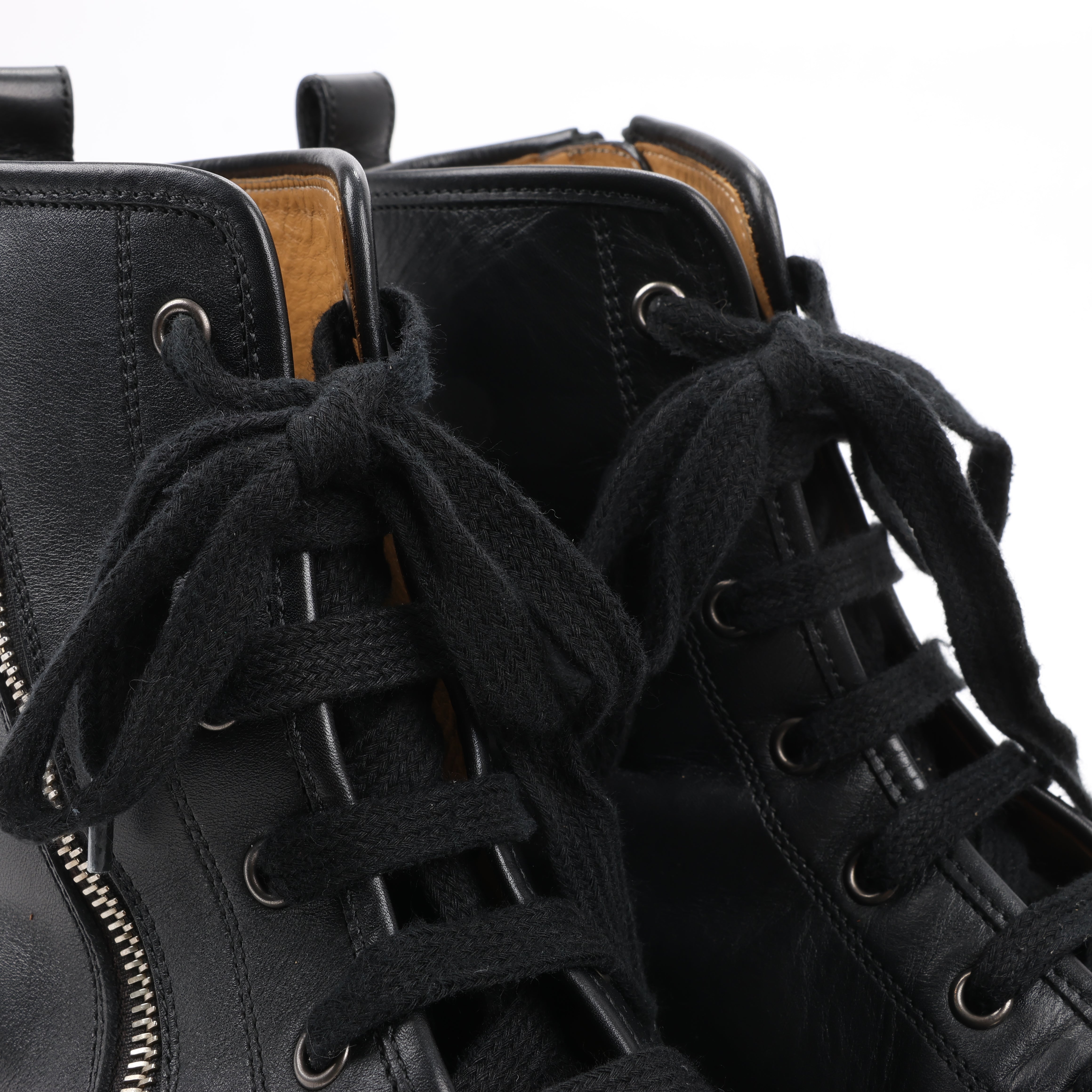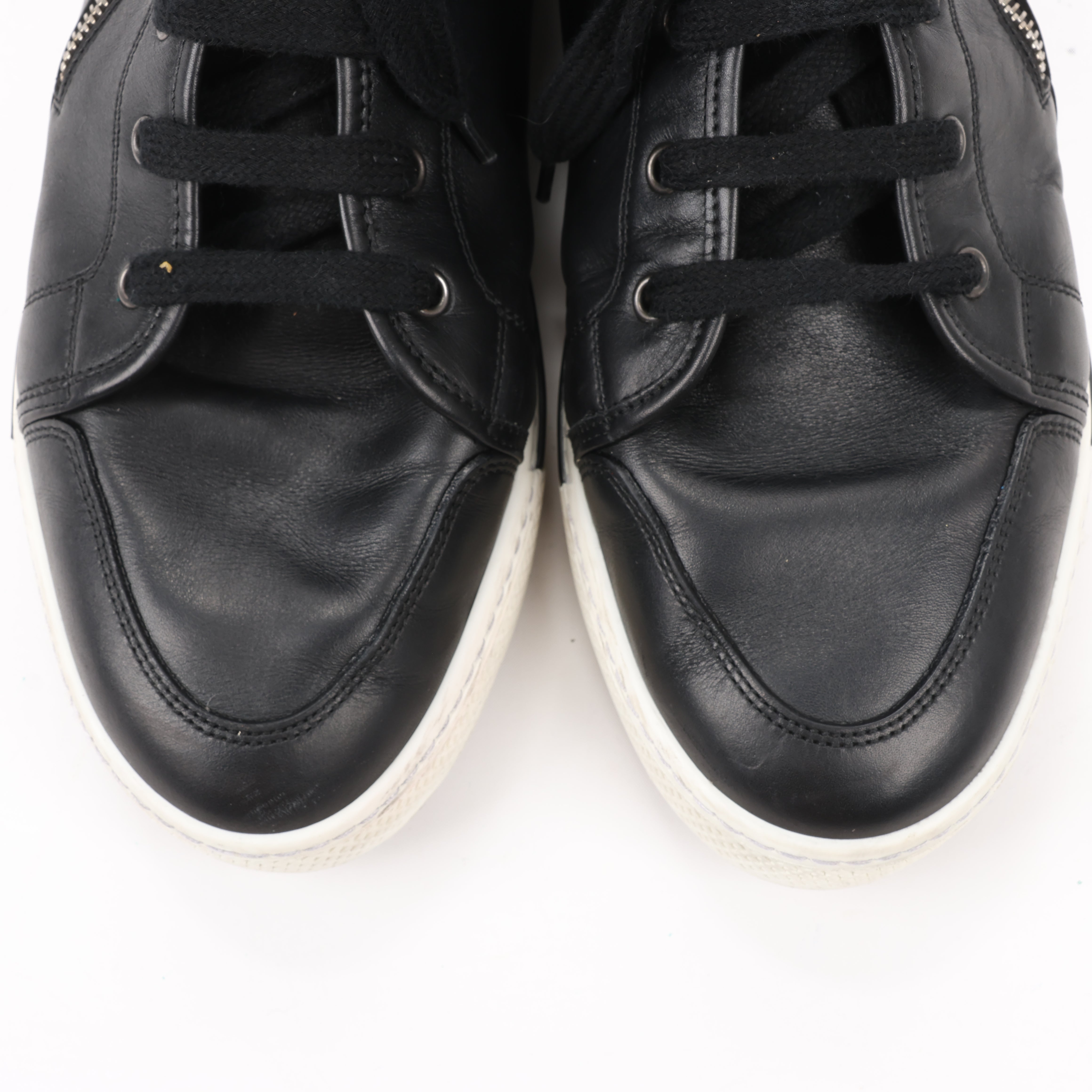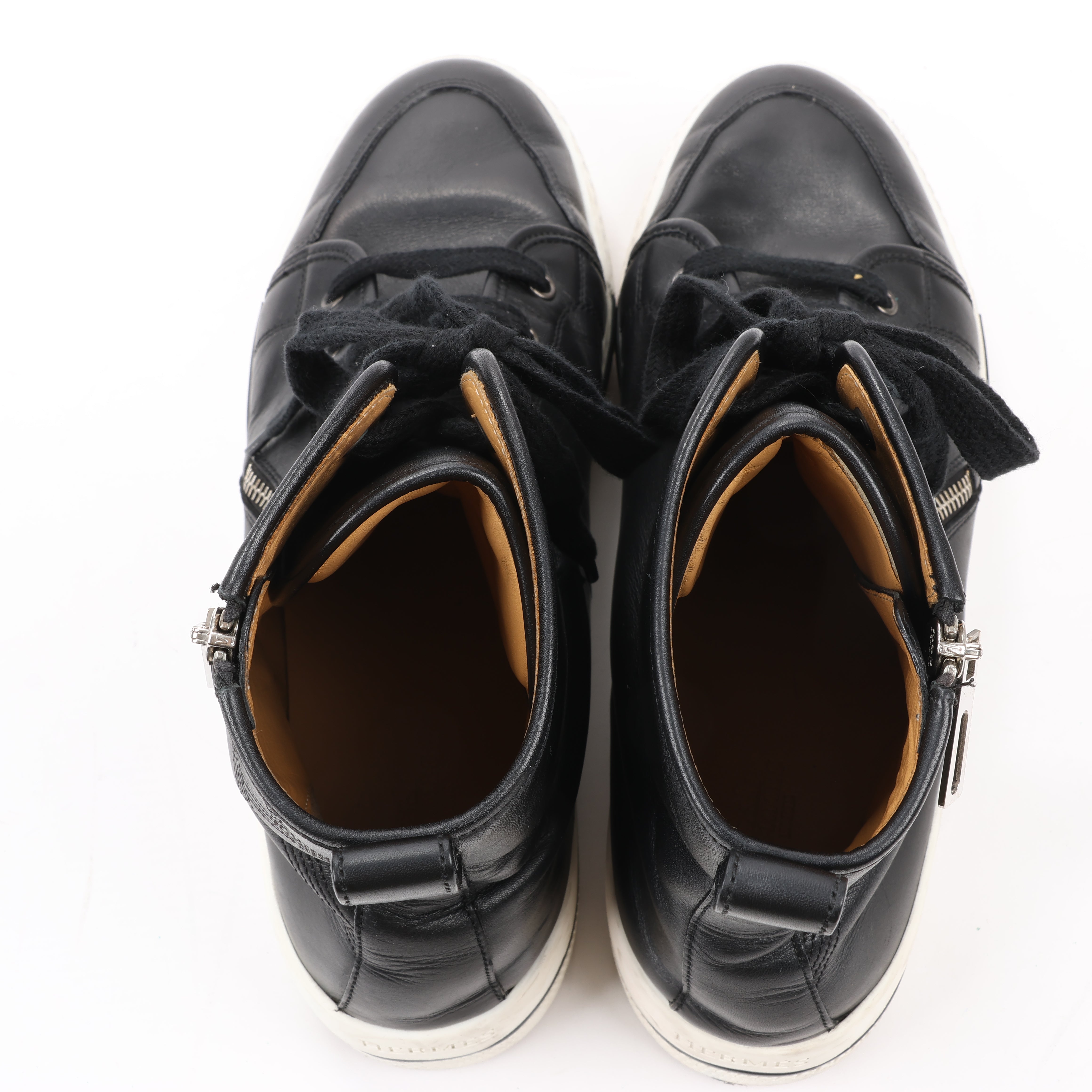 The Hermès Leather High-Top Side Zip Sneakers in Black, size 42 EU, feature premium leather, lace-up fronts, side zippers for easy wear, and a sturdy white rubber sole. A blend of luxury and street style for a sophisticated, casual look.