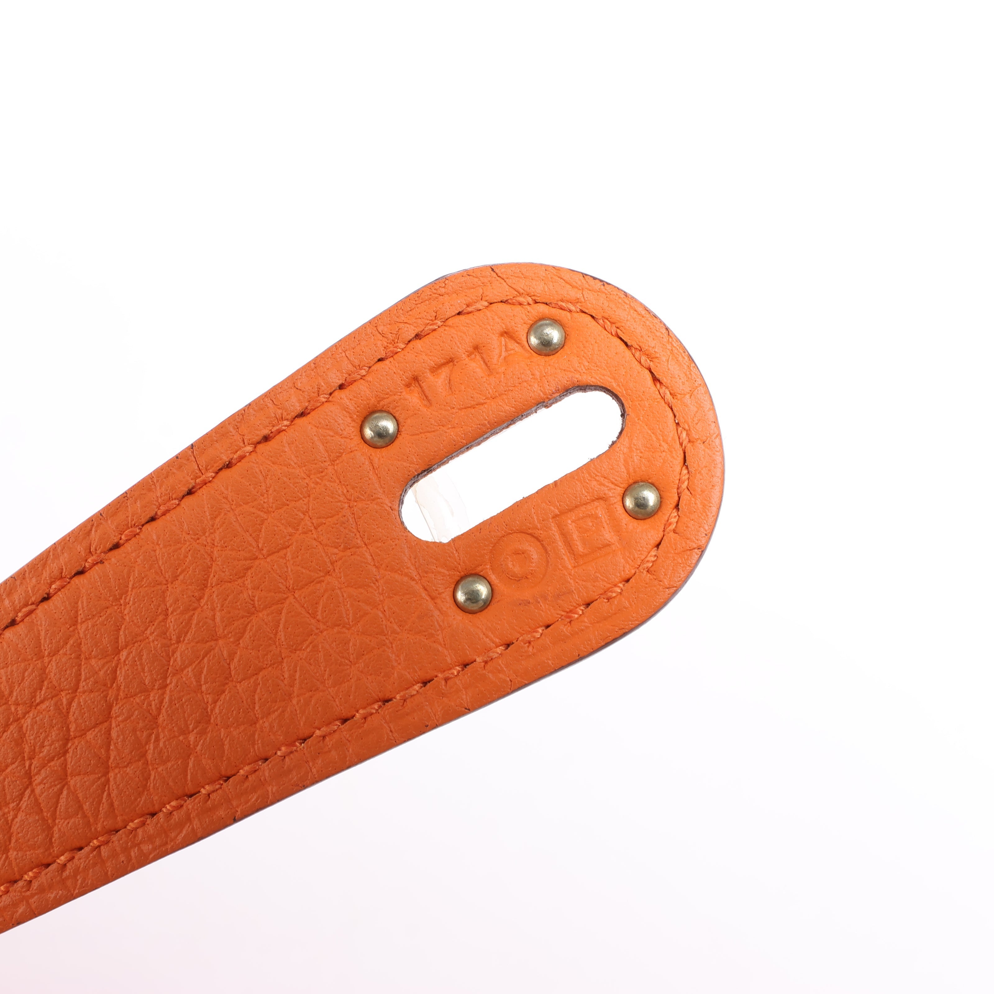 Hermès Lindy 34 in Taurillon Clemence leather in iconic orange with silver hardware. This 2012 (□P) design fuses relaxed structure and luxury, featuring double zip closure, turn-lock, and dual handles for chic versatility.